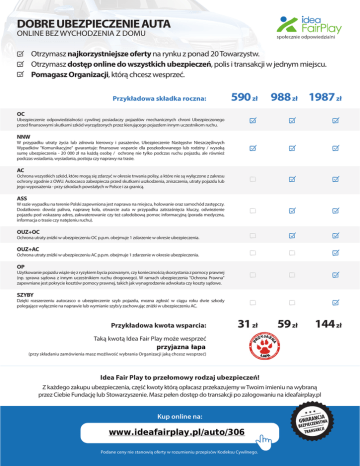 DOBRE UBEZPIECZENIE AUTA ONLINE BEZ WYCHODZENIA Z DOMU Otrzymasz najkorzystniejsze oferty na rynku z ponad 20 Towarzystw. Otrzymasz dostęp online do wszystkich ubezpieczeń, polis i transakcji w jednym miejscu. Pomagasz Organizacji, którą chcesz wesprzeć. Przykładowa składka roczna: 590 zł 988 zł 1987 zł OC Ubezpieczenie odpowiedzialności cywilnej posiadaczy pojazdów mechanicznych chroni Ubezpieczonego przed finansowymi skutkami szkód wyrządzonych przez kierującego pojazdem innym uczestnikom ruchu. NNW W przypadku utraty życia lub zdrowia kierowcy i pasażerów, Ubezpieczenie Następstw Nieszczęśliwych Wypadków "Komunikacyjne" gwarantuje: finansowe wsparcie dla poszkodowanego lub rodziny / wysoką sumę ubezpieczenia - 20 000 zł na każdą osobę / ochronę nie tylko podczas ruchu pojazdu, ale również podczas wsiadania, wysiadania, postoju czy naprawy na trasie. AC Ochrona wszystkich szkód, które mogą się zdarzyć w okresie trwania polisy, a które nie są wyłączone z zakresu ochrony zgodnie z OWU. Autocasco zabezpiecza przed skutkami uszkodzenia, zniszczenia, utraty pojazdu lub jego wyposażenia - przy szkodach powstałych w Polsce i za granicą. ASS W razie wypadku na terenie Polski zapewniona jest naprawa na miejscu, holowanie oraz samochód zastępczy. Dodatkowo: dowóz paliwa, naprawę koła, otwarcie auta w przypadku zatrzaśnięcia kluczy, odwiezienie pojazdu pod wskazany adres, zakwaterowanie czy też całodobową pomoc informacyjną (porada medyczna, informacja o trasie czy natężeniu ruchu). OUZ+OC Ochrona utraty zniżki w ubezpieczeniu OC p.p.m. obejmuje 1 zdarzenie w okresie ubezpieczenia. OUZ+AC Ochrona utraty zniżki w ubezpieczeniu AC p.p.m. obejmuje 1 zdarzenie w okresie ubezpieczenia. OP Użytkowanie pojazdu wiąże się z ryzykiem bycia pozwanym, czy koniecznością skorzystania z pomocy prawnej (np. sprawa sądowa z innym uczestnikiem ruchu drogowego). W ramach ubezpieczenia "Ochrona Prawna" zapewniane jest pokrycie kosztów pomocy prawnej, takich jak wynagrodzenie adwokata czy koszty sądowe. SZYBY Dzięki rozszerzeniu autocasco o ubezpieczenie szyb pojazdu, mozna zgłosić w ciągu roku dwie szkody polegające wyłącznie na naprawie lub wymianie szyb/y zachowując zniżki w ubezpieczeniu AC. Przykładowa kwota wsparcia: 31 zł 59 zł 144 zł Taką kwotą Idea Fair Play może wesprzeć przyjazna łapa (przy składaniu zamówienia masz możliwość wybrania Organizacji jaką chcesz wesprzeć) Idea Fair Play to przełomowy rodzaj ubezpieczeń! Z każdego zakupu ubezpieczenia, część kwoty którą opłacasz przekazujemy w Twoim imieniu na wybraną przez Ciebie Fundację lub Stowarzyszenie. Masz pełen dostęp do transakcji po zalogowaniu na ideafairplay.pl Kup online na: www.ideafairplay.pl/auto/306 Podane ceny nie stanowią oferty w rozumieniu przepisów Kodeksu Cywilnego.