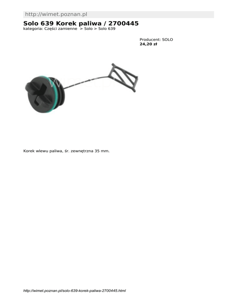 http://wimet.poznan.pl Solo 639 Korek paliwa / 2700445 kategoria: Części zamienne > Solo > Solo 639 Producent: SOLO 24,20 zł Korek wlewu paliwa, śr. zewnętrzna 35 mm. http://wimet.poznan.pl/solo-639-korek-paliwa-2700445.html