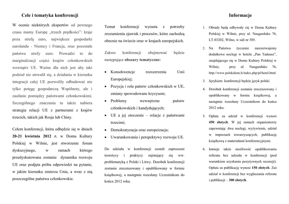 Cele i tematyka konferencji Informacje W ocenie niektórych ekspertów od pewnego Temat potrzeby 1. Obrady będą odbywały się w Domu Kultury czasu mamy Europę „trzech prędkości”: kraje zrozumienia zjawisk i procesów, które zachodzą Polskiej w Wilnie, przy ul. Naugarduko 76, poza obecnie na świecie oraz w krajach europejskich. LT-03202, Wilno, w sali nr 305. strefą euro, największe gospodarki konferencji wyrasta z eurolandu - Niemcy i Francja, oraz pozostałe państwa strefy euro. Prowadzi to do marginalizacji części krajów członkowskich wewnątrz UE. Ważne dla nich jest aby taki podział nie utrwalił się, a działania w kierunku integracji całej UE pozwoliły odbudować nie tylko potęgę gospodarczą Wspólnoty, ale i zaufanie pomiędzy państwami członkowskimi. Szczególnego znaczenia tu także nabiera 2. Zakres obejmować będzie następujące obszary tematyczne:  Konsekwencje rozszerzenia Unii Europejskiej;  Pozycja i rola państw członkowskich w UE, zmiany spowodowane kryzysem;  wewnętrzne Problemy państw UE a jej otoczenie – relacje z państwami Polskiej w Wilnie, jest stworzenie forum w jakim kierunku zmierza Unia, a wraz z nią poszczególne państwa członkowskie. 76, http://www.polskidom.lt/index.php/pl/hotel.html 4. Dorobek konferencji zostanie zrecenzowany i w formie książkowej, a następnie rozesłany Uczestnikom do końca 5. Opłata za udział w konferencji wynosi zapewniają: dwa noclegi, wyżywienie, udział Uwarunkowania i perspektywy rozwoju UE. UE oraz podjęta próba odpowiedzi na pytanie, Naugarduko 450 złotych. W jej ramach organizatorzy  przedyskutowana zostanie dynamika rozwoju ul. trzecimi; 20-21 kwietnia 2012 r. w Domu Kultury którego przy 2012 roku. Demokratyzacja oraz europeizacja; ramach zarezerwujemy dodatkowe noclegi w hotelu „Pan Tadeusz”, opublikowany członkowskich i kandydujących;  życzenie 3. Językiem konferencji będzie język polski.  w Państwa znajdującego się w Domu Kultury Polskiej w Celem konferencji, która odbędzie się w dniach dyskusyjnego, Na Wilnie, strategia relacji UE z partnerami z krajów trzecich, takich jak Rosja lub Chiny. konferencji Do udziału w konferencji zostali zaproszeni praktycy zajmujący się imprezach towarzyszących, publikację książkową z materiałami konferencyjnymi. 6. Istnieje także możliwość opublikowania ww. referatu bez udziału w konferencji (pod problematyką z Polski i Litwy. Dorobek konferencji warunkiem uzyskania pozytywnych recenzji). zostanie zrecenzowany i opublikowany w formie Opłata za publikację wynosi 150 złotych. Zaś książkowej, a następnie rozesłany Uczestnikom do udział w konferencji bez wygłaszania referatu końca 2012 roku. i publikacji – 300 złotych. teoretycy i w Wstępny program konferencji 19.04.2012 Przybycie uczestników, zakwaterowanie w hotelu 20.04.2012 9.00 – 12.00 Obrady 12.00 – 13.00 Przerwa obiadowa 13.00 – 16.00 Obrady 16.30 – 19.30 Zwiedzanie Wilna 20.00 – Uroczysta kolacja 21.04.2012 10.00 – 12.30 Obrady 12.30 – 13.30 Obiad 14.00 – 17.00 Zwiedzanie Trok 17.30 – Powrót do Wilna Kalendarium przygotowań 1. Nadesłanie wypełnionych kart uczestnictwa do 15.03.2012. Kartę można pobrać na stronie internetowej konferencji: http://www.uwb.lt/konferencja2012 2. Opłatę konferencyjną lub za publikację należy przelać do 18.03.2012 na konto bankowe podane na formularzu karty uczestnictwa 3. Nadesłanie tematu referatu oraz abstraktu tekstu (na ok. pół strony, czcionka Times New Roman, 12-ka), który zostanie wygłoszony na konferencji w wersji elektronicznej do 15.03.2012 4. Wysłanie Uczestnikom zaproszeń z programem konferencji do 1.04.2012 5. Nadsyłanie referatów 15.07.2012. do druku do Komitet Organizacyjny Przewodnicząca dr Alina Grynia Prodziekan Filii UwB w Wilnie Sekretarz mgr Regina Klukowska Tel. : +370 5 2766710 Tel./fax: +370 5 2766739 Adres do korespondencji: [email protected] ZAPROSZENIE Filia w Wilnie Uniwersytetu w Białymstoku Wydział Ekonomiczno - Informatyczny ma zaszczyt zaprosić na Międzynarodową Konferencję pod tytułem UNIA EUROPEJSKA PO ROZSZERZENIU: SZANSE I BARIERY ROZWOJU która odbędzie się w dniach 20 – 21 kwietnia 2012 r. w WILNIE