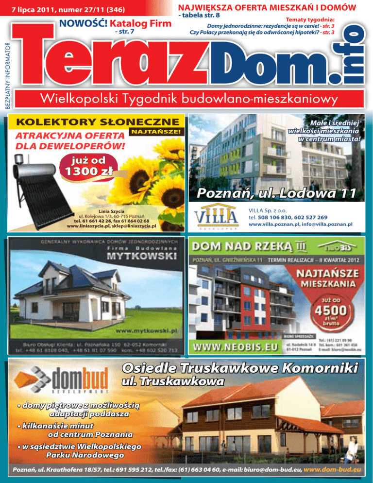 7 lipca 2011, numer 27/11 (346) NOWOŚĆ! Katalog Firm NAJWIĘKSZA OFERTA MIESZKAŃ I DOMÓW - tabela str. 8 BEZPŁATNY INFORMATOR - str. 7 Tematy tygodnia: Domy jednorodzinne: rezydencje są w cenie! - str. 3 Czy Polacy przekonają się do odwróconej hipoteki? - str. 3 KOLEKTORY SŁONECZNE NAJTAŃSZE! ATRAKCYJNA OFERTA DLA DEWELOPERÓW! już od Małe i średniej wielkości mieszkania w centrum miasta! 1300 zł Poznań, ul. Lodowa 11 Linia Szycia ul. Kolejowa 1/3, 60-715 Poznań tel. 61 661 42 26, fax 61 864 02 68 www.liniaszycia.pl, [email protected] VILLA Sp. z o.o. tel. 508 106 830, 602 527 269 www.villa.poznan.pl, [email protected] Osiedle Truskawkowe Komorniki Eleganckie i funkcjonalne domy w zabudowie bliźniaczej z pełnowymiarowym piętrem i możliwością adaptacji poddasza. ul. Truskawkowa Zapewnią komfort i spokój Tobie i Twojej rodzinie. • domy piętrowe z możliwością adaptacji poddasza • kilkanaście minut od centrum Poznania • w sąsiedztwie Wielkopolskiego Parku Narodowego Poznań, ul. Krauthofera 18/57, tel.: 691 595 212, tel./fax: (61) 663 04 60, e-mail: [email protected], www.dom-bud.eu Autoryzowany Partner: ERTOM P.H.U. Poznań ul. Strzeszyńska 225, tel. 061 822 18 02 e-mail: [email protected] SUPER SZYBKA OFERTA! Tylko 7 Nowoczesne systemy grzewcze i instalacyjne 61-062 Poznań, ul. Mścibora 8, tel. 61/870 92 20 do 21, infolinia 801 801 321 www.viessmann.poznan.pl [email protected] i a do dostawy drzw dni od zamówieni www.stolbud.pl Rafał Małecki Expert Drzwi Okna Drewniane i PCV 2 Poznań, ul. Leszczyńska 170 tel. 61 830 20 00 tel. kom. 505 179 588 [email protected] www.expert-stolbud.pl Powołaj się na NAS! POMPY CIEPŁA KOLEKTORY SŁONECZNE KOTŁY KONDENSACYJNE GRZEJNIKI C.O. WENTYLACJA Z REKUPERACJĄ KLIMATYZACJA ! tematy tygodnia Domy jednorodzinne: rezydencje są w cenie! Pomimo tego, że kryzys finansowy odbił wyraźne piętno na rynku mieszkaniowym w naszym kraju, to nadal nie brakuje ofert sprzedaży domów jednorodzinnych sięgających kilku, a w niektórych przypadkach nawet kilkunastu milionów złotych. W Polsce najdroższe nieruchomości mieszkalne można znaleźć głównie w okolicach Warszawy, należy tu wymienić przede wszystkim Konstancin – Jeziorną oraz Łomianki, ale także w regionach innych większych miast. Najwyższe ceny sięgają pułapu 20 mln zł, jednak w tym wypadku mamy do czynienia już raczej z rezydencjami, niż tradycyjnymi domami jednorodzinnymi. Takie budynki składają się z kilku bądź czasem nawet kilkunastu sypialni. Niemal wszystkie najdroższe rezydencje wyposażone są w siłownie, gabinety masażu, baseny z sauną oraz garaże, w których można pomieścić kilka sportowych limuzyn, a czasami nawet pomieszczenia dla służby. Dla porównania warto wspomnieć, że stawki za najdroższe wille na świecie sięgają kilkudziesięciu, a w skrajnych przypadkach nawet kilkuset milionów dolarów. Wśród lokalizacji, gdzie najłatwiej spotkać wypełnione przepychem rezydencje, prym wiedzie Monako. Wybór akurat tej lokalizacji przez światowych krezusów nie jest podyktowany jedynie warunkami pogodowymi oraz wyjątkowym krajobrazem, ale także preferencyjnymi przepisami podatkowymi, które obowiązują na terenie księstwa. Na zamieszkanie w takich warunkach mogą sobie pozwolić jednak tylko nieliczni, dlatego w tym miejscu warto sprawdzić, jak kształtują się przeciętne ceny jednorodzinnych nieruchomości mieszkaniowych w naszym kraju, tych już bardziej dostępnych dla Kowalskiego. Poniżej przedstawiono średnie stawki domów z rynku wtórnego ze względu na rodzaj zabudowy na trzech głównych rynkach mieszkaniowych w I kwartale 2011 r. gospodarce, gdzie znacznie zwiększy się wartość usług oraz towarów kierowanych do seniorów. Rozwiązaniem, które jest także odpowiedzią na obydwie wspomniane kwestie jest tzw. odwrócona hipoteka. Koncepcja ta – jak sama nazwa wskazuje, oparta na zasadzie odwrotnej do kredytu hipotecznego – skierowana jest właśnie do osób starszych. W ramach umowy odwróconej hipoteki instytucja finansowa zobowiązuje się do wypłacenia określonej kwoty na rzecz drugiej strony, która w zamian zrzeka się praw do posiadanej nieruchomości po śmierci. Beneficjentami tego rozwiązania mają być głównie starsze, samotne osoby, które nie mają komu zostawić posiadanego mieszkania czy domu. Rozwiązanie to jest jednak skierowane również do małżonków. Co ważne, w tym drugim wypadku instytucja finansowa będzie nabywała prawo własności do nieruchomości dopiero po śmierci ich obojga. Seniorzy wybierając takie wyjście będą mogli z jednej strony uzyskać dodatkowe źródło dochodu, a poza tym mieć zagwarantowaną możliwość dożywotniego mieszkania w dotychczasowym miejscu. Może być to interesujące rozwiązanie zwłaszcza dla osób, które często spędziły w swojej nieruchomości większą cześć życia i nie chcą się z nią rozstawać. Same wypłaty mogą przybierać różne formy – np. regularnych comiesięcznych rat lub jednorazowej płatności całej sumy. Trzeba jednak zaznaczyć, że wysokość otrzymanego świadczenia jest zależna od wartości samej nieruchomości, ale także wieku osoby/osób. Średnia długość życia kobiet jest wyższa, w związku z czym mogą one spodziewać się niższych wypłat, niż ma to miejsce w przypadku mężczyzn. Sama idea wydaje się jak najbardziej pożądana – wiele starszych osób posiada często nieruchomości w atrakcyjnych miejskich lokalizacjach, które mogą przedstawiać wysoką wartość. Dzięki odwróconej hipotece mogą one skorzystać z tej sytuacji i polepszyć warunki bytowe, będąc już na emeryturze. Ma to duże znaczenie zwłaszcza w okresie, kiedy znacznie wzrastają wydatki na opiekę medyczną R Ogólnie rzecz biorąc najdrożej jest w Warszawie, ceny w pozostałych dwóch miastach są już wyraźnie niższe. W ciągu pierwszych trzech miesięcy bieżącego roku najwi