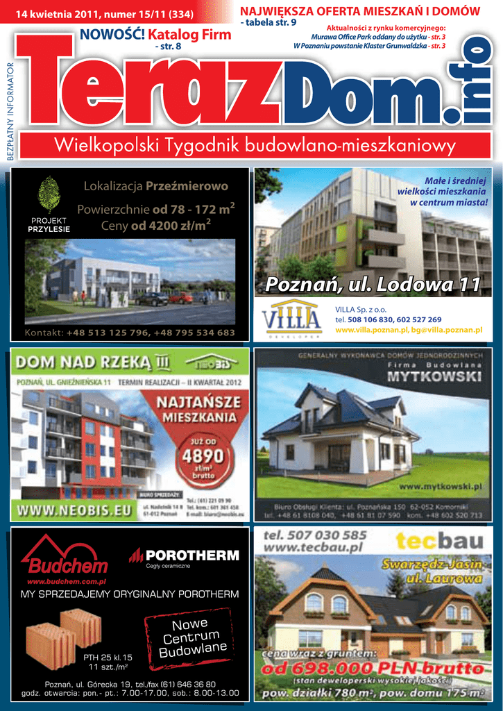 14 kwietnia 2011, numer 15/11 (334) NOWOŚĆ! Katalog Firm - tabela str. 9 Aktualności z rynku komercyjnego: Murawa Office Park oddany do użytku - str. 3 W Poznaniu powstanie Klaster Grunwaldzka - str. 3 BEZPŁATNY INFORMATOR - str. 8 NAJWIĘKSZA OFERTA MIESZKAŃ I DOMÓW Lokalizacja Przeźmierowo Powierzchnie od 78 - 172 m2 Ceny od 4200 zł/m2 Małe i średniej wielkości mieszkania w centrum miasta! Poznań, ul. Lodowa 11 Kontakt: +48 513 125 796, +48 795 534 683 MY SPRZEDAJEMY ORYGINALNY POROTHERM PTH 25 kl.15 11 szt./m2 Nowe Centrume n Budowla Poznań, ul. Górecka 19, tel./fax (61) 646 36 80 godz. otwarcia: pon.- pt.: 7.00-17.00, sob.: 8.00-13.00 VILLA Sp. z o.o. tel. 508 106 830, 602 527 269 www.villa.poznan.pl, [email protected] Nowa inwestycja w centrum Swarzędza przy ul. Grudzińskiego 7 Biuro sprzedaży: ul. Winogrady 133/2 61-642 Poznań tel. 61 829 02 00 61 624 23 13/14 [email protected] od 4.799 brutto/m2 www.kalbud.com.pl dom o jakim MARZYSZ wysoki standard wykończenia, atrakcyjne lokalizacje, pomoc w otrzymaniu kredytu, możliwość wykonania prac w ramach opcji dodatkowych, termin realizacji inwestycji rok 2011/2012 KORAL - Mieszkania ul. Czeremchowa w Poznaniu Cena od 4000zł netto/m2 PERŁA - Mieszkania ul. Kosińskiego w Poznaniu Cena od 4200zł netto/m2 OSIEDLE LEŚNE IV W CZAPURACH Mieszkania z ogrodem i garażem Cena od 2770zł netto/m2 WWW.FAMILYHOUSE.PL [email protected] FAMILY HOUSE Sp. z o.o. 61-888 Poznań, ul. Półwiejska 28/5 tel. 61 853-41-00 kom. 503 038 578 schody • więźba dachowa • tarcica mokra lub sucha • kantówki klejone • boazeria podbitkowa • drewnianealtany ogrodowe Komorniki - Dział sprzedaży ul. Jeziorna 4 62-052 Komorniki k. Poznania (Obok Green Hotel) tel. 609 047 060, 695 393 337 DOM W CENIE MIESZKANIA! DOM DO ZAMIESZKANIA - WIOSNA 2011 r. róg Oświęcimska/Żeglarska cena: 4100 zł brutto z gruntem Szczytniki k. Poznania cena: od 3900 zł brutto z gruntem ul. Owocowa 3B, 61-306 Poznań, tel. 61 88 76 022, kom. 506 670 786, www.paulbud.pl 2 Powołaj się na NAS! www.nature-schody.pl tel. 609 047 060 ! aktualności z rynku komercyjnego Murawa Office Park oddany do użytku Dobiegła końca budowa biurowca Murawa Office Park na poznańskich Winogradach. Inwestor Alco Investments uzyskał prawomocne pozwolenie na użytkowanie, a pierwsi najemcy są w trakcie przeprowadzek. Budynek oferuje ponad 4000 m kw. nowoczesnej powierzchni biurowej klasy A. Przeprowadzkę do Murawa Office Park rozpoczęły już dwie firmy: Coris Lex Services, świadcząca usługi z zakresu assistance oraz likwidacji szkód dla zakładów ubezpieczeń oraz Cognifide, firma z branży IT dostarczająca oprogramowanie dla firm w całej Europie. Prezes Cognifide, Miro Walker, tak wypowiada się o nowym biurze: – Nowa siedziba Cognifide w Murawa Office Park łączy znakomite warunki techniczne budynku, fantastyczną lokalizację oraz nowatorską aranżację wnętrz. Rozwijamy się szybko, obsługujemy kilka z najznakomitszych marek światowych. Potrzebujemy przestrzeni, która przyciągnie i zatrzyma najlepszych w Poznaniu ekspertów technicznych i zapewni im świetne, nowoczesne, a jednocześnie przyjazne środowisko pracy. Jesteśmy bardzo podekscytowani przeprowadzką do nowego biura. Kolejni najemcy wprowadzą się do budynku w maju. Obecny stan wynajętych powierzchni w biurowcu wynosi prawie 60 proc. Nadal dostępne jest ok. 1700 m kw. dostosowane dla różnego typu najemców: mniejszych, zajmujących 100-200 m kw., jak i chcących wynająć np. cały budynek o powierzchni ok. 800 m kw. Murawa Office Park to budynek „inteligentny”, posiadający w pełni zintegrowane wszystkie funkcje w ramach rozbudowanego systemu zarządzania BMS (Building Management System). Zaawansowany system klimatyzacji i wentylacji pomieszczeń pozwala na regulację poziomu wilgotności i lokalne sterowanie temperaturą w każdym pomieszczeniu. Podłogi techniczne i podwieszane sufity pozwalają na ukrycie całego okablowania i zwiększenie efektywności powierzchni biurowej. Powierzchnie biurowe o wysokości 3 m są doskonale doświetlone zarówno od strony ulicy Murawa, jak i od strony przeszklonych tarasów znajdujących się na tyłach budynków. Dzięki tarasom pracownicy biurowi mogą być w stałym kontakcie z naturą i mieć dostęp do świeżego powietrza. To tylko jeden z wielu dowodów na to, że Murawa Office Park to biurowiec nie tylko nowoczesny i prestiżowy, ale również przyjazny dla użytkowników i środowiska. – W budynku stosowana jest segregacja odpadów. Proekologiczny system wentylacji budynku z odzyskiem ciepła pozwala na zmniejszenie opłat za ogrzewanie. Położenie zaledwie parę kroków od oazy zieleni, 100-hektarowego parku Cytadela, to kolejny „zielony” atut biurowca. Wykorzystają go między innymi pracownicy firmy Cognifide, dla których zaplanowaliśmy nawet podziemne miejsca postojowe dla rowerów oraz prysznice, z których korzystać będą mogli dojeżdżający do pracy rowerzyści – informuje Natalia Dworska z Aiga Investments. – Chcielibyśmy, aby Murawa Office Park stał się prekursorem wśród „zie- na żłobek, przedszkole oraz restaurację z sezonowym menu. lonych” budynków w Poznaniu i wzorem dla kolejnych inwestycji tego typu w Wielkopolsce . W Poznaniu powstanie Klaster Grunwaldzka Fundusz Garvest Real Estate wybuduje w Poznaniu nowoczesny zespół budynków biurowych – Klaster Grunwaldzka. Całkowita powierzchnia planowanej inwestycji wyniesie 50 tys. m kw. - W naszym kompleksie zastosujemy szereg rozwiązań przyjaznych środowisku – mówi Michał Włodarczyk z Garvest Real Estate. – Zaplanowaliśmy parking dla rowerów oraz specjalne prysznice dla cyklistów, w budynkach zamontujemy energooszczędne urządzenia, obowiązkowa będzie segregacja odpadów, a wnętrza zostaną wykończone wyłącznie naturalnymi i recyklingowanymi materiałami. Za projekt architektoniczny wnętrz odpowiada poznańskie biuro 