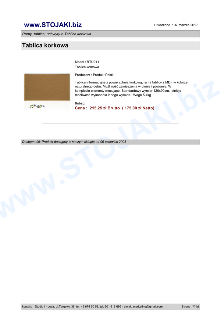 www.STOJAKI.biz Utworzono : 07 marzec 2017 Ramy, tablice, uchwyty > Tablica korkowa Tablica korkowa Model : RTU011 Tablica korkowa Producent : Produkt Polski z i .b Tablica informacyjna z powierzchnią korkową, rama tablicy z MDF w kolorze naturalnego dębu. Możliwość zawieszenia w pionie i poziomie. W komplecie elementy mocujące. Standardowy wymiar 120x90cm. Istnieje możliwość wykonania innego wymiaru. Waga 5,4kg I K Cena : 215,25 zł Brutto ( 175,00 zł Netto) O T A J Dostępność: Produkt dostępny w naszym sklepie od 09 czerwiec 2008 S . w w w kontakt : Studio1 - Lodz, ul.Targowa 36, tel. 42 674 50 53, tel. 601 616 699 - [email protected] Strona 1/{nb}