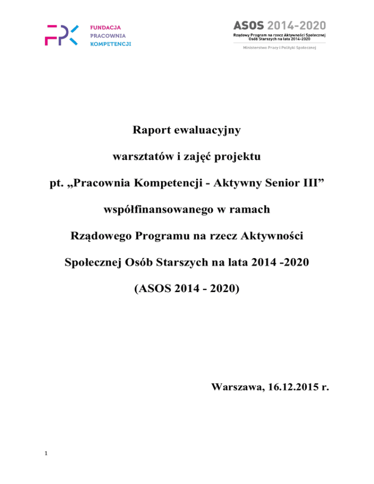 Raport ewaluacyjny warsztatów i zajęć projektu pt. „Pracownia Kompetencji - Aktywny Senior III” współfinansowanego w ramach Rządowego Programu na rzecz Aktywności Społecznej Osób Starszych na lata 2014 -2020 (ASOS 2014 - 2020) Warszawa, 16.12.2015 r. 1 1. Przedmiot i okres metaewaluacji Ewaluacja prowadzona była w okresie od 01-10-2015 r. do 31-12-2015 r. W projekcie przewidziane były następujące formy wsparcia dla niepracujących osób w wieku 60+, mieszkańców/mieszkanek Legionowa i okolic: Obowiązkowe: „po co mi Internet?” 48 godz. lekcyjnych (6 spotkania x 4 godz. lekcyjne x 2 grupy) m. in. zakładanie konta e-mail, strony internetowe dla seniorów, strony informacyjne, komunikatory jako szansa nawiązania i utrzymywania kontaktu z rodziną i znajomymi – wzięło udział 17 beneficjentów/ek; „trening pamięci” 48 godz. lekcyjnych (6 spotkania x 4 godz. lekcyjne x 2 grupy) ćwiczenia usprawniające pamięć (wyrobienie nawyku systematycznego treningu umysłu, techniki ćwiczenia pamięci, utrzymywania umysłu w dobrej kondycji intelektualnej: ćwiczenia praktyczne) – wzięło udział 17 beneficjentów/ek. Warsztaty i zajęcia odbywały się w wynajętych salach i pracowni komputerowej w budynku Fundacji Pracownia Kompetencji (ul. Piłsudskiego 3, Legionowo) i sali komputerowej Domu Dziennego Pobytu ( ul. Generała Józefa Sowińskiego 3, Legionowo). Sale w centrum miasta, z dogodnym dojazdem możliwym kilkoma środkami transportu. Łącznie przeprowadzono 96 godz. lekcyjnych warsztatów co zostało udokumentowane listami obecności uczestników/czek. Ewaluacja prowadzona była przez cały czas trwania projektu, a jej celem było zbadanie satysfakcji beneficjentów/ek z udziału w projekcie oraz zbadanie korzyści jakie odnieśli uczestnicząc w nim. Ewaluacja została przeprowadzona na podstawie badań opartych na formularzu ankietowym. Uczestnicy/czki wypełniali ankiety: ankietę satysfakcji z udziału w działaniach (dla każdego typu zajęć, czyli 2 rodzajów) ankietę ex-post: podsumowanie rezultatów projektu. W badaniach wzięli udział wszyscy beneficjenci/tki (17 osób). Niniejszy raport zawiera wnioski i rekomendacje dla przyszłych edycji projektu wynikające z przeprowadzonych badań ankietowych. 2 2. Wyniki badań ankietowych 2.1. „Trening pamięci” (17 ankiet) Pytanie Pyt. 1. „Czy dla Pani/Pana szkolenie było interesujące?” Pyt. 2. „Czy wiedza nabyta podczas szkolenia będzie dla Pani/Pana przydatna?” Pyt. 3. „Czy podobał się Pani/Panu sposób prowadzenia zajęć?” Pyt. 4. „Czy materiały szkoleniowe będą dla Pani/Pana przydatne?” Odpowiedzi pozytywne (w %) tak: 100 raczej tak: 0,00 razem: 100,00 tak: 99,00 raczej tak: 1,00 razem: 100,00 tak: 100,00 raczej tak: 0,00 razem: 100,00 tak: 97,00 raczej tak: 3,00 razem: 100,00 tak: 100,00 raczej tak: 0,00 razem: 100,00 Odpowiedzi negatywne (w %) nie: 0,00 raczej nie: 0,00 razem: 0,00 nie: 0,00 raczej nie: 0,00 razem: 0,00 nie: 0,00 raczej nie: 0,00 razem: 0,00 nie: 0,00 raczej nie: 0,00 razem: 0,00 nie: 0,00 raczej nie: 0,00 razem: 0,00 Pyt. 5. „Czy jest Pani/Pan zadowolony z organizacji szkolenia (zapisy, miejsce szkolenia)?” nie: 0,00 Pyt. 6. „Czy szkolenie spełniło tak: 98,00 raczej tak: 2,00 raczej nie: 0,0 Pani/Pana oczekiwania?” razem: 100,00 razem: 0,00 Pyt.7. miało charakter otwarty i Więcej pracy w terenie, np. rowery i miejsca pamięci brzmiało: W jakich narodowej lub pomniki przyrody szkoleniach/warsztatach chętnie by Pani/Pan wzięła/wziął udział w Bardzo chętnie wspomożenie sprawności ruchowej z przyszłym roku? Proszę wypisać poruszaniem w terenie i pamięć obrazkowa. tematykę poniżej Nadal chcę o tej samej tematyce. Nie mam pomysłu, ale skorzystam z propozycji prowadzących. Trening pamięci, dyskusje (różnorodne) Ćwiczenia orientacji w terenie Dyskusje na temat literatury, szczególnie historii Legionowa. Trening pamięci również w terenie (chodzi o ruch i orientację w terenie). Dalszy ciąg treningu pamięci, spacery z kijkami 3 Pyt. 8. miało charakter otwarty i brzmiało: „Jeśli ma Pani/Pan dodatkowe uwagi dotyczące warsztatu, proszę je wypisać poniżej:” Więcej ćwiczeń na trening pamięci Mogłyby być znaczne dłuższe Wspaniała sprawa, możliwość poznania różnych osób, bardzo ciekawych z wielkim ilorazem inteligencji. Warsztaty dla seniorów to droga, aby się rozwijać i nie być samotną osobą. Bardzo mi się podobało i jest mi to bardzo przydatne. Nie mam uwag. Spełniają moje oczekiwania i powinny trwać dłużej, czyli dłuższy cykl. Zajęcia bardzo interesujące. Zintegrowały grupę. Mogłyby trwać dłużej, stworzona miła atmosfera. Prowadząca doskonale prowadzi zajęcia - w letnich miesiącach chcielibyśmy integrować się w terenie, by poznać okolicę i jej walory. Szkolenie powinno odbywać się dłużej - 100 godzin. Było nie tylko ciekawe, ale integrujące, dające możliwość poznania nowych, ciekawych ludzi, zwrócenia uwagi na różne uwarunkowania: dobre i niekorzystne. Źródło: opracowanie własne na podstawie zebranych badań Powyższe zestawienie tabelaryczne obrazuje ilościowy oraz procentowy rozkład odpowiedzi ocen satysfakcji uczestników/czek z warsztatu. Ocena jest bardzo wysoka – w 6 pytaniach na 6, 100% uczestników/czek udzieliło odpowiedzi „tak” i „raczej tak”. Uwagi zawarte w pytaniu otwartym W otwartym pytaniu 8 odpowiedzi beneficjentów i beneficjentek często nawiązują do osoby, która prowadziła zajęcia. Respondenci/ respondentki docenili zaangażowanie trenerki, pisali np. o: ciekawym i pozytywnym prowadzeniu, wrażeniu niedosytu, przystępności i profesjonalizmie. Inne odpowiedzi wyrażały zadowolenie z udziału w zajęciach, chęć kontynuacji oraz poszerzenie tematycznego. Jedyną uwagą, która się pojawiła była kwestia zbyt małej ilości godzin. 4 „Trening pamięci” – wykresy Czy dla Pani/Pana szkolenie było interes