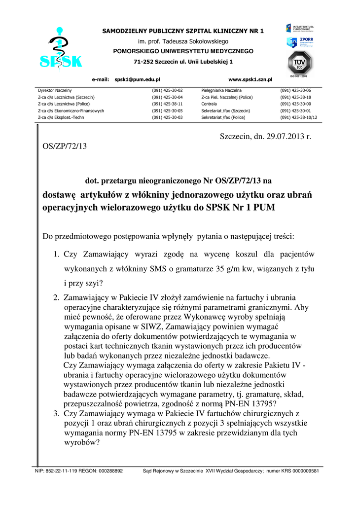 SAMODZIELNY PUBLICZNY SZPITAL KLINICZNY NR 1 im. prof. Tadeusza Sokołowskiego POMORSKIEGO UNIWERSYTETU MEDYCZNEGO 71-252 Szczecin ul. Unii Lubelskiej 1 e-mail: [email protected] www.spsk1.szn.pl Dyrektor Naczelny (091) 425-30-02 Pielęgniarka Naczelna (091) 425-30-06 Z-ca d/s Lecznictwa (Szczecin) (091) 425-30-04 Z-ca Piel. Naczelnej (Police) (091) 425-38-18 Z-ca d/s Lecznictwa (Police) (091) 425-38-11 Centrala (091) 425-30-00 Z-ca d/s Ekonomiczno-Finansowych (091) 425-30-05 Sekretariat /fax (Szczecin) (091) 425-30-01 Z-ca d/s Eksploat.-Techn (091) 425-30-03 Sekretariat /fax (Police) (091) 425-38-10/12 Szczecin, dn. 29.07.2013 r. OS/ZP/72/13 dot. przetargu nieograniczonego Nr OS/ZP/72/13 na dostawę artykułów z włókniny jednorazowego użytku oraz ubrań operacyjnych wielorazowego użytku do SPSK Nr 1 PUM Do przedmiotowego postępowania wpłynęły pytania o następującej treści: 1. Czy Zamawiający wyrazi zgodę na wycenę koszul dla pacjentów wykonanych z włókniny SMS o gramaturze 35 g/m kw, wiązanych z tyłu i przy szyi? 2. Zamawiający w Pakiecie IV złożył zamówienie na fartuchy i ubrania operacyjne charakteryzujące się różnymi parametrami granicznymi. Aby mieć pewność, że oferowane przez Wykonawcę wyroby spełniają wymagania opisane w SIWZ, Zamawiający powinien wymagać załączenia do oferty dokumentów potwierdzających te wymagania w postaci kart technicznych tkanin wystawionych przez ich producentów lub badań wykonanych przez niezależne jednostki badawcze. Czy Zamawiający wymaga załączenia do oferty w zakresie Pakietu IV ubrania i fartuchy operacyjne wielorazowego użytku dokumentów wystawionych przez producentów tkanin lub niezależne jednostki badawcze potwierdzających wymagane parametry, tj. gramaturę, skład, przepuszczalność powietrza, zgodność z normą PN-EN 13795? 3. Czy Zamawiający wymaga w Pakiecie IV fartuchów chirurgicznych z pozycji 1 oraz ubrań chirurgicznych z pozycji 3 spełniających wszystkie wymagania normy PN-EN 13795 w zakresie przewidzianym dla tych wyrobów? NIP: 852-22-11-119 REGON: 000288892 Sąd Rejonowy w Szczecinie XVII Wydział Gospodarczy; numer KRS 0000009581 4. W związku z planowanym podniesieniem stawki VAT na asortyment medyczny z 8% na 23% zwracamy się z prośbą o zamieszczenie zapisu w umowie umożliwiającego zmianę cen brutto asortymentu, zgodnie z nowo obowiązującymi stawkami VAT. Czy Zamawiający wyrazi zgodę na zamieszczenie w umowie zapisu o przykładowej treści: „Zamawiający dopuszcza możliwość zmiany w drodze pisemnego aneksu cen brutto w przypadku zmiany stawki podatku VAT nieznanej przy podpisywaniu umowy w stosunku do niezrealizowanej części umowy, przy czym ceny netto pozostają bez zmian.” Udzielamy odpowiedzi: Ad 1. Zamawiający podtrzymuje zapisy SIWZ. Ad 2. Zamawiający wymaga załączenia do oferty w zakresie Pakietu IV ubrania i fartuchy operacyjne wielorazowego użytku dokumentów wystawionych przez producentów tkanin lub niezależne jednostki badawcze potwierdzających wymagane parametry, tj. gramaturę, skład, przepuszczalność powietrza, zgodność z normą PN-EN 13795 Ad 3. Zamawiający wymaga w Pakiecie IV fartuchów chirurgicznych z pozycji 1 oraz ubrań chirurgicznych z pozycji 3 spełniających wszystkie wymagania normy PN-EN 13795 w zakresie przewidzianym dla tych wyrobów . Ad 4. Zapisy projektu umowy (§ 2 ust 2) nie wskazują konkretnej stawki podatku VAT. Ceny netto nie ulegną zmianie. ms/MM -2-