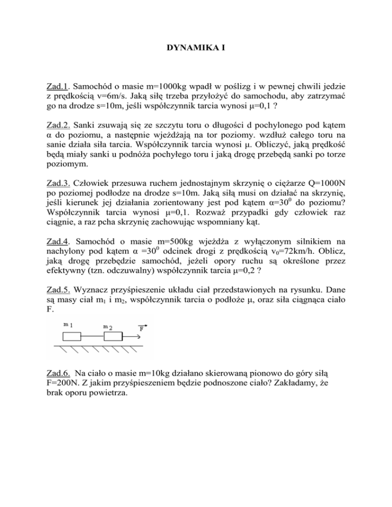 DYNAMIKA I Zad.1. Samochód o masie m=1000kg wpadł w poślizg i w pewnej chwili jedzie z prędkością v=6m/s. Jaką siłę trzeba przyłożyć do samochodu, aby zatrzymać go na drodze s=10m, jeśli współczynnik tarcia wynosi µ=0,1 ? Zad.2. Sanki zsuwają się ze szczytu toru o długości d pochylonego pod kątem α do poziomu, a następnie wjeżdżają na tor poziomy. wzdłuż całego toru na sanie działa siła tarcia. Współczynnik tarcia wynosi µ. Obliczyć, jaką prędkość będą miały sanki u podnóża pochyłego toru i jaką drogę przebędą sanki po torze poziomym. Zad.3. Człowiek przesuwa ruchem jednostajnym skrzynię o ciężarze Q=1000N po poziomej podłodze na drodze s=10m. Jaką siłą musi on działać na skrzynię, jeśli kierunek jej działania zorientowany jest pod kątem α=300 do poziomu? Współczynnik tarcia wynosi µ=0,1. Rozważ przypadki gdy człowiek raz ciągnie, a raz pcha skrzynię zachowując wspomniany kąt. Zad.4. Samochód o masie m=500kg wjeżdża z wyłączonym silnikiem na nachylony pod kątem α =300 odcinek drogi z prędkością v0=72km/h. Oblicz, jaką drogę przebędzie samochód, jeżeli opory ruchu są określone przez efektywny (tzn. odczuwalny) współczynnik tarcia µ=0,2 ? Zad.5. Wyznacz przyśpieszenie układu ciał przedstawionych na rysunku. Dane są masy ciał m1 i m2, współczynnik tarcia o podłoże µ, oraz siła ciągnąca ciało F. Zad.6. Na ciało o masie m=10kg działano skierowaną pionowo do góry siłą F=200N. Z jakim przyśpieszeniem będzie podnoszone ciało? Zakładamy, że brak oporu powietrza.
