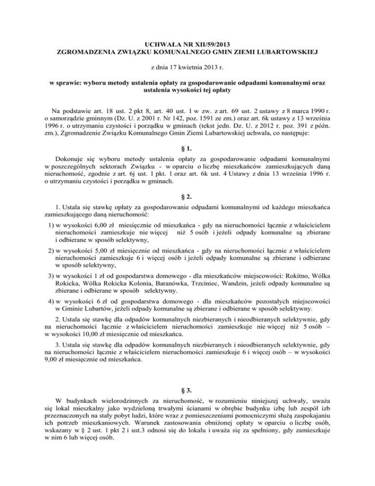 UCHWAŁA NR XII/59/2013 ZGROMADZENIA ZWIĄZKU KOMUNALNEGO GMIN ZIEMI LUBARTOWSKIEJ z dnia 17 kwietnia 2013 r. w sprawie: wyboru metody ustalenia opłaty za gospodarowanie odpadami komunalnymi oraz ustalenia wysokości tej opłaty Na podstawie art. 18 ust. 2 pkt 8, art. 40 ust. 1 w zw. z art. 69 ust. 2 ustawy z 8 marca 1990 r. o samorządzie gminnym (Dz. U. z 2001 r. Nr 142, poz. 1591 ze zm.) oraz art. 6k ustawy z 13 września 1996 r. o utrzymaniu czystości i porządku w gminach (tekst jedn. Dz. U. z 2012 r. poz. 391 z późn. zm.), Zgromadzenie Związku Komunalnego Gmin Ziemi Lubartowskiej uchwala, co następuje: § 1. Dokonuje się wyboru metody ustalenia opłaty za gospodarowanie odpadami komunalnymi w poszczególnych sektorach Związku - w oparciu o liczbę mieszkańców zamieszkujących daną nieruchomość, zgodnie z art. 6j ust. 1 pkt. 1 oraz art. 6k ust. 4 Ustawy z dnia 13 września 1996 r. o utrzymaniu czystości i porządku w gminach. § 2. 1. Ustala się stawkę opłaty za gospodarowanie odpadami komunalnymi od każdego mieszkańca zamieszkującego daną nieruchomość: 1) w wysokości 6,00 zł miesięcznie od mieszkańca - gdy na nieruchomości łącznie z właścicielem nieruchomości zamieszkuje nie więcej niż 5 osób i jeżeli odpady komunalne są zbierane i odbierane w sposób selektywny, 2) w wysokości 5,00 zł miesięcznie od mieszkańca - gdy na nieruchomości łącznie z właścicielem nieruchomości zamieszkuje 6 i więcej osób i jeżeli odpady komunalne są zbierane i odbierane w sposób selektywny, 3) w wysokości 1 zł od gospodarstwa domowego - dla mieszkańców miejscowości: Rokitno, Wólka Rokicka, Wólka Rokicka Kolonia, Baranówka, Trzciniec, Wandzin, jeżeli odpady komunalne są zbierane i odbierane w sposób selektywny. 4) w wysokości 6 zł od gospodarstwa domowego - dla mieszkańców pozostałych miejscowości w Gminie Lubartów, jeżeli odpady komunalne są zbierane i odbierane w sposób selektywny. 2. Ustala się stawkę dla odpadów komunalnych niezbieranych i nieodbieranych selektywnie, gdy na nieruchomości łącznie z właścicielem nieruchomości zamieszkuje nie więcej niż 5 osób – w wysokości 10,00 zł miesięcznie od mieszkańca. 3. Ustala się stawkę dla odpadów komunalnych niezbieranych i nieodbieranych selektywnie, gdy na nieruchomości łącznie z właścicielem nieruchomości zamieszkuje 6 i więcej osób – w wysokości 9,00 zł miesięcznie od mieszkańca. § 3. W budynkach wielorodzinnych za nieruchomość, w rozumieniu niniejszej uchwały, uważa się lokal mieszkalny jako wydzieloną trwałymi ścianami w obrębie budynku izbę lub zespół izb przeznaczonych na stały pobyt ludzi, które wraz z pomieszczeniami pomocniczymi służą zaspokajaniu ich potrzeb mieszkaniowych. Warunek zastosowania obniżonej opłaty w oparciu o liczbę osób, wskazany w § 2 ust. 1 pkt 2 i ust.3 odnosi się do lokalu i uważa się za spełniony, gdy zamieszkuje w nim 6 lub więcej osób. § 4. Wykonanie uchwały powierza się Zarządowi Związku Komunalnego Gmin Ziemi Lubartowskiej. § 5. Uchwała wchodzi w życie po upływie 14 dni od dnia jej ogłoszenia w Dzienniku Urzędowym Województwa Lubelskiego. Przewodniczący Zgromadzenia Związku Janusz Bodziacki