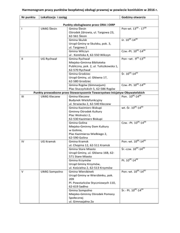 Harmonogram pracy punktów bezpłatnej obsługi prawnej w powiecie konińskim w 2016 r. Nr punktu I II III IV V Lokalizacja i zasięg Godziny otwarcia Punkty obsługiwane przez ORA i OIRP UMiG Ślesin Gmina Ślesin Pon‐wt. 1300 ‐ 1700 Ośrodek Zdrowia, ul. Targowa 23, 62‐561 Ślesin śr. 1000‐1400 Gmina Skulsk Urząd Gminy w Skulsku, pok. 3, ul. Targowa 2 Gmina Wilczyn Czw.‐Pt. 1000‐1400 ul . Konińska 4, 62‐550 Wilczyn Pon –wt . 900‐1300 UG Rychwał Gmina Rychwał Miejsko‐Gminna Biblioteka Publiczna, pok. 2, ul. Tuliszkowska 1, 62‐570 Rychwał Śr. 1000‐1400 Gmina Grodziec Urząd Gminy, ul. Główna 17, 62‐580 Grodziec Gmina Rzgów (Gimnazjum) Czw.‐Pt. 1000‐1400 Plac Stuczyńskich 5, 62‐586 Rzgów Punkty prowadzone przez Stowarzyszenie Towarzystwo Inicjatyw Obywatelskich Pon. 1000‐1400 UMiG Kleczew Gmina Kleczew Budynek Wielofunkcyjny ul. Strażacka 2, 62‐540 Kleczew wt.‐Śr. 1000‐1400 Gmina Kazimierz Biskupi Gminny Ośrodek Kultury Plac Wolności 2, 62‐530 Kazimierz Biskupi Czw. ‐Pt. 1000‐1400 Gmina Golina Miejsko‐Gminny Dom Kultury w Golinie, Plac Kazimierza Wielkiego 2, 62‐590 Golina UG Kramsk Gmina Kramsk Pon.‐wt. 1000‐1400 ul. Chopina 12, 62‐511 Kramsk Śr.‐czw. 1000‐1400 Gmina Stare Miasto Urząd Gminy, ul. Główna 16B, 62‐ 571 Stare Miasto Pt. 1000‐1400 Gmina Krzymów Urząd Gminy Krzymów, ul. Kościelna 2, 62‐513 Krzymów Pon.‐wt. 1000‐1400 UMiG Sompolno Gmina Wierzbinek Urząd Gminy w Wierzbinku, pok. 209 Pl. Powstańców Styczniowych 110, 62‐619 Sadlno Śr.‐ Pt. 1000‐1400 Gmina Sompolno Miejsko‐Gminny Ośrodek Pomocy Społecznej ul. Gimnazjalna 2a