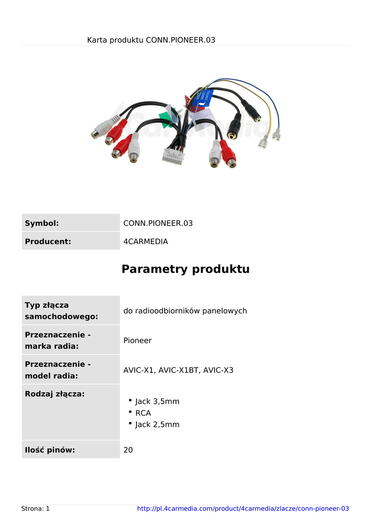 Karta produktu CONN.PIONEER.03 Symbol: CONN.PIONEER.03 Producent: 4CARMEDIA Parametry produktu Typ złącza samochodowego: Przeznaczenie marka radia: Przeznaczenie model radia: do radioodbiorników panelowych Pioneer AVIC-X1, AVIC-X1BT, AVIC-X3 Rodzaj złącza: Jack 3,5mm RCA Jack 2,5mm Ilość pinów: Strona: 1 20 http://pl.4carmedia.com/product/4carmedia/zlacze/conn-pioneer-03 Karta produktu CONN.PIONEER.03 Właściwości car podłączenie głośnika przedniego (stereo), podłączenie audio: głośnika tylnego (stereo), podłączenie subwoofera (stereo) Informacje dodatkowe Masa brutto: Strona: 2 0,061 kg http://pl.4carmedia.com/product/4carmedia/zlacze/conn-pioneer-03