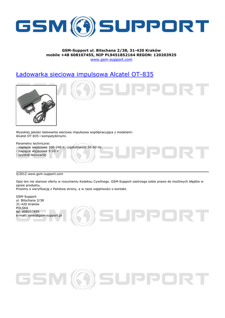 GSM-Support ul. Bitschana 2/38, 31-420 Kraków mobile +48 608107455, NIP PL9451852164 REGON: 120203925 www.gsm-support.com Ładowarka sieciowa impulsowa Alcatel OT-835 Wysokiej jakości ładowarka sieciowa impulsowa współpracująca z modelami: Alcatel OT-835 i kompatybilnymi. Parametry techniczne: - napięcie wejściowe 100-240 V, częstotliwość 50-60 Hz - napięcie wyjściowe 5-10 V - szybkie ładowanie ©2012 www.gsm-support.com Opis ten nie stanowi oferty w rozumieniu Kodeksu Cywilnego. GSM-Support zastrzega sobie prawo do możliwych błędów w opisie produktu. Prosimy o weryfikację z Państwa strony, a w razie wątpliwości o kontakt. GSM-Support ul. Bitschana 2/38 31-420 Kraków POLSKA tel. 608107455 e-mail: [email protected] Powered by TCPDF (www.tcpdf.org)