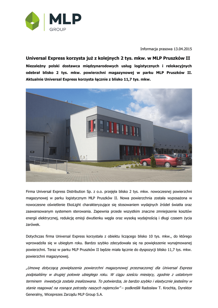 Informacja prasowa 13.04.2015 Universal Express korzysta już z kolejnych 2 tys. mkw. w MLP Pruszków II Niezależny polski dostawca międzynarodowych usług logistycznych i relokacyjnych odebrał blisko 2 tys. mkw. powierzchni magazynowej w parku MLP Pruszków II. Aktualnie Universal Express korzysta łącznie z blisko 11,7 tys. mkw. Firma Universal Express Distribution Sp. z o.o. przejęła blisko 2 tys. mkw. nowoczesnej powierzchni magazynowej w parku logistycznym MLP Pruszków II. Nowa powierzchnia została wyposażona w nowoczesne oświetlenie EkoLight charakteryzujące się stosowaniem wydajnych źródeł światła oraz zaawansowanym systemem sterowania. Zapewnia przede wszystkim znaczne zmniejszenie kosztów energii elektrycznej, redukcję emisji dwutlenku węgla oraz wysoką wydajnością i długi czasem życia żarówek. Dotychczas firma Universal Express korzystała z obiektu liczącego blisko 10 tys. mkw., do którego wprowadziła się w ubiegłym roku. Bardzo szybko zdecydowała się na powiększenie wynajmowanej powierzchni. Teraz w parku MLP Pruszków II będzie miała łącznie do dyspozycji blisko 11,7 tys. mkw. powierzchni magazynowej. „Umowę dotyczącą powiększenia powierzchni magazynowej przeznaczonej dla Universal Express podpisaliśmy w drugiej połowie ubiegłego roku. W ciągu sześciu miesięcy, zgodnie z ustalonym terminem inwestycja została zrealizowana. To potwierdza, że bardzo szybko i elastycznie jesteśmy w stanie reagować na rosnące potrzeby naszych najemców” – podkreślił Radosław T. Krochta, Dyrektor Generalny, Wiceprezes Zarządu MLP Group S.A. Centrum logistyczne MLP Pruszków II położone jest w okolicach Warszawy, w gminie Brwinów, w odległości 5 km od Pruszkowa. Park zajmuje łącznie 67 hektarów i docelowo ma obejmować 302 000 mkw. MLP Pruszków II posiada rozwinięte połączenia komunikacyjne zarówno z centrum Warszawy, jak i z głównymi arteriami łączącymi stolicę z innymi miastami. Park położony jest między drogą lokalną nr 760 a odcinkiem autostrady A2, 3 km od węzła komunikacyjnego zlokalizowanego w rejonie Pruszkowa-Żbikowa. W jego pobliżu przebiegają linie kolejowe o charakterze międzynarodowym, które umożliwiają doskonałe warunki logistyczne zarówno dla dystrybucji krajowej, jak i międzynarodowej. *** MLP GROUP S.A. – najważniejsze informacje MLP Group jest jednym z wiodących deweloperów powierzchni magazynowo-produkcyjnych w Polsce. Grupa działa na rynku w roli dewelopera, konsultanta i zarządcy nieruchomości, dostarczając wszechstronnych rozwiązań w zakresie optymalizacji powierzchni magazynowo-produkcyjnej wielu międzynarodowym i krajowym przedsiębiorstwom produkcyjnym oraz dystrybucyjnym. W celu zapewnienia wysokiej jakości świadczonych usług, wszystkie projekty realizowane przez Grupę wyróżnia bardzo atrakcyjna lokalizacja parków logistycznych oraz stosowanie rozwiązania typu built-to-suit. MLP Group jest obecnie właścicielem sześciu parków logistycznych zlokalizowanych w Polsce: MLP Pruszków I, MLP Pruszków II, MLP Tychy, MLP Poznań, MLP Bieruń oraz MLP Lublin. W przygotowaniu są kolejne parki. Więcej informacji także na www.mlp.pl Dodatkowych informacji udzielają: Małgorzata Ślusarczyk, MLP Group S.A. tel. (22) 738 30 14 e-mail: [email protected] Mariusz Skowronek, Tauber Promotion Tel. (22) 833 35 02, 698 612 866 e-mail: [email protected] Andrzej Kazimierczak, Tauber Promotion Tel. (22) 833 23 88, 691 507 173 e-mail: [email protected]