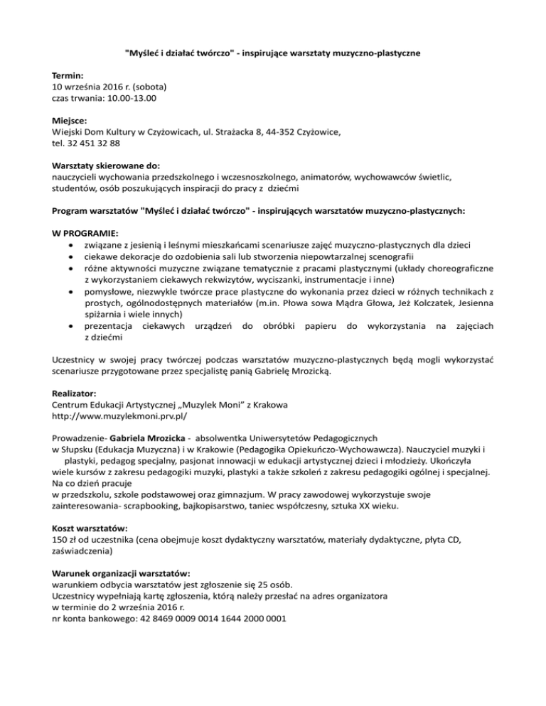 "Myśleć i działać twórczo" - inspirujące warsztaty muzyczno-plastyczne Termin: 10 września 2016 r. (sobota) czas trwania: 10.00-13.00 Miejsce: Wiejski Dom Kultury w Czyżowicach, ul. Strażacka 8, 44-352 Czyżowice, tel. 32 451 32 88 Warsztaty skierowane do: nauczycieli wychowania przedszkolnego i wczesnoszkolnego, animatorów, wychowawców świetlic, studentów, osób poszukujących inspiracji do pracy z dziećmi Program warsztatów "Myśleć i działać twórczo" - inspirujących warsztatów muzyczno-plastycznych: W PROGRAMIE: związane z jesienią i leśnymi mieszkańcami scenariusze zajęć muzyczno-plastycznych dla dzieci ciekawe dekoracje do ozdobienia sali lub stworzenia niepowtarzalnej scenografii różne aktywności muzyczne związane tematycznie z pracami plastycznymi (układy choreograficzne z wykorzystaniem ciekawych rekwizytów, wyciszanki, instrumentacje i inne) pomysłowe, niezwykle twórcze prace plastyczne do wykonania przez dzieci w różnych technikach z prostych, ogólnodostępnych materiałów (m.in. Płowa sowa Mądra Głowa, Jeż Kolczatek, Jesienna spiżarnia i wiele innych) prezentacja ciekawych urządzeń do obróbki papieru do wykorzystania na zajęciach z dziećmi Uczestnicy w swojej pracy twórczej podczas warsztatów muzyczno-plastycznych będą mogli wykorzystać scenariusze przygotowane przez specjalistę panią Gabrielę Mrozicką. Realizator: Centrum Edukacji Artystycznej „Muzylek Moni” z Krakowa http://www.muzylekmoni.prv.pl/ Prowadzenie- Gabriela Mrozicka - absolwentka Uniwersytetów Pedagogicznych w Słupsku (Edukacja Muzyczna) i w Krakowie (Pedagogika Opiekuńczo-Wychowawcza). Nauczyciel muzyki i plastyki, pedagog specjalny, pasjonat innowacji w edukacji artystycznej dzieci i młodzieży. Ukończyła wiele kursów z zakresu pedagogiki muzyki, plastyki a także szkoleń z zakresu pedagogiki ogólnej i specjalnej. Na co dzień pracuje w przedszkolu, szkole podstawowej oraz gimnazjum. W pracy zawodowej wykorzystuje swoje zainteresowania- scrapbooking, bajkopisarstwo, taniec współczesny, sztuka XX wieku. Koszt warsztatów: 150 zł od uczestnika (cena obejmuje koszt dydaktyczny warsztatów, materiały dydaktyczne, płyta CD, zaświadczenia) Warunek organizacji warsztatów: warunkiem odbycia warsztatów jest zgłoszenie się 25 osób. Uczestnicy wypełniają kartę zgłoszenia, którą należy przesłać na adres organizatora w terminie do 2 września 2016 r. nr konta bankowego: 42 8469 0009 0014 1644 2000 0001 KARTA ZGŁOSZENIA "Myśleć i działać twórczo" - inspirujące warsztaty muzyczno-plastyczne 10 września 2016 r. Wiejski Dom Kultury w Czyżowicach Imię i nazwisko uczestnika Pesel Telefon kontaktowy e- mail Adres Placówka delegująca Faktura /tak, nie/ Dane do faktury