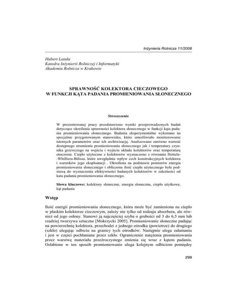 ¦InŜynieria Rolnicza 11/2006 Hubert Latała Katedra InŜynierii Rolniczej i Informatyki Akademia Rolnicza w Krakowie SPRAWNOŚĆ KOLEKTORA CIECZOWEGO W FUNKCJI KĄTA PADANIA PROMIENIOWANIA SŁONECZNEGO Streszczenie W prezentowanej pracy przedstawiono wyniki przeprowadzonych badań dotyczące określenia sprawności kolektora słonecznego w funkcji kąta padania promieniowania słonecznego. Badania eksperymentalne wykonano na specjalnie przygotowanym stanowisku, które umoŜliwiało monitorowanie istotnych parametrów oraz ich archiwizację. Analizowano zarówno wartość dostępnego strumienia promieniowania słonecznego jak i temperatury czynnika grzewczego na wejściu i wyjściu układu kolektorów oraz temperaturę otoczenia. Ciepło uŜyteczne z kolektorów wyznaczono z równania Hottela-Whilliera-Bilissa, które uwzględnia wpływ cech konstrukcyjnych kolektora i warunków jego eksploatacji . Określona na podstawie pomiarów energia promieniowania słonecznego i obliczona ilość ciepła uŜytecznego była podstawą do wyznaczenia efektywności badanych kolektorów w zaleŜności od kata padania promieniowania słonecznego. Słowa kluczowe: kolektory słoneczne, energia słoneczna, ciepło uŜytkowe, kąt padania Wstęp Ilość energii promieniowania słonecznego, która moŜe być zamieniona na ciepło w płaskim kolektorze cieczowym, zaleŜy nie tylko od rodzaju absorbera, ale równieŜ od jego osłony. Stanowi ją najczęściej szyba o grubości od 3 do 6,5 mm lub rzadziej tworzywa sztuczne [Mokrzycki 2005]. Promieniowanie słoneczne padając na powierzchnię kolektora, przechodzi z jednego ośrodka (powietrze) do drugiego (szkło) ulegając odbiciu na granicy tych ośrodków. Następnie ulega załamaniu i jest w części pochłaniane przez szkło. Ograniczenie natęŜenia promieniowania przez warstwę materiału przeźroczystego zmienia się wraz z kątem padania. Osłabione w ten sposób promieniowanie ulega kolejnym odbiciom pomiędzy %,,¦ ;hUXeg¦?TgTÄT¦¦ ¦ absorberem i przezroczystym pokryciem. W efekcie ilość promieniowania pochłoniętego przez absorber jest mniejsza w porównaniu z promieniowaniem padającym na powierzchnię kolektora. Zadanie określenia ilościowego zysku ciepła dla promieniowania bezpośredniego jest w takim przypadku stosunkowo proste. Rozumowanie takie jednak nie ujmuje wpływu promieniowania rozproszonego i odbitego od otocznia, w którym znajdują się kolektory słoneczne. Stąd w pracy podjęto próbę określenia wpływu kata padania promieniowania słonecznego na sprawność konwersji promieniowania na ciepło. Realizację tak postawionego celu wykonano na podstawie porównania ilości ciepła dostępnego w kolektorach słonecznych w stosunku do całkowitej energii promieniowania słonecznego padającego na płaszczyznę kolektorów. Opis obiektu badań Badania doświadczalne przeprowadzono w obiekcie badawczym, zlokalizowanym na terenie Wydziału AgroinŜynierii Akademii Rolniczej w Krakowie. System konwersji promieniowania słonecznego stanowiły 4 płaskie kolektory cieczowe skierowane płaszczyzną czynną na południe. Łączna powierzchnia absorbera konwertującego energię słoneczną wynosiła 7,1 m2. Ciepło z kolektorów przekazywane było do wody zgromadzonej w zbiorniku przez wymiennik wykonany w kształcie węŜownicy o powierzchni wymiany 1,38 m2. Es Twy transmisja danych Komputerowy system pomiarowy kąt padania kolektory Twe Twody Tot zbiornik pompa cyrkulacyjna wymiennik Rys. 1. Fig. 1. &##¦ Schemat ideowy systemu konwersji promieniowania słonecznego Schematic diagram of solar radiation conversion system ¦FceTjabÉ}¦^b_X^gbeT¦V\XVmbjXZb!!!¦ W układzie kolektory - węŜownica znajdował się płyn niezamarzający glikol, za którego ruch odpowiadała pampa cyrkulacyjna. Zbiornik o pojemności 6 m3 wypełniony był 3000 litrów wody. Na rysunku 1 przedstawiono schemat systemu konwersji promieniowania słonecznego z zaznaczonymi parametrami, które były monitorowane, w trakcie przeprowadzanego eksperymentu, przez komputerowy system pomiarowy. Metodyka badań Do realizacji postawionego celu wykonano pomiary następujących parametrów: natęŜenia promieniowania słonecznego (Es), temperatury otoczenia (Tot), temperatury czynnika grzewczego na wejściu (Twe) i wyjściu (Twy) z kolektora, ilości czynnika grzewczego przepływającego przez kolektory (qc), temperatury wody w zbiorniku (Twody). Pomiary, wyŜej wymienionych wielkości, przeprowadzono w zmiennych warunkach solarnych w miesiącach czerwcu i październiku. Analogowe sygnały pomiarowe, z wymienionych powyŜej punktów pomiarowych zamienione na sygnał cyfrowy, były archiwizowane w przedziałach 30 sekundowych. Z otrzymanych wyników wyliczono ilość ciepła dostępnego z promieniowania słonecznego, którą następnie porównano z ciepłem uŜytecznym z kolektorów słonecznych. Jako podstawę czasu trwania konwersji energii promieniowania słonecznego na ciepło uŜyteczne przyjęto okres, w którym pracowała pompa cyrkulacyjna. Sprawność systemu konwersji promieniowania słonecznego (η) obliczono według zaleŜności (1): Q (1) η= u Qs gdzie: Qs – ciepło dostępne z promieniowania słonecznego, J Qu – ciepło uŜyteczne z kolektora, J Ciepło uŜyteczne z kolektorów (Qu) wyznaczono z równania Hottela-WhillieraBilissa [Pluta 2000], które uwzględnia wpływ cech konstrukcyjnych kolektora i warunków jego eksploatacji. Q u = A k ⋅ FR ⋅ [S − U L (Twe – Tot )] gdzie: Ak FR S UL Twe Tot (2) – powierzchnia absorbera, m2 – współczynnik odprowadzenia ciepła z kolektora, – energia promieniowania słonecznego pochłonięta przez absorber, W/m2 – zastępczy współczynnik strat ciepła kolektora, W/m2 K – temperatury czynnika grzewczego na wejściu do kolektora, oC – temperatura otoczenia, oC &#$¦ ;hUXeg¦?TgTÄT¦¦ ¦ Współczynnik odprowadzenia ciepła z kolektora określający stosunek aktualnie oddawanego ciepła uŜyt
