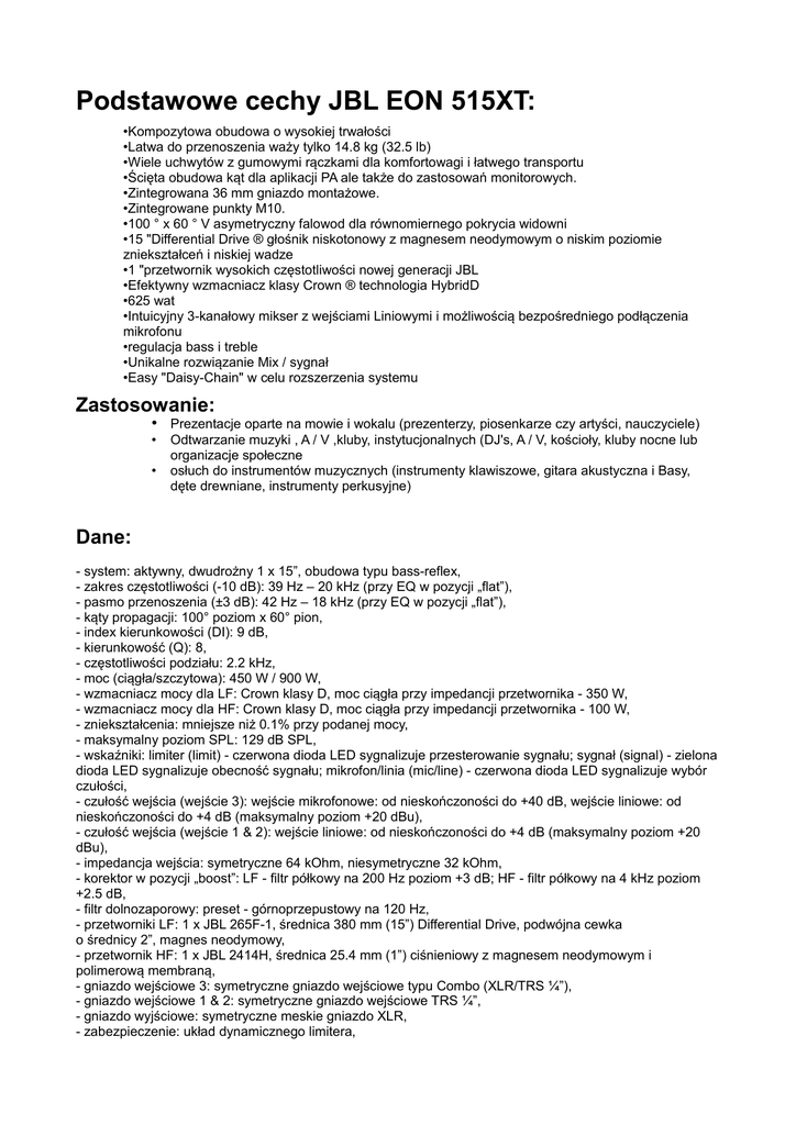 Podstawowe cechy JBL EON 515XT: •Kompozytowa obudowa o wysokiej trwałości •Latwa do przenoszenia waży tylko 14.8 kg (32.5 lb) •Wiele uchwytów z gumowymi rączkami dla komfortowagi i łatwego transportu •Ścięta obudowa kąt dla aplikacji PA ale także do zastosowań monitorowych. •Zintegrowana 36 mm gniazdo montażowe. •Zintegrowane punkty M10. •100 ° x 60 ° V asymetryczny falowod dla równomiernego pokrycia widowni •15 "Differential Drive ® głośnik niskotonowy z magnesem neodymowym o niskim poziomie zniekształceń i niskiej wadze •1 "przetwornik wysokich częstotliwości nowej generacji JBL •Efektywny wzmacniacz klasy Crown ® technologia HybridD •625 wat •Intuicyjny 3-kanałowy mikser z wejściami Liniowymi i możliwością bezpośredniego podłączenia mikrofonu •regulacja bass i treble •Unikalne rozwiązanie Mix / sygnał •Easy "Daisy-Chain" w celu rozszerzenia systemu Zastosowanie: • Prezentacje oparte na mowie i wokalu (prezenterzy, piosenkarze czy artyści, nauczyciele) • • Odtwarzanie muzyki , A / V ,kluby, instytucjonalnych (DJ's, A / V, kościoły, kluby nocne lub organizacje społeczne osłuch do instrumentów muzycznych (instrumenty klawiszowe, gitara akustyczna i Basy, dęte drewniane, instrumenty perkusyjne) Dane: - system: aktywny, dwudrożny 1 x 15”, obudowa typu bass-reflex, - zakres częstotliwości (-10 dB): 39 Hz – 20 kHz (przy EQ w pozycji „flat”), - pasmo przenoszenia (±3 dB): 42 Hz – 18 kHz (przy EQ w pozycji „flat”), - kąty propagacji: 100° poziom x 60° pion, - index kierunkowości (DI): 9 dB, - kierunkowość (Q): 8, - częstotliwości podziału: 2.2 kHz, - moc (ciągła/szczytowa): 450 W / 900 W, - wzmacniacz mocy dla LF: Crown klasy D, moc ciągła przy impedancji przetwornika - 350 W, - wzmacniacz mocy dla HF: Crown klasy D, moc ciągła przy impedancji przetwornika - 100 W, - zniekształcenia: mniejsze niż 0.1% przy podanej mocy, - maksymalny poziom SPL: 129 dB SPL, - wskaźniki: limiter (limit) - czerwona dioda LED sygnalizuje przesterowanie sygnału; sygnał (signal) - zielona dioda LED sygnalizuje obecność sygnału; mikrofon/linia (mic/line) - czerwona dioda LED sygnalizuje wybór czułości, - czułość wejścia (wejście 3): wejście mikrofonowe: od nieskończoności do +40 dB, wejście liniowe: od nieskończoności do +4 dB (maksymalny poziom +20 dBu), - czułość wejścia (wejście 1 & 2): wejście liniowe: od nieskończoności do +4 dB (maksymalny poziom +20 dBu), - impedancja wejścia: symetryczne 64 kOhm, niesymetryczne 32 kOhm, - korektor w pozycji „boost”: LF - filtr półkowy na 200 Hz poziom +3 dB; HF - filtr półkowy na 4 kHz poziom +2.5 dB, - filtr dolnozaporowy: preset - górnoprzepustowy na 120 Hz, - przetworniki LF: 1 x JBL 265F-1, średnica 380 mm (15”) Differential Drive, podwójna cewka o średnicy 2”, magnes neodymowy, - przetwornik HF: 1 x JBL 2414H, średnica 25.4 mm (1”) ciśnieniowy z magnesem neodymowym i polimerową membraną, - gniazdo wejściowe 3: symetryczne gniazdo wejściowe typu Combo (XLR/TRS ¼”), - gniazdo wejściowe 1 & 2: symetryczne gniazdo wejściowe TRS ¼”, - gniazdo wyjściowe: symetryczne meskie gniazdo XLR, - zabezpieczenie: układ dynamicznego limitera, - obudowa: wykonana z tworzywa polimerowego, zastosowanie frontowe i monitorowe, - transport: ergonomiczny górny uchwyt i dwa po bokach, - podwieszanie/montaż: gniazdo dla statywu o średnicy 36mm ze śrubą zabezpieczającą, 5 punktów M10 do podwieszenia, - maskownica: malowana proszkowo stalowa maskownica z otworami, akustycznie neutralna gąbka od wewnątrz, - wymagane zasilanie: 120 - 240 V, 50/60 Hz, - wymiar: wysokość 685 mm, szerokość 438 mm, głębokość 366 mm, - waga: 14.8 kg.