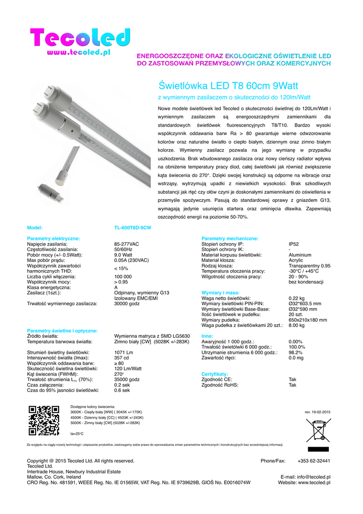 Świetlówka LED T8 60cm 9Watt z wymiennym zasilaczem o skuteczności do 120lm/Watt Nowe modele świetlówek led Tecoled o skuteczności świetlnej do 120Lm/Watt i wymiennym standardowych zasilaczem są świetlówek energooszczędnymi fluorescencyjnych zamiennikami T8/T10. Bardzo dla wysoki współczynnik oddawania barw Ra > 80 gwarantuje wierne odwzorowanie kolorów oraz naturalne światło o ciepło białym, dziennym oraz zimno białym kolorze. Wymienny zasilacz pozwala na jego wymianę w przypadku uszkodzenia. Brak wbudowanego zasilacza oraz nowy cieńszy radiator wpływa na obniżenie temperatury pracy diod, całej świetlówki jak również zwiększenie kąta świecenia do 270°. Dzięki swojej konstrukcji są odporne na wibracje oraz wstrząsy, wytrzymują upadki z niewielkich wysokości. Brak szkodliwych substancji jak rtęć czy ołów czyni je doskonałymi zamiennikami do oświetlenia w przemyśle spożywczym. Pasują do standardowej oprawy z gniazdem G13, wymagają jedynie usunięcia startera oraz ominięcia dławika. Zapewniają oszczędność energii na poziomie 50-70%. Model: TL-600T8D-9CW Parametry elektryczne: Napięcie zasilania: Częstotliwość zasilania: Pobór mocy (+/- 0.5Watt): Max pobór prądu: Współczynnik zawartości harmonicznych THD: Liczba cykli włączenia: Współczynnik mocy: Klasa energetyczna: Zasilacz (1szt.): 85-277VAC 50/60Hz 9.0 Watt 0.05A (230VAC) < 15% Trwałość wymiennego zasilacza: 100 000 > 0.95 A Odpinany, wymienny G13 Izolowany EMC/EMI 30000 godz Parametry świetlne i optyczne: Źródło światła: Temperatura barwowa światła: Wymienna matryca z SMD LG5630 Zimno biały [CW] (5028K +/-283K) Strumień świetlny świetlówki: Intensywność światła (Imax): Współczynnik oddawania barw: Skuteczność świetlna świetlówki: Kąt świecenia (FWHM): Trwałość strumienia L70 (70%): Czas załączenia: Czas do 95% jasności świetlówki: 1071 Lm 357 cd ≥ 80 120 Lm/Watt 270o 35000 godz 0.2 sek 0.6 sek Parametry mechaniczne: Stopień ochrony IP: Stopień ochrony IK: Materiał korpusu świetlówki: Materiał klosza: Rodzaj klosza: Temperatura otoczenia pracy: Wilgotność otoczenia pracy: IP52 Aluminium Acrylic Transparentny 0.95 -30°C / +45°C 20 - 90% bez kondensacji Wymiary i masa: Waga netto świetlówki: Wymiary świetlówki PIN-PIN: Wymiary świetlówki Base-Base: Ilość świetlówek w pudełku: Wymiary pudełka: Waga pudełka z świetlówkami 20 szt.: 0.22 kg Ø32*603.5 mm Ø32*590 mm 20 szt. 650x210x180 mm 8.00 kg Inne: Awaryjność 1 000 godz.: Trwałość świetólwki 6 000 godz.: Utrzymanie strumienia 6 000 godz.: Zawartość rtęci: 0.00% 100.0% 98.2% 0.0 mg Certyfikaty: Zgodność CE: Zgodność RoHS: Tak Tak Dostępne kolory świecenia: 3000K - Ciepły biały [WW] ( 3045K +/-175K) 4500K - Dzienny biały [CC] ( 4503K +/-243K) 5000K - Zimny biały [CW] (5028K +/-283K) rev. 19-02-2015 ta=25oC Ze względu na ciągły rozwój technologii i ulepszanie produktów, zastrzegamy sobie prawo do wprowadzania zmian parametrów technicznych i konstrukcyjnych bez wcześniejszej informacji. Copyright @ 2015 Tecoled Ltd. All rights reserved. Tecoled Ltd. Intertrade House, Newbury Industrial Estate Mallow, Co. Cork, Ireland CRO Reg. No. 481591, WEEE Reg. No. IE 01565W, VAT Reg. No. IE 9739629B, GIOŚ No. E0016074W Phone/Fax: +353 62-32441 E-mail: [email protected] Website: www.tecoled.pl Świetlówka LED T8 120cm 17Watt z wymiennym zasilaczem o skuteczności do 120lm/Watt Nowe modele świetlówek led Tecoled o skuteczności świetlnej do 120Lm/Watt i wymiennym standardowych zasilaczem są świetlówek energooszczędnymi fluorescencyjnych zamiennikami T8/T10. Bardzo dla wysoki współczynnik oddawania barw Ra > 80 gwarantuje wierne odwzorowanie kolorów oraz naturalne światło o ciepło białym, dziennym oraz zimno białym kolorze. Wymienny zasilacz pozwala na jego wymianę w przypadku uszkodzenia. Brak wbudowanego zasilacza oraz nowy cieńszy radiator wpływa na obniżenie temperatury pracy diod, całej świetlówki jak również zwiększenie kąta świecenia do 270°. Dzięki swojej konstrukcji są odporne na wibracje oraz wstrząsy, wytrzymują upadki z niewielkich wysokości. Brak szkodliwych substancji jak rtęć czy ołów czyni je doskonałymi zamiennikami do oświetlenia w przemyśle spożywczym. Pasują do standardowej oprawy z gniazdem G13, wymagają jedynie usunięcia startera oraz ominięcia dławika. Zapewniają oszczędność energii na poziomie 50-70%. Model: TL-1200T8D-17CW Parametry elektryczne: Napięcie zasilania: Częstotliwość zasilania: Pobór mocy (+/- 0.5Watt): Max pobór prądu: Współczynnik zawartości harmonicznych THD: Liczba cykli włączenia: Współczynnik mocy: Klasa energetyczna: Zasilacz (1szt.): 85-277VAC 50/60Hz 17.0 Watt 0.08A (230VAC) < 15% Trwałość wymiennego zasilacza: 100 000 > 0.95 A Odpinany, wymienny G13 Izolowany EMC/EMI 30000 godz Parametry świetlne i optyczne: Źródło światła: Temperatura barwowa światła: Wymienna matryca z SMD LG5630 Zimno biały [CW] (5028K +/-283K) Strumień świetlny świetlówki: Intensywność światła (Imax): Współczynnik oddawania barw: Skuteczność świetlna świetlówki: Kąt świecenia (FWHM): Trwałość strumienia L70 (70%): Czas załączenia: Czas do 95% jasności świetlówki: 2004 Lm 715 cd ≥ 80 120 Lm/Watt 270o 35000 godz 0.2 sek 0.6 sek Parametry mechaniczne: Stopień ochrony IP: Stopień ochrony IK: Materiał korpusu świetlówki: Materiał klosza: Rodzaj klosza: Temperatura otoczenia pracy: Wilgotność otoczenia pracy: IP52 Aluminium Acrylic Transparentny 0.95 -30°C / +45°C 20 - 90% bez kondensacji Wymiary i masa: Waga netto świetlówki: Wymiary świetlówki PIN-PIN: Wymiary świetlówki Base-Base: Ilość świetlówek w pudełku: Wymiary pudełka: Waga pudełka z świetlówkami 20 szt.: 0.40 kg Ø32*1212 mm Ø32*1198 mm 20 szt. 1240x240x190 mm 13.50 kg Inne: Awaryjność 1 000 godz.: Trwałość świetólwki 6 000 godz.: Utrzymanie strum