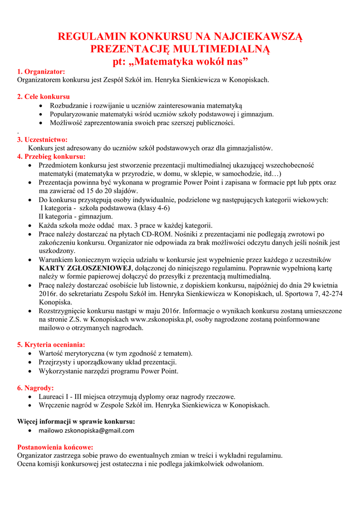 REGULAMIN KONKURSU NA NAJCIEKAWSZĄ PREZENTACJĘ MULTIMEDIALNĄ pt: „Matematyka wokół nas” 1. Organizator: Organizatorem konkursu jest Zespół Szkół im. Henryka Sienkiewicza w Konopiskach. 2. Cele konkursu Rozbudzanie i rozwijanie u uczniów zainteresowania matematyką Popularyzowanie matematyki wśród uczniów szkoły podstawowej i gimnazjum. Możliwość zaprezentowania swoich prac szerszej publiczności. . 3. Uczestnictwo: Konkurs jest adresowany do uczniów szkół podstawowych oraz dla gimnazjalistów. 4. Przebieg konkursu: Przedmiotem konkursu jest stworzenie prezentacji multimedialnej ukazującej wszechobecność matematyki (matematyka w przyrodzie, w domu, w sklepie, w samochodzie, itd…) Prezentacja powinna być wykonana w programie Power Point i zapisana w formacie ppt lub pptx oraz ma zawierać od 15 do 20 slajdów. Do konkursu przystępują osoby indywidualnie, podzielone wg następujących kategorii wiekowych: I kategoria - szkoła podstawowa (klasy 4-6) II kategoria - gimnazjum. Każda szkoła może oddać max. 3 prace w każdej kategorii. Prace należy dostarczać na płytach CD-ROM. Nośniki z prezentacjami nie podlegają zwrotowi po zakończeniu konkursu. Organizator nie odpowiada za brak możliwości odczytu danych jeśli nośnik jest uszkodzony. Warunkiem koniecznym wzięcia udziału w konkursie jest wypełnienie przez każdego z uczestników KARTY ZGŁOSZENIOWEJ, dołączonej do niniejszego regulaminu. Poprawnie wypełnioną kartę należy w formie papierowej dołączyć do przesyłki z prezentacją multimedialną. Pracę należy dostarczać osobiście lub listownie, z dopiskiem konkursu, najpóźniej do dnia 29 kwietnia 2016r. do sekretariatu Zespołu Szkół im. Henryka Sienkiewicza w Konopiskach, ul. Sportowa 7, 42-274 Konopiska. Rozstrzygnięcie konkursu nastąpi w maju 2016r. Informacje o wynikach konkursu zostaną umieszczone na stronie Z.S. w Konopiskach www.zskonopiska.pl, osoby nagrodzone zostaną poinformowane mailowo o otrzymanych nagrodach. 5. Kryteria oceniania: Wartość merytoryczna (w tym zgodność z tematem). Przejrzysty i uporządkowany układ prezentacji. Wykorzystanie narzędzi programu Power Point. 6. Nagrody: Laureaci I - III miejsca otrzymują dyplomy oraz nagrody rzeczowe. Wręczenie nagród w Zespole Szkół im. Henryka Sienkiewicza w Konopiskach. Więcej informacji w sprawie konkursu: mailowo [email protected] Postanowienia końcowe: Organizator zastrzega sobie prawo do ewentualnych zmian w treści i wykładni regulaminu. Ocena komisji konkursowej jest ostateczna i nie podlega jakimkolwiek odwołaniom.