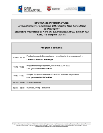 SPOTKANIE INFORMACYJNE „Projekt Umowy Partnerstwa 2014-2020 w fazie konsultacji społecznych” Starostwo Powiatowe w Kole, ul. Sienkiewicza 21/23, Sala nr 102 Koło, 13 sierpnia 2013 r. Program spotkania 10:00 – 10:10 Powitanie uczestników spotkania i przedstawienie prowadzących – - Starosta Powiatu Kolskiego 10:10 -10:50 Programowanie perspektywy finansowej 2014-2020 – ref. pracownik PIFE w Kole 10:50 -11:30 Polityka Spójności w okresie 2014-2020, wybrane zagadnienia – ref. pracownik PIFE w Kole 11:30 – 12:00 Przerwa kawowa 12:00 – 13:00 Dyskusja, uwagi i zapytania Projekt realizowany we współpracy z Ministerstwem Rozwoju Regionalnego, współfinansowany przez Unię Europejską z Europejskiego Funduszu Rozwoju Regionalnego w ramach Programu Operacyjnego Pomoc Techniczna 2007-2013, Wielkopolskiego Regionalnego Programu Operacyjnego na lata 2007-2013 oraz przez budżet państwa
