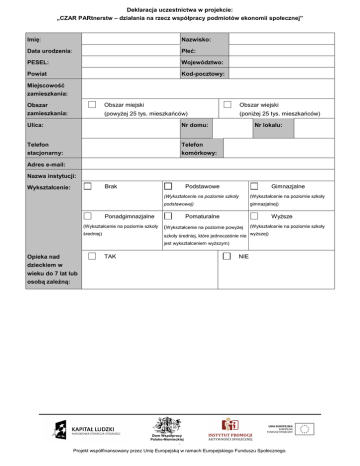 Deklaracja uczestnictwa w projekcie: „CZAR PARtnerstw – działania na rzecz współpracy podmiotów ekonomii społecznej” Imię: Nazwisko: Data urodzenia: Płeć: PESEL: Województwo: Powiat Kod-pocztowy: Miejscowość zamieszkania: Obszar Obszar miejski Obszar wiejski zamieszkania: (powyżej 25 tys. mieszkańców) (poniżej 25 tys. mieszkańców) Ulica: Nr domu: Telefon Telefon stacjonarny: komórkowy: Nr lokalu: Adres e-mail: Nazwa instytucji: Brak Wykształcenie: Podstawowe Gimnazjalne (Wykształcenie na poziomie szkoły (Wykształcenie na poziomie szkoły podstawowej) gimnazjalnej) Ponadgimnazjalne Pomaturalne Wyższe (Wykształcenie na poziomie szkoły (Wykształcenie na poziomie powyżej (Wykształcenie na poziomie szkoły średniej) szkoły średniej, które jednocześnie nie wyższej) jest wykształceniem wyższym) TAK Opieka nad NIE dzieckiem w wieku do 7 lat lub osobą zależną: Dom Współpracy Polsko-Niemieckiej ` Projekt współfinansowany przez Unię Europejską w ramach Europejskiego Funduszu Społecznego. Deklaracja uczestnictwa w projekcie: „CZAR PARtnerstw – działania na rzecz współpracy podmiotów ekonomii społecznej” Nazwa instytucji: Numer NIP: Numer REGON: Kod PKD: Numer KRS: Ulica: Nr budynku: Nr lokalu: Kod pocztowy: Miejscowość: Obszar Obszar miejski Obszar wiejski zamieszkania: (powyżej 25 tys. mieszkańców) (poniżej 25 tys. mieszkańców) Adres WWW: Adres email: Telefon: Faks: Obszar działalności organizacji (proszę zaznaczyć maksymalnie 3 kwadraty): Ochrona zdrowia Animacja społeczna (inicjatywy społeczne) Organizacja mniejszościowa Biznes i gospodarka Organizacja studencka Działania na rzecz osób niepełnosprawnych Pomoc i integracja społeczna Edukacja Przeciwdziałanie dyskryminacji Ekologia, ochrona przyrody Rozwój terenów wiejskich Hobbystyczna Sport i rekreacja Informacja/integracja europejska Turystyka Inne …………………………… Wspieranie działań innych NGO Kultura i sztuka, media Wspieranie wolontariatu Ochrona dziedzictwa kulturowego Krótki opis działalności organizacji: Dom Współpracy Polsko-Niemieckiej ` Projekt współfinansowany przez Unię Europejską w ramach Europejskiego Funduszu Społecznego. Deklaracja uczestnictwa w projekcie: „CZAR PARtnerstw – działania na rzecz współpracy podmiotów ekonomii społecznej” Oświadczenia: 1. Oświadczam, że: instytucja prowadzi działalność gospodarczą*; instytucja nie prowadzi działalności gospodarczej*; *w rozumieniu ustawy o swobodzie działalności gospodarczej (Dz.U.2004 nr 173 poz.1807) z późniejszymi zmianami. 2. Oświadczam, że: w ostatnim roku podatkowym instytucja osiągnęła przychód poniżej 50 000 zł; w ostatnim roku podatkowym instytucja osiągnęła przychód poniżej 1 000 000 zł; 3. Oświadczam, że: - akceptuję zasady udziału w projekcie „CZAR PARtnerstw” i wyrażam zgodę na uczestnictwo; - zgodnie z wymogami jestem uprawniony/a do uczestnictwa w projekcie; - wyrażam zgodę na przekazywanie informacji drogą telefoniczną lub elektroniczną (email); - zostałem/łam poinformowany, iż projekt jest współfinansowany ze środków Unii Europejskiej w ramach Europejskiego Funduszu Społecznego. 4. Gromadzenie i przetwarzanie danych osobowych: a) Wyrażam dobrowolną zgodę na gromadzenie, przetwarzanie i przekazywanie moich danych osobowych zawartych w niniejszym formularzu (zgodnie z ustawą z dnia 29.08.1997 r. o ochronie danych osobowych Dz. U. z 2002r. Nr 101 poz. 926, z późn.zm.) do celów związanych z przeprowadzeniem szkolenia; do celów rekrutacji, sprawozdawczości, monitoringu, kontroli oraz ewaluacji w ramach koordynacji projektu, a także w zakresie niezbędnym do wywiązywania się Beneficjenta projektu z obowiązków sprawozdawczych wobec Instytucji Zarządzającej Program Operacyjny Kapitał Ludzki. b) Wyrażam dobrowolnie zgodę na przetwarzanie moich danych osobowych, obejmujących informacje wymienione w pkt. a) przez Wnioskodawcę, Partnerów Projektu oraz Instytucję Zarządzającą Programem Operacyjnym Kapitał Ludzki lub podmiot przez niego upoważniony do celów sprawozdawczych z realizacji usług, w których brałem/łam udział oraz monitoringu i ewaluacji projektu. 5. Zostałem uprzedzony/a o odpowiedzialności karnej z art. 233 Kodeksu Karnego za złożenie nieprawdziwego oświadczenia lub zatajenie prawdy, niniejszym oświadczam, że dane są zgodne z prawdą i zostałem/łam poinformowany/a o odpowiedzialności karnej /za podanie nieprawdziwych danych. Podpis uczestnika Podpis osób reprezentujących instytucję (wg KRS) Dom Współpracy Polsko-Niemieckiej ` Projekt współfinansowany przez Unię Europejską w ramach Europejskiego Funduszu Społecznego.