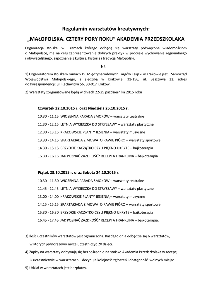 Regulamin warsztatów kreatywnych: „MAŁOPOLSKA. CZTERY PORY ROKU” AKADEMIA PRZEDSZKOLAKA Organizacja stoiska, w ramach którego odbędą się warsztaty poświęcone wiadomościom o Małopolsce, ma na celu zaprezentowanie dobrych praktyk w procesie wychowania regionalnego i obywatelskiego, zapoznanie z kulturą, historią i tradycją Małopolski. §1 1) Organizatorem stoiska w ramach 19. Międzynarodowych Targów Książki w Krakowie jest Samorząd Województwa Małopolskiego, z siedzibą w Krakowie, 31-156, ul. Basztowa 22; adres do korespondencji: ul. Racławicka 56, 30-017 Kraków. 2) Warsztaty zorganizowane będą w dniach 22-25 października 2015 roku Czwartek 22.10.2015 r. oraz Niedziela 25.10.2015 r. 10.30 - 11.15 WIOSENNA PARADA SMOKÓW – warsztaty teatralne 11.30 - 12.15 LETNIA WYCIECZKA DO STRYSZAWY – warsztaty plastyczne 12.30 - 13.15 KRAKOWSKIE PLANTY JESIENIĄ – warsztaty muzyczne 13.30 - 14.15 SPARTAKIADA ZIMOWA O PAWIE PIÓRO – warsztaty sportowe 14.30 - 15.15 BRZYDKIE KACZĄTKO CZYLI PIĘKNO UKRYTE – bajkoterapia 15.30 - 16.15 JAK POZNAĆ ZAZDROŚĆ? RECEPTA FRANKLINA – bajkoterapia Piątek 23.10.2015 r. oraz Sobota 24.10.2015 r. 10.30 - 11.30 WIOSENNA PARADA SMOKÓW – warsztaty teatralne 11.45 - 12.45 LETNIA WYCIECZKA DO STRYSZAWY – warsztaty plastyczne 13.00 - 14.00 KRAKOWSKIE PLANTY JESIENIĄ – warsztaty muzyczne 14.15 - 15.15 SPARTAKIADA ZIMOWA O PAWIE PIÓRO – warsztaty sportowe 15.30 - 16.30 BRZYDKIE KACZĄTKO CZYLI PIĘKNO UKRYTE – bajkoterapia 16.45 - 17.45 JAK POZNAĆ ZAZDROŚĆ? RECEPTA FRANKLINA – bajkoterapia. 3) Ilość uczestników warsztatów jest ograniczona. Każdego dnia odbędzie się 6 warsztatów, w których jednorazowo może uczestniczyć 20 dzieci. 4) Zapisy na warsztaty odbywają się bezpośrednio na stoisko Akademia Przedszkolaka w recepcji. O uczestnictwie w warsztatach decyduje kolejność zgłoszeń i dostępność wolnych miejsc. 5) Udział w warsztatach jest bezpłatny. §2 1) Warsztaty organizowane są dla dzieci w przedziale wiekowym 3-6 lat. 2) Rodzic/opiekun pozostawiający dziecko na warsztatach zobowiązany jest do podania swoich danych osobowych i kontaktowych Organizatorowi podczas zapisów. 3) Rodzic/opiekun zostawiający dziecko pod opieką nauczycieli prowadzących warsztaty zobowiązany jest do pozostania na terenie hali targów; może uczestniczyć w warsztatach razem z dzieckiem lub pozostać obok stoiska w tzw. strefie dla rodziców. 4) W strefie dla rodziców mogą przebywać tylko i wyłącznie rodzice/opiekunowie dzieci biorących udział w warsztatach w danym czasie. 5) Rodzic/opiekun jest zobowiązany do punktualnego przyprowadzenia i odebrania dziecka zgodnie z harmonogramem zajęć warsztatowych. 6) Prace plastyczne wykonywane podczas warsztatów przechodzą na własność organizatora. §3 1) Zgłaszając swój udział w Akademii Przedszkolaka, rodzic/opiekun akceptuje tym samym warunki zawarte w niniejszym Regulaminie. 2) Każdy rodzic/opiekun zobowiązany jest do zapoznania się z niniejszym regulaminem. wszystkie