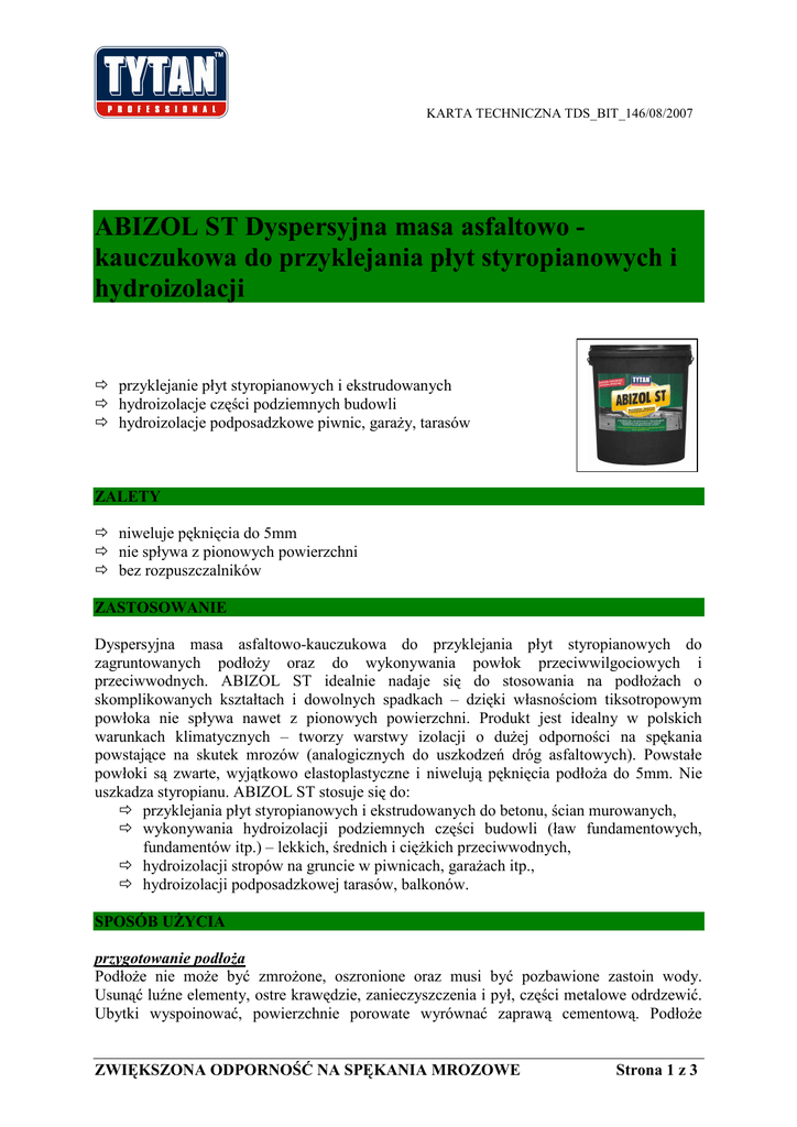 KARTA TECHNICZNA TDS_BIT_146/08/2007 ABIZOL ST Dyspersyjna masa asfaltowo kauczukowa do przyklejania płyt styropianowych i hydroizolacji przyklejanie płyt styropianowych i ekstrudowanych hydroizolacje części podziemnych budowli hydroizolacje podposadzkowe piwnic, garaŜy, tarasów ZALETY niweluje pęknięcia do 5mm nie spływa z pionowych powierzchni bez rozpuszczalników ZASTOSOWANIE Dyspersyjna masa asfaltowo-kauczukowa do przyklejania płyt styropianowych do zagruntowanych podłoŜy oraz do wykonywania powłok przeciwwilgociowych i przeciwwodnych. ABIZOL ST idealnie nadaje się do stosowania na podłoŜach o skomplikowanych kształtach i dowolnych spadkach – dzięki własnościom tiksotropowym powłoka nie spływa nawet z pionowych powierzchni. Produkt jest idealny w polskich warunkach klimatycznych – tworzy warstwy izolacji o duŜej odporności na spękania powstające na skutek mrozów (analogicznych do uszkodzeń dróg asfaltowych). Powstałe powłoki są zwarte, wyjątkowo elastoplastyczne i niwelują pęknięcia podłoŜa do 5mm. Nie uszkadza styropianu. ABIZOL ST stosuje się do: przyklejania płyt styropianowych i ekstrudowanych do betonu, ścian murowanych, wykonywania hydroizolacji podziemnych części budowli (ław fundamentowych, fundamentów itp.) – lekkich, średnich i cięŜkich przeciwwodnych, hydroizolacji stropów na gruncie w piwnicach, garaŜach itp., hydroizolacji podposadzkowej tarasów, balkonów. SPOSÓB UśYCIA przygotowanie podłoŜa PodłoŜe nie moŜe być zmroŜone, oszronione oraz musi być pozbawione zastoin wody. Usunąć luźne elementy, ostre krawędzie, zanieczyszczenia i pył, części metalowe odrdzewić. Ubytki wyspoinować, powierzchnie porowate wyrównać zaprawą cementową. PodłoŜe ZWIĘKSZONA ODPORNOŚĆ NA SPĘKANIA MROZOWE Strona 1 z 3 KARTA TECHNICZNA TDS_BIT_146/08/2007 zagruntować gruntem głębokopenetrującym DISPROBIT GRUNT (nie stosować gruntów rozpuszczalnikowych) i poczekać do jego wyschnięcia. aplikacja Przyklejanie płyt styropianowych – prace rozpocząć od dna wykopu. ABIZOL ST nakładać punktowo na płyty styropianowe. Płyty przykładać do podłoŜa i dociskać je ruchem kolistym. Czas wiązania wynosi ok. 3-5 dni. Stosować na zimno. Wykonywanie hydroizolacji – stosować na zimno. Po naleŜytym wyschnięciu DISPROBIT GRUNTU nakładać masę pacą lub kielnią, starając się zachować jednakową grubość nakładanej warstwy (około 1mm). Grubość warstwy kontrolować przez sprawdzanie zuŜycia masy (1,2 kg/m2 / warstwę). Masę nałoŜyć w minimum 2 warstwach, kaŜdą następną prostopadle do poprzedniej. Kolejne warstwy nakładać po naleŜytym wyschnięciu poprzedniej (warstwa o grubości 1mm schnie ok. 24 godziny w temp. +23oC). DANE TECHNICZNE kolor konsystencja temperatura powietrza i podłoŜa podczas stosowania grubość warstwy czas schnięcia zuŜycie: - punktowe klejenie styropianu brązowo-brunatny gęsta tiksotropowa pasta od +5oC do +35oC do 2 mm 3-5 dni ok. 1 kg/m2 1,2 kg/m2 na 1mm grubości warstwy minimum 2 wodą, po zaschnięciu rozpuszczalnikiem organicznym - hydroizolacja ilość warstw czyszczenie narzędzi Dane techniczne i informacje o sposobie stosowania podane są dla temperatury +23oC ± 2oC i wilgotności ok. 60%. NiŜsza temperatura i podwyŜszona wilgotność wydłuŜa czas schnięcia. NORMY, ATESTY Produkt spełnia wymogi normy: PN-B-24000DN:1997 Produkt posiada certyfikat zgodności z normą Polskiego Centrum Badań i Certyfikacji Krajowa Deklaracja Zgodności 153.07 z dnia 07.09.2007 PRZECHOWYWANIE I OPOKAWONIE Przechowywać w oryginalnie zamkniętych opakowaniach, w temperaturze od +5oC do +35oC. Data waŜności na opakowaniu. Pojemność 9 kg Opakowanie wiadro Ilość opakowań na palecie 44 ZWIĘKSZONA ODPORNOŚĆ NA SPĘKANIA MROZOWE Kod EAN 590 3518 05754 0 Strona 2 z 3 KARTA TECHNICZNA TDS_BIT_146/08/2007 18 kg wiadro 33 590 3518 05755 7 BEZPIECZEŃSTWO S2 Chronić przed dziećmi. S37 Nosić odpowiednie rękawice ochronne. S46 W razie połknięcia niezwłocznie zasięgnij porady lekarza - pokaŜ opakowanie lub etykietę. Selena S.A., Świdnica ul.Głowackiego 18 www.selena.pl infolinia: 0801 350 500 ZWIĘKSZONA ODPORNOŚĆ NA SPĘKANIA MROZOWE Aktualizacja 15.10.2007 Strona 3 z 3