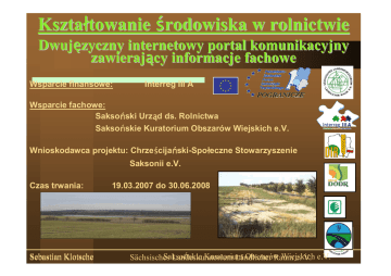 Kszta towanie rodowiska w rolnictwie Dwuj zyczny internetowy portal komunikacyjny zawieraj cy informacje fachowe Wsparcie finansowe: Interreg III A ł ł ł ł ńń ńń śś śś ńń ńń ąą ąą ńń ńń Wsparcie fachowe: Sakso ski Urz d ds. Rolnictwa Sakso skie Kuratorium Obszarów Wiejskich e.V. Wnioskodawca projektu: Chrze cija ski-Spo eczne Stowarzyszenie Saksonii e.V. 19.03.2007 do 30.06.2008 ń Czas trwania: Sebastian Klotsche Sakso skie Kuratorium Obszarów Wiejskich Sächsisches Landeskuratorium Ländlicher Raum e. V. e.V. Kszta towanie rodowiska w rolnictwie ęę ęę Dwuj zyczny portal internetowy: www.bodeninfo.eu / www.glebainfo.eu 1. Opracowanie struktury stron ą ś ą a) Opracowanie propozycji struktury Systemu Zarz dzania Tre ci b) Przedstawienie projektu w grupie roboczej 2. Uzgodnienie struktury stron ń Uzgodnienie struktury Systemów z realizatorem projektu Opracowanie dzia a administracyjnych ł a) b) 3. Programowanie Programowanie, instalacja i opracowywanie odpowiednich modu ów Wprowadzenie do obs ugi wszystkich funkcji ł ł a) b) 4. Opieka/poszerzenie ł Doradztwo redakcyjne i opieka nad portalem Modu y dodatkowe: WebGIS i Hot-Spot-Karte ń a) b) Sebastian Klotsche SaksoSächsisches skie Kuratorium Obszarów Wiejskich e.V. Landeskuratorium Ländlicher Raum e. V. Informacja fachowa (Portal Krajowego Urz Sebastian Klotsche ęę ęę Kszta towanie rodowiska w rolnictwie du ds. Rolnictwa) Sächsisches Landeskuratorium Ländlicher Raum e. V. Kszta towanie rodowiska w rolnictwie Komunikacja internetowa ąą ąą Redaktorzy fachowi (DMS/System Zarz dzania Dokumentami) Biuletyn/Forum ąą ąą Zarz dzania Tre ci ąą ąą śś śś Content Management System/System (administratorzy) Sebastian Klotsche Sächsisches Landeskuratorium Ländlicher Raum e. V. Kszta towanie rodowiska w rolnictwie ł ł ł jaki sposób funkcjonuje witryna internetowa? ł W Podzia na dwa obszary: ę ę ś ś ś ś ę ę ś ś Backend – panel administracyjny, tutaj nast puje ś ś ć ć Frontend – „strona przednia”, na której przedstawiona jest jej zawarto ć ć Ŝ Ŝ Ŝ Ŝ – Tworzenie i opracowywanie zawarto ci ą ą ą ą – Zarz dzanie u ytkownikami – Programowanie i rozplanowanie – szata graficzna Sebastian Klotsche ę ę ę ę Dost p do panelu tylko dla redaktorów i administratorów Sächsisches Landeskuratorium Ländlicher Raum e. V. Kszta towanie rodowiska w rolnictwie ą System zarz dzania dokumentami (DMS) Sebastian Klotsche Sächsisches Landeskuratorium Ländlicher Raum e. V. Kszta towanie rodowiska w rolnictwie ą ą ą ą ś ś ą ą ł ł ł ł śś śś ą ą ś ś W jaki sposób funkcjonuje witryna internetowa? Content Management System (CMS)/System zarz dzania tre ci : ąą ąą ęę ęę śś śś ŜŜ ŜŜ ć ć ć ć ąą ąą ęę ęę ąą ąą – Tre ci znajduj ce si na stronie nie s na sta e zaprogramowane, lecz b d dynamicznie tworzone przez zapytania bazy danych ąą ąą ć ć ć ć ęę ęę ęę ęę – Tworzenie danych mo e dlatego odbywa si bez znajomo ci zasad programowania – Opracowywanie nie wymaga dost pu do serwera i przebiega poprzez sie internetow ąą ąą ęę ęę ęę ęę – Uprawnienia dost pu b d przydzielane przez administratora Typo3 ć ć ć ć ł ł ł ł – Standardowy program CMS – Bezp atne oprogramowanie ęę ęę ŜŜ ŜŜ – Dzi ki samodzielnemu programowaniu mo e zosta poszerzony Sebastian Klotsche Sächsisches Landeskuratorium Ländlicher Raum e. V. Kszta towanie rodowiska w rolnictwie Sebastian Klotsche Sächsisches Landeskuratorium Ländlicher Raum e. V.