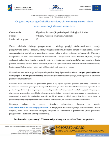 Organizacja przyjęć okolicznościowych, elementy savoir vivre oraz aranżacji stołów i otoczenia Czas trwania: 32 godziny lekcyjne (4 spotkania po 8 h lekcyjnych; 8x4h) Forma: wykłady, ćwiczenia praktyczne, warsztaty Liczba osób w grupie: 15 Zakres szkolenia obejmuje przygotowanie i obsługę przyjęć okolicznościowych, zasady przygotowania potraw i napojów, formy obsługi konsumenta. Poziom i kultura obsługi klienta, zasady serwowania dań zasadniczych, organizacja przyjęć, także w plenerze imprez grillowanych. Warsztaty nakrywania do stołu w zależności od okoliczności. Zasady savoir vivre: historia, etykieta, zasady zachowań wobec innych osób, powitanie, historia etykiety spożywania posiłków, nakrywania stołu do posiłku, dekoracja stołów, mowa sztućców, ustalanie i projektowanie, kalkulowanie okolicznościowej karty menu. Dobór zastawy stołowej, bielizny stołowej, sztućców i szkła. Uczestnikami szkolenia mogą być wyłącznie przedsiębiorcy i pracownicy mikro i małych przedsiębiorstw działających w branży gastronomicznej na terenie województwa dolnośląskiego, wydelegowani na szkolenie przez swoich pracodawców. Szkolenia będą realizowane w godzinach pracy i są objęte regułami pomocy publicznej. Oznacza to konieczność wniesienia przez pracodawcę wkładu własnego. Nasz Projekt zakłada wniesienie tego wkładu w postaci bezgotówkowej, co w praktyce oznacza, że pracodawca biorący udział w szkoleniu, bądź delegujący na nie swojego pracownika, przedkłada dokument potwierdzający wysokość otrzymywanego wynagrodzenia w wymaganej w projekcie minimalnej wartości 44,78 zł brutto za dzień pracy. Pomiędzy naszą firmą a pracodawcą delegującym pracownika na szkolenie podpisywana jest stosowna umowa szkoleniowa. Rekrutacja odbywa się poprzez formularz zgłoszeniowy dostępny na stronie http://www.dobrekadry.nazwa.pl/gastronom2. W kolejnym kroku skontaktuje się z Państwem osoba z Biura Projektu, która ustali wszystkie szczegóły związane ze szkoleniem i przeprowadzi przez procedurę przygotowania i podpisania umowy szkoleniowej. Serdecznie zapraszamy! Chętnie odpowiemy na wszelkie Państwa pytania.