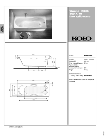 WANNY AKRYLOWE Wanna IRBIS 160 X 70 dno ryflowane Numer: XWP0760 __________________________________ 35 70 40 1600 455 435 Wymiar: / 52 130 - 180 510 330 1600 x 700 mm G³êbokoœæ: 435 mm Wys. krawêdzi zewn. 35 mm Pojemnoœæ do dolnej krawêdzi otworu przelewowego: 200 l Waga: 18 kg Do kompletowania: - uchwyt IRBIS bia³y SU00006 Nogi i zestaw monta¿owy w komplecie z wann¹ 2003.02.14 WANNY AKRYLOWE
