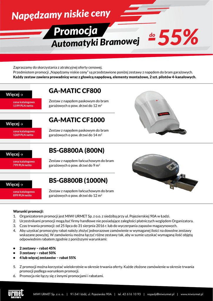 Promocja Automatyki Bramowej - 55% do Zapraszamy do skorzystania z atrakcyjnej oferty cenowej. Przedmiotem promocji „Napędzamy niskie ceny” są przedstawione poniżej zestawy z napędem do bram garażowych. Każdy zestaw zawiera prowadnicę wraz z głowicą napędową, elementy montażowe, 2 szt. pilotów 4-kanałowych. GA-MATIC CF800 Więcej → cena katalogowa 1199 PLN netto Zestaw z napędem paskowym do bram garażowych o pow. drzwi do 12 m2 GA-MATIC CF1000 Więcej → cena katalogowa 1269 PLN netto Zestaw z napędem paskowym do bram garażowych o pow. drzwi do 14 m2 BS-G8800A (800N) Więcej → cena katalogowa 799 PLN netto Zestaw z napędem łańcuchowym do bram garażowych o pow. drzwi do 9 m2 BS-G8800B (1000N) Więcej → cena katalogowa 899 PLN netto Zestaw z napędem łańcuchowym do bram garażowych o pow. drzwi do 12 m2 Warunki promocji: 1. Organizatorem promocji jest MIWI URMET Sp. z o.o. z siedzibą przy ul. Pojezierskiej 90A w Łodzi. 2. Uczestnikami promocji mogą być firmy handlowe nie posiadające zaległości płatniczych względem Organizatora. 3. Czas trwania promocji: od 25 lipca do 31 sierpnia 2016 r. lub do wyczerpania zapasów magazynowych. 4. Aby uzyskać promocyjny rabat należy złożyć jednorazowe zamówienie w wymaganej ilości na dowolne zestawy wskazane powyżej. W zamówieniu można łączyć różne zestawy tak, aby w sumie uzyskać wymaganą ilość objętą odpowiednim rabatem zgodnie z poniższymi warunkami: • • • 2 zestawy – rabat 45% 3 zestawy – rabat 50% 4 lub więcej zestawów – rabat 55% 5. Z promocji można korzystać wielokrotnie w okresie trwania oferty. Każde złożone zamówienie w okresie trwania promocji podlega warunkom promocji. 6. Promocja nie łączy się z innymi promocjami i rabatami. MIWI URMET Sp. z o. o. | 91-341 Łódź, ul. Pojezierska 90A | tel. 42 616 10 93 | [email protected] | www.miwiurmet.pl
