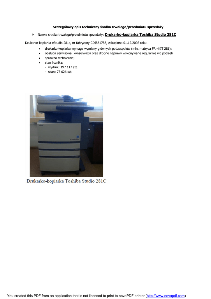 Szczegółowy opis techniczny środka trwałego/przedmiotu sprzedaży  Nazwa środka trwałego/przedmiotu sprzedaży: Drukarko-kopiarka Toshiba Studio 281C Drukarko-kopiarka eStudio 281c, nr fabryczny CDI861786, zakupiona 01.12.2008 roku.     drukarko-kopiarka wymaga wymiany głównych podzespołów (min. matryca FR –KIT 281); obsługa serwisowa, konserwacja oraz drobne naprawy wykonywane regularnie wg potrzeb sprawna technicznie; stan licznika: - wydruk: 197 117 szt. - skan: 77 026 szt. You created this PDF from an application that is not licensed to print to novaPDF printer (http://www.novapdf.com)