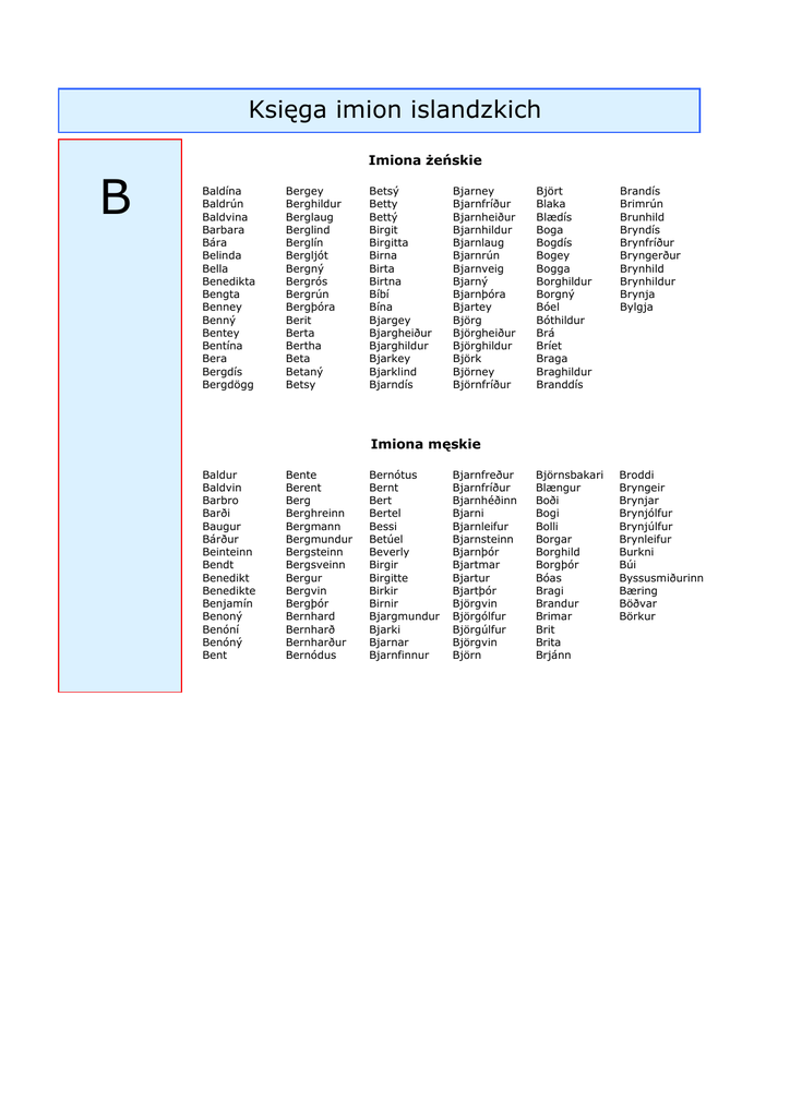 Księga imion islandzkich B Imiona żeńskie Baldína Baldrún Baldvina Barbara Bára Belinda Bella Benedikta Bengta Benney Benný Bentey Bentína Bera Bergdís Bergdögg Bergey Berghildur Berglaug Berglind Berglín Bergljót Bergný Bergrós Bergrún Bergþóra Berit Berta Bertha Beta Betaný Betsy Betsý Betty Bettý Birgit Birgitta Birna Birta Birtna Bíbí Bína Bjargey Bjargheiður Bjarghildur Bjarkey Bjarklind Bjarndís Bjarney Bjarnfríður Bjarnheiður Bjarnhildur Bjarnlaug Bjarnrún Bjarnveig Bjarný Bjarnþóra Bjartey Björg Björgheiður Björghildur Björk Björney Björnfríður Björt Blaka Blædís Boga Bogdís Bogey Bogga Borghildur Borgný Bóel Bóthildur Brá Bríet Braga Braghildur Branddís Brandís Brimrún Brunhild Bryndís Brynfríður Bryngerður Brynhild Brynhildur Brynja Bylgja Björnsbakari Blængur Boði Bogi Bolli Borgar Borghild Borgþór Bóas Bragi Brandur Brimar Brit Brita Brjánn Broddi Bryngeir Brynjar Brynjólfur Brynjúlfur Brynleifur Burkni Búi Byssusmiðurinn Bæring Böðvar Börkur Imiona męskie Baldur Baldvin Barbro Barði Baugur Bárður Beinteinn Bendt Benedikt Benedikte Benjamín Benoný Benóní Benóný Bent Bente Berent Berg Berghreinn Bergmann Bergmundur Bergsteinn Bergsveinn Bergur Bergvin Bergþór Bernhard Bernharð Bernharður Bernódus Bernótus Bernt Bert Bertel Bessi Betúel Beverly Birgir Birgitte Birkir Birnir Bjargmundur Bjarki Bjarnar Bjarnfinnur Bjarnfreður Bjarnfríður Bjarnhéðinn Bjarni Bjarnleifur Bjarnsteinn Bjarnþór Bjartmar Bjartur Bjartþór Björgvin Björgólfur Björgúlfur Björgvin Björn