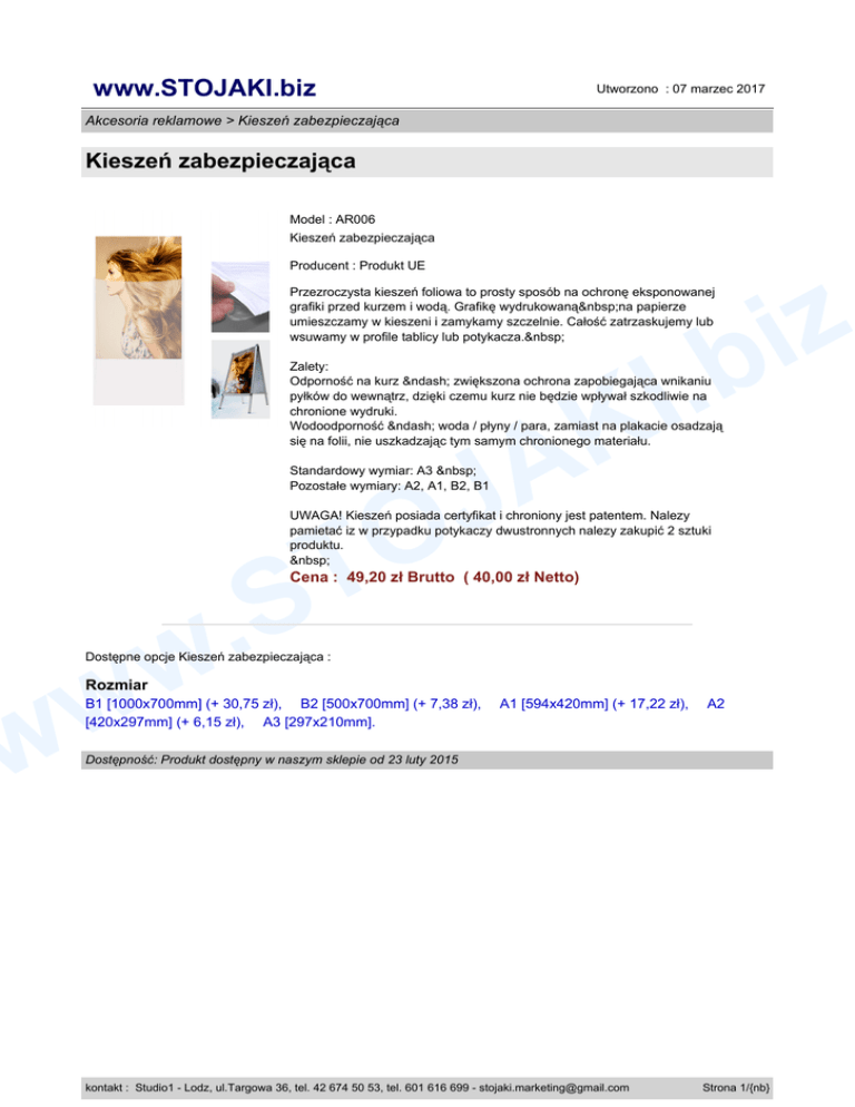 www.STOJAKI.biz Utworzono : 07 marzec 2017 Akcesoria reklamowe > Kieszeń zabezpieczająca Kieszeń zabezpieczająca Model : AR006 Kieszeń zabezpieczająca Producent : Produkt UE z i .b Przezroczysta kieszeń foliowa to prosty sposób na ochronę eksponowanej grafiki przed kurzem i wodą. Grafikę wydrukowaną na papierze umieszczamy w kieszeni i zamykamy szczelnie. Całość zatrzaskujemy lub wsuwamy w profile tablicy lub potykacza. I K Zalety: Odporność na kurz – zwiększona ochrona zapobiegająca wnikaniu pyłków do wewnątrz, dzięki czemu kurz nie będzie wpływał szkodliwie na chronione wydruki. Wodoodporność – woda / płyny / para, zamiast na plakacie osadzają się na folii, nie uszkadzając tym samym chronionego materiału. A J Standardowy wymiar: A3 Pozostałe wymiary: A2, A1, B2, B1 O T UWAGA! Kieszeń posiada certyfikat i chroniony jest patentem. Nalezy pamietać iz w przypadku potykaczy dwustronnych nalezy zakupić 2 sztuki produktu. S . w Cena : 49,20 zł Brutto ( 40,00 zł Netto) w w Dostępne opcje Kieszeń zabezpieczająca : Rozmiar B1 [1000x700mm] (+ 30,75 zł), B2 [500x700mm] (+ 7,38 zł), [420x297mm] (+ 6,15 zł), A3 [297x210mm]. A1 [594x420mm] (+ 17,22 zł), A2 Dostępność: Produkt dostępny w naszym sklepie od 23 luty 2015 kontakt : Studio1 - Lodz, ul.Targowa 36, tel. 42 674 50 53, tel. 601 616 699 - [email protected] Strona 1/{nb}