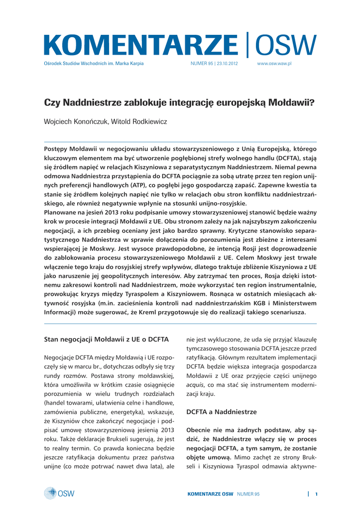 Ośrodek Studiów Wschodnich im. Marka Karpia NUMER 95 | 23.10.2012 www.osw.waw.pl Czy Naddniestrze zablokuje integrację europejską Mołdawii? Wojciech Konończuk, Witold Rodkiewicz Postępy Mołdawii w negocjowaniu układu stowarzyszeniowego z Unią Europejską, którego kluczowym elementem ma być utworzenie pogłębionej strefy wolnego handlu (DCFTA), stają się źródłem napięć w relacjach Kiszyniowa z separatystycznym Naddniestrzem. Niemal pewna odmowa Naddniestrza przystąpienia do DCFTA pociągnie za sobą utratę przez ten region unijnych preferencji handlowych (ATP), co pogłębi jego gospodarczą zapaść. Zapewne kwestia ta stanie się źródłem kolejnych napięć nie tylko w relacjach obu stron konfliktu naddniestrzańskiego, ale również negatywnie wpłynie na stosunki unijno-rosyjskie. Planowane na jesień 2013 roku podpisanie umowy stowarzyszeniowej stanowić będzie ważny krok w procesie integracji Mołdawii z UE. Obu stronom zależy na jak najszybszym zakończeniu negocjacji, a ich przebieg oceniany jest jako bardzo sprawny. Krytyczne stanowisko separatystycznego Naddniestrza w sprawie dołączenia do porozumienia jest zbieżne z interesami wspierającej je Moskwy. Jest wysoce prawdopodobne, że intencją Rosji jest doprowadzenie do zablokowania procesu stowarzyszeniowego Mołdawii z UE. Celem Moskwy jest trwałe włączenie tego kraju do rosyjskiej strefy wpływów, dlatego traktuje zbliżenie Kiszyniowa z UE jako naruszenie jej geopolitycznych interesów. Aby zatrzymać ten proces, Rosja dzięki istotnemu zakresowi kontroli nad Naddniestrzem, może wykorzystać ten region instrumentalnie, prowokując kryzys między Tyraspolem a Kiszyniowem. Rosnąca w ostatnich miesiącach aktywność rosyjska (m.in. zacieśnienia kontroli nad naddniestrzańskim KGB i Ministerstwem Informacji) może sugerować, że Kreml przygotowuje się do realizacji takiego scenariusza. Stan negocjacji Mołdawii z UE o DCFTA Negocjacje DCFTA między Mołdawią i UE rozpoczęły się w marcu br., dotychczas odbyły się trzy rundy rozmów. Postawa strony mołdawskiej, która umożliwiła w krótkim czasie osiągnięcie porozumienia w wielu trudnych rozdziałach (handel towarami, ułatwienia celne i handlowe, zamówienia publiczne, energetyka), wskazuje, że Kiszyniów chce zakończyć negocjacje i podpisać umowę stowarzyszeniową jesienią 2013 roku. Także deklaracje Brukseli sugerują, że jest to realny termin. Co prawda konieczna będzie jeszcze ratyfikacja dokumentu przez państwa unijne (co może potrwać nawet dwa lata), ale nie jest wykluczone, że uda się przyjąć klauzulę tymczasowego stosowania DCFTA jeszcze przed ratyfikacją. Głównym rezultatem implementacji DCFTA będzie większa integracja gospodarcza Mołdawii z UE oraz przyjęcie części unijnego acquis, co ma stać się instrumentem modernizacji kraju. DCFTA a Naddniestrze Obecnie nie ma żadnych podstaw, aby sądzić, że Naddniestrze włączy się w proces negocjacji DCFTA, a tym samym, że zostanie objęte umową. Mimo zachęt ze strony Brukseli i Kiszyniowa Tyraspol odmawia aktywne- KOMENTARZE OSW NUMER 95 1 go udziału w rozmowach i jedynie oddelegował niskiego rangą urzędnika w charakterze obserwatora. Faktycznie więc nie uczestniczy w negocjacjach dotyczących kwestii istotnych dla naddniestrzańskich eksporterów (kwoty eksportowe i wysokość cła na niektóre towary, okresy przejściowe itd.). Urzędnicy i eksperci z Naddniestrza argumentują przy tym, że przystąpienie do DCFTA byłoby dla tego regionu niekorzystne z czysto ekonomicznego punktu widzenia, a implementacja acquis byłaby sprzeczna z przyjętym kierunkiem harmonizacji prawa z ustawodawstwem rosyjskim. Powstaje wrażenie, że Naddniestrze odmawia udziału w negocjacjach o DCFTA także dlatego, by mieć możliwość ogłoszenia w przyszłości, iż nowy reżim handlowy został wprowadzony jednostronnie, bez konsultacji z Tyraspolem i bez uwzględnienia jego interesów. Naddniestrze być może liczy na to, że wobec odmowy jego udziału w DCFTA, UE zawiesi podpisanie umowy o DCFTA z Mołdawią. Obecnie nie ma żadnych podstaw, aby sądzić, że Naddniestrze włączy się w proces negocjacji DCFTA, a tym samym, że zostanie objęte umową. Obecnie firmy naddniestrzańskie mogą eksportować na rynek UE, korzystając z preferencyjnego reżimu handlowego (Autonomous Trade Preferences) przyznanego przez UE Mołdawii w 2007 roku. W konsekwencji rynek unijny wchłania około 30–50% eksportu Naddniestrza1. Jeśli Kiszyniów podpisze DCFTA, reżim ATP automatycznie przestanie działać. Jego dalsze funkcjonowanie tylko dla Naddniestrza jest niemożliwe z prawnego punktu widzenia, gdyż administracja Naddniestrza ze względu na Według oficjalnych danych naddniestrzańskich w ciągu pierwszych ośmiu miesięcy br. 30% eksportu trafiło do UE, według szacunków ekspertów mołdawskich i unijnych około 50%. Dodatkowo 35% eksportu z Naddniestrza odbiera Mołdawia. 1 brak uznania międzynarodowego nie może być stroną jakiejkolwiek prawnie wiążącej umowy z UE. W konsekwencji unijne stawki celne na towary z tego regionu wzrosłyby o 10–17%. Skutki ekonomiczne dla Naddniestrza mogą być bardzo dotkliwe. Rosja a przystąpienie Mołdawii do DCFTA Integracja ekonomiczna i prawna (przyjęcie w szerokim zakresie acquis) z UE, która nastąpi w wyniku podpisania i implementacji DCFTA, uniemożliwi włączenie Mołdawii do integracyjnych struktur obszaru poradzieckiego (Unia Celna i docelowo Unia Eurazjatycka), a tym samym realizację otwarcie deklarowanego strategicznego celu polityki Rosji wobec Mołdawii2. W przekonaniu rosyjskiej elity rządzącej naturalnym miejscem Mołdawii są eurazjatyckie struktury integracyjne. Projekty integracyjne na tym obszarze stanowią jeden z głównych celów polityki zagranicznej prezydenta Władimira Putina. Z perspektywy Kremla chodzi przy tym nie tylko o samą Mołdawię, ale również o uniknięcie precedensu 