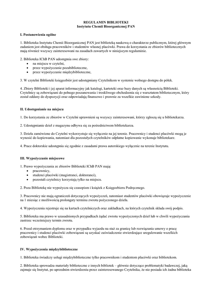 REGULAMIN BIBLIOTEKI Instytutu Chemii Bioorganicznej PAN I. Postanowienia ogólne 1. Biblioteka Instytutu Chemii Bioorganicznej PAN jest biblioteką naukową o charakterze publicznym, której głównym zadaniem jest obsługa pracowników i studentów własnej placówki. Prawa do korzystania ze zbiorów bibliotecznych mają również wszyscy zainteresowani na zasadach zawartych w niniejszym regulaminie. 2. Biblioteka IChB PAN udostępnia swe zbiory: na miejscu w czytelni, przez wypożyczanie pozabiblioteczne, przez wypożyczanie międzybiblioteczne, 3. W czytelni Biblioteki księgozbiór jest udostępniany Czytelnikom w systemie wolnego dostępu do półek. 4. Zbiory Biblioteki i jej aparat informacyjny jak katalogi, kartoteki oraz bazy danych są własnością Biblioteki. Czytelnicy są zobowiązani do pełnego poszanowania i troskliwego obchodzenia się z warsztatem bibliotecznym, który został oddany do dyspozycji oraz odpowiadają finansowo i prawnie za wszelkie zawinione szkody. II. Udostępnianie na miejscu 1. Do korzystania ze zbiorów w Czytelni uprawnieni są wszyscy zainteresowani, którzy zgłoszą się u bibliotekarza. 2. Udostępnianie dzieł z magazynu odbywa się za pośrednictwem bibliotekarza. 3. Dzieła zamówione do Czytelni wykorzystuje się wyłącznie na jej terenie. Pracownicy i studenci placówki mogą je wynosić do kopiowania, natomiast dla pozostałych czytelników odpłatne kopiowanie wykonuje bibliotekarz. 4. Prace doktorskie udostępnia się zgodnie z zasadami prawa autorskiego wyłącznie na terenie Instytutu. III. Wypożyczanie miejscowe 1. Prawo wypożyczania ze zbiorów Biblioteki IChB PAN mają: pracownicy, studenci placówki (magistranci, doktoranci), pozostali czytelnicy korzystają tylko na miejscu. 2. Poza Bibliotekę nie wypożycza się czasopism i książek z Księgozbioru Podręcznego. 3. Pracownicy nie mają ograniczeń dotyczących wypożyczeń, natomiast studentów placówki obowiązuje wypożyczenie na 1 miesiąc z możliwością prolongaty terminu zwrotu pożyczonego dzieła. 4. Wypożyczenia rejestruje się na kartach czytelniczych oraz zakładkach, na których czytelnik składa swój podpis. 5. Biblioteka ma prawo w uzasadnionych przypadkach żądać zwrotu wypożyczonych dzieł lub w chwili wypożyczania zastrzec wcześniejszy termin zwrotu. 6. Przed otrzymaniem dyplomu oraz w przypadku wyjazdu na staż za granicę lub rozwiązania umowy o pracę pracownicy i studenci placówki zobowiązani są uzyskać zaświadczenie stwierdzające uregulowanie wszelkich zobowiązań wobec Biblioteki. IV. Wypożyczenia międzybiblioteczne 1. Biblioteka świadczy usługi międzybiblioteczne tylko pracownikom i studentom placówki oraz bibliotekom. 2. Biblioteka sprowadza materiały biblioteczne z innych bibliotek – głównie dotyczące problematyki badawczej, jaką zajmuje się Instytut, po uprzednim stwierdzeniu przez zainteresowanego Czytelnika, że nie posiada ich żadna biblioteka w Poznaniu. Sprowadzone materiały udostępniane są na miejscu w Czytelni przez okres i na zasadach ustalonych przez bibliotekę wypożyczającą. 3. W przypadku zaistnienia wysokich kosztów sprowadzenia zamawianych pozycji Biblioteka może zażądać udziału czytelnika w tych kosztach. 4. Biblioteka zastrzega sobie prawo decyzji co do rodzaju i liczby wypożyczeń międzybibliotecznych. V. Zobowiązania i odpowiedzialność czytelników 1. Korzystający z Biblioteki są zobowiązani przestrzegać obowiązujących przepisów oraz szanować wypożyczone dzieła i mienie Biblioteki, a także zachować ciszę, czystość i porządek w niej zaprowadzony. 2. Użytkownik ponosi pełną odpowiedzialność materialną za zagubienie wypożyczonego dzieła oraz wszelkie jego uszkodzenia stwierdzone przy zwrocie, a nie zgłoszone przez Czytelnika przy wypożyczeniu. 3. W razie zagubienia lub zniszczenia dzieła Czytelnik jest zobowiązany (po uzgodnieniu z bibliotekarzem): dostarczyć identyczny egzemplarz, przekazać inne dzieła wartościowe dla Biblioteki – zgodnie z zasadami polityki gromadzenia zbiorów. 4. Wynoszenie przedmiotów będących własnością Biblioteki poza jej teren bez uprzedniego dopełnienia obowiązujących formalności jest zakazane i podlega sankcjom regulaminowym zatwierdzonym przez Dyrektora Instytutu. VI. Postanowienia końcowe 1. Czas otwarcia Biblioteki podany jest do wiadomości Czytelników. O czasowym zawieszeniu działalności usługowej Biblioteki użytkownicy informowani są stosownym komunikatem. 2. W portierni Instytutu jest wyłożona imienna lista upoważniająca wymienionych do korzystania z Biblioteki pod nieobecność bibliotekarza. 3. Uwagi i wnioski dotyczące działalności Biblioteki można zgłaszać Z-cy Dyrektora ds. Naukowych bezpośrednio, listownie lub pocztą elektroniczną. Regulamin wchodzi w życie z dniem 1 października 2004 r.