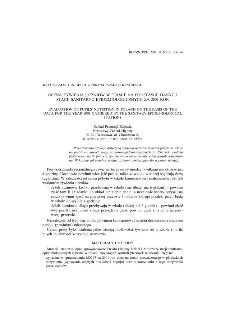 ROCZN. PZH, 2003, 54, NR 2, 183–196 MAŁGORZATA GAJEWSKA, BARBARA IGNAR-GOLINOWSKA OCENA ŻYWIENIA UCZNIÓW W POLSCE NA PODSTAWIE DANYCH STACJI SANITARNO-EPIDEMIOLOGICZNYCH ZA 2001 ROK EVALUATION OF PUPILS' NUTRITION IN POLAND ON THE BASIS OF THE DATA FOR THE YEAR 2001 GATHERED BY THE SANITARY-EPIDEMIOLOGICAL STATIONS Zakład Promocji Zdrowia Państwowy Zakład Higieny 00–791 Warszawa, ul. Chocimska 24 Kierownik: prof. dr hab. med. M. Miller Przedstawiono sytuację dotyczącą żywienia uczniów podczas pobytu w szkole na podstawie danych stacji sanitarno-epidemiologicznych za 2001 rok. Podjęto próbę oceny na ile potrzeby żywieniowe uczniów zostały w ten sposób zaspokojone. Wykazano jakie należy podjąć działania zmierzające do poprawy sytuacji. Pierwsza zasada racjonalnego żywienia to: przerwy między posiłkami nie dłuższe niż 4 godziny. Uczniowie powinni więc jeść posiłki także w szkole, w której spędzają dużą część dnia. W zależności od czasu pobytu w szkole konieczne jest realizowanie różnych wariantów żywienia uczniów. – Jeżeli uczniowie krótko przebywają w szkole (nie dłużej niż 6 godzin) – powinni zjeść tam II śniadanie lub obiad lub ciepłe danie, a uczniowie którzy przyszli na czczo powinni zjeść na pierwszej przerwie śniadanie i drugi posiłek, jeżeli będą w szkole dłużej niż 4 godziny; – Jeżeli uczniowie długo przebywają w szkole (dłużej niż 6 godzin) – powinni zjeść dwa posiłki; uczniowie którzy przyszli na czczo powinni zjeść śniadanie na pierwszej przerwie. Niezależnie od tych wariantów powinien funkcjonować system dostarczania uczniom napoju (produktu) mlecznego. Celem pracy było ustalenia jakie istnieją możliwości żywienia się w szkole i na ile z tych możliwości korzystają uczniowie. MATERIAŁY I METODY Materiał stanowiły dane sprawozdawcze Działu Higieny Dzieci i Młodzieży stacji sanitarnoepidemiologicznych zebrane w trakcie rutynowych kontroli placówek nauczania. Były to: – wykazane w sprawozdaniu MZ-53 za 2001 rok dane na temat prowadzonego w placówkach dożywiania (wydawanie ciepłych posiłków i napoju) oraz o korzystaniu z tego dożywiania przez uczniów, 184 M. Gajewska, B. Ignar-Golinowska Nr 2 – wykazane w sprawozdaniu uzupełniającym za 2001 r. dane o: – wydawaniu w placówkach napoju mlecznego – organizacji wspólnych śniadań – punktach sprzedaży oferujących produkty spożywcze w szkołach. Zgromadzone informacje dotyczą około 97% szkół w Polsce (w 2001 roku wskaźnik skontrolowania szkół znajdujących się w ewidencji stacji sanitarno-epidemiologicznych wyniósł 97,1%). Wyniki przedstawiono w podziale na poszczególne typy placówek: szkoły podstawowe o pełnym stopniu zorganizowania, filie szkół podstawowych, gimnazja, filie gimnazjów, licea ogólnokształcące, zasadnicze szkoły zawodowe, średnie szkoły zawodowe i szkoły pomaturalne. Dane liczbowe o badanych szkołach i uczniach do nich uczęszczających przedstawiono w tabeli I. Tabela I. Liczba szkół skontrolowanych przez stacje sanitarno-epidemiologiczne w 2001 r. w podziale na typy oraz liczba uczniów uczęszczających do tych szkół A number of schools controlled by sanitary-epidemiological stations in 2001, divided into types of schools and number of pupils attending those schools Typy szkół Szkoły podstawowe pełne Filie szkół podstawowych Gimnazja Filie gimnazjów Szkoły zasadnicze zawodowe Szkoły średnie zawodowe Licea ogólnokształcące Szkoły policealne/pomaturalne Ogółem Liczba szkół 14724 1234 6200 614 2236 5636 2242 971 33857 Liczba uczniów 3099602 43393 1542736 46888 371369 807340 709797 95040 6716165 WYNIKI Warunki do prowadzenia dożywiania Ustalono, że warunki do prowadzenia dożywiania posiadało 40,5% (13 697) szkół, a ciepłe posiłki wydawano w 34,8% (11 795) szkół. W około 5% szkół warunki nie były więc wykorzystane. Warunki do prowadzenia dożywiania posiadało około 54% szkół podstawowych o pełnym stopniu zorganizowania i około 52% gimnazjów. Dotyczyło to także około 32% filii gimnazjów, około 15% filii szkół podstawowych oraz około 15 – 27% szkół ponadpodstawowych i pomaturalnych. Opisaną sytuację, w podziale na poszczególne typy placówek ilustruje rycina 1. Wydawanie ciepłych posiłków Wszystkie gimnazja i większość szkół podstawowych, posiadających warunki do prowadzenia dożywiania, oferowały uczniom ciepłe posiłki. Nie wykorzystanie potencjału istniejących warunków odnosiło się przede wszystkim do filii szkół oraz do szkół ponadpodstawowych i pomaturalnych (ryc. 1). W „Instrukcji wypełniania druku MZ-53, Roczne sprawozdanie z działalności w zakresie higieny dzieci i młodzieży” podano, że „brak warunków do prowadzenia dożywiania” odnosi się do „placówek, w których brak jest bloku żywienia (zaplecza kuchennego i jadalni) lub innego miejsca możliwego do wykorzystania na przygotowanie i wydawanie ciepłych posiłków”. Prawdopodobnie w szkołach filialnych częsta była Nr 2 Ryc. 1. Ocena żywienia uczniów 185 186 M. Gajewska, B. Ignar-Golinowska Nr 2 sytuacja, gdy kontrolujący placówkę ocenił, że warunki były, a kierownictwo szkoły uznawało je za niewystarczające do przyrządzania posiłków. Jeśli chodzi o szkoły ponadpodstawowe i pomaturalne należy brać pod uwagę, że często dożywianie nie było prowadzone, ponieważ nie było chętnych do konsumpcji. Korzystanie przez uczniów z ciepłych posiłków Odsetek uczniów korzystających z ciepłych posiłków (16,1% wszystkich uczniów skontrolowanych szkół czyli 1 090 535 osób) wydaje się być bardzo mały w odniesieniu do istniejących placówek wydających ciepłe posiłki (34,8% szkół). Sytuację w poszczególnych typach szkół ilustruje rycina 2. Posiłki wydawano w 49,4% szkół podstawowych i w 52,1% gimnazjów; z ciepłych dań korzystało 24,3% uczniów szkół podstawowych i 16