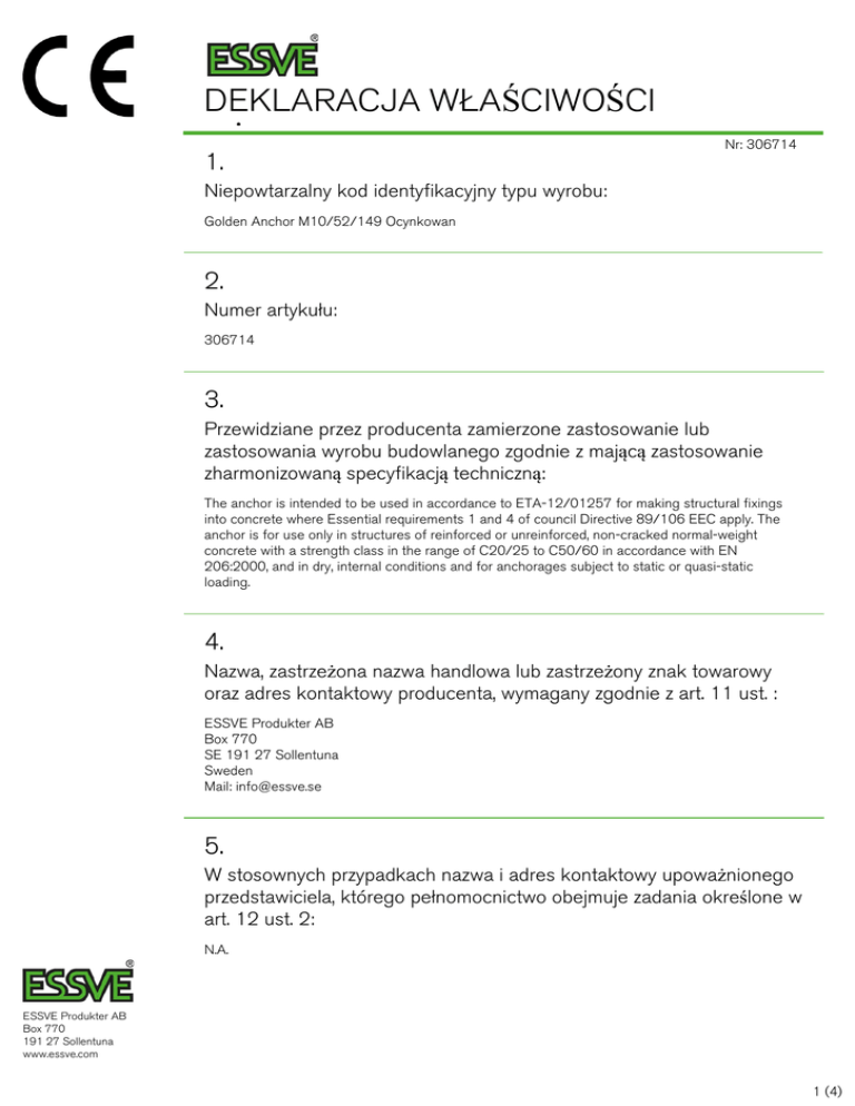 DEKLARACJA WŁAŚCIWOŚCI UŻYTKOWYCH 1. Nr: 306714 Niepowtarzalny kod identyfikacyjny typu wyrobu: Golden Anchor M10/52/149 Ocynkowan 2. Numer artykułu: 306714 3. Przewidziane przez producenta zamierzone zastosowanie lub zastosowania wyrobu budowlanego zgodnie z mającą zastosowanie zharmonizowaną specyfikacją techniczną: The anchor is intended to be used in accordance to ETA-12/01257 for making structural fixings into concrete where Essential requirements 1 and 4 of council Directive 89/106 EEC apply. The anchor is for use only in structures of reinforced or unreinforced, non-cracked normal-weight concrete with a strength class in the range of C20/25 to C50/60 in accordance with EN 206:2000, and in dry, internal conditions and for anchorages subject to static or quasi-static loading. 4. Nazwa, zastrzeżona nazwa handlowa lub zastrzeżony znak towarowy oraz adres kontaktowy producenta, wymagany zgodnie z art. 11 ust. : ESSVE Produkter AB Box 770 SE 191 27 Sollentuna Sweden Mail: [email protected] 5. W stosownych przypadkach nazwa i adres kontaktowy upoważnionego przedstawiciela, którego pełnomocnictwo obejmuje zadania określone w art. 12 ust. 2: N.A. ESSVE Produkter AB Box 770 191 27 Sollentuna www.essve.com 1 (4) DEKLARACJA WŁAŚCIWOŚCI UŻYTKOWYCH Nr: 306714 6. System lub systemy oceny i weryfikacji stałości właściwości użytkowych wyrobu budowlanego określone w załączniku V: System 1 7. W przypadku deklaracji właściwości użytkowych dotyczącej wyrobu budowlanego objętego normą zharmonizowaną: N.A przeprowadził(-a/-o): w systemie: i wydał(-a/-o): 8. W przypadku deklaracji właściwości użytkowych dotyczącej wyrobu budowlanego, dla którego wydana została europejska ocena techniczna: SITAC NB 0402 wydał(-a/-o): ETA 12/0257 na podstawie: ETAG 001, Part 1 and part 2, option 7 przeprowadził(-a/-o):(i) determination of the product type on the basis of type testing (including sampling), type calculation, tabulated values or descriptive documentation of the product; (ii) initial inspection of the manufacturing plant and of factory production control; (iii) continuous surveillance, assessment and evaluation of factory production control. w systemie: System 1 i wydał(-a/-o): certificate of conformity of the factory production control, test/calculation reports ESSVE Produkter AB Box 770 191 27 Sollentuna www.essve.com 2 (4) DEKLARACJA WŁAŚCIWOŚCI UŻYTKOWYCH Nr: 306714 9. Deklarowane właściwości użytkowe: Zasadnicze charakterystyki Właściwości użytkowe Zharmonizowana specyfikacja techniczna NRk,s [kN] 23.9 ETA-12/0257 γMs 1.5 ETA-12/0257 NRk,p 16 ETA-12/0257 γ2 1.4 ETA-12/0257 γMp 1.5 ETA-12/0257 hef 70 ETA-12/0257 scr,N 3xhef ETA-12/0257 scr,sp 6xhef ETA-12/0257 Ccr,N 1,5xhef ETA-12/0257 Ccr,sp 3xhef ETA-12/0257 γMc =γM,sp 1.5 ETA-12/0257 Tension load in non-cracked concrete C20/25 to 50/60 7.6 ETA-12/0257 δN0 [mm] 1.6 ETA-12/0257 δN∞ 2.9 ETA-12/0257 VRk,s [kN] 14.5 ETA-12/0257 γMs (shearload) 1.25 ETA-12/0257 MRk,s [Nm] 37.3 ETA-12/0257 k 2 ETA-12/0257 lf 70 ETA-12/0257 dnom 10 ETA-12/0257 Shear load in non-cracked concrete C20/25 to C50/60 [kN] 8 ETA-12/0257 δV0 1 ETA-12/0257 δV∞ 1.5 ETA-12/0257 ESSVE Produkter AB Box 770 191 27 Sollentuna www.essve.com 3 (4) DEKLARACJA WŁAŚCIWOŚCI UŻYTKOWYCH Nr: 306714 10. Właściwości użytkowe wyrobu określone w pkt 1 i 2 są zgodne z właściwościami użytkowymi deklarowanymi w pkt 9. Niniejsza deklaracja właściwości użytkowych wydana zostaje na wyłączną odpowiedzialność producenta określonego w pkt 4. W imieniu producenta podpisał(-a): Sebastian Athler, Product Developer/Technical expert – Fasteners (nazwisko i stanowisko) Sollentuna 2013-06-28 (miejsce i data wydania) (podpis) ESSVE Produkter AB Box 770 191 27 Sollentuna www.essve.com 4 (4)