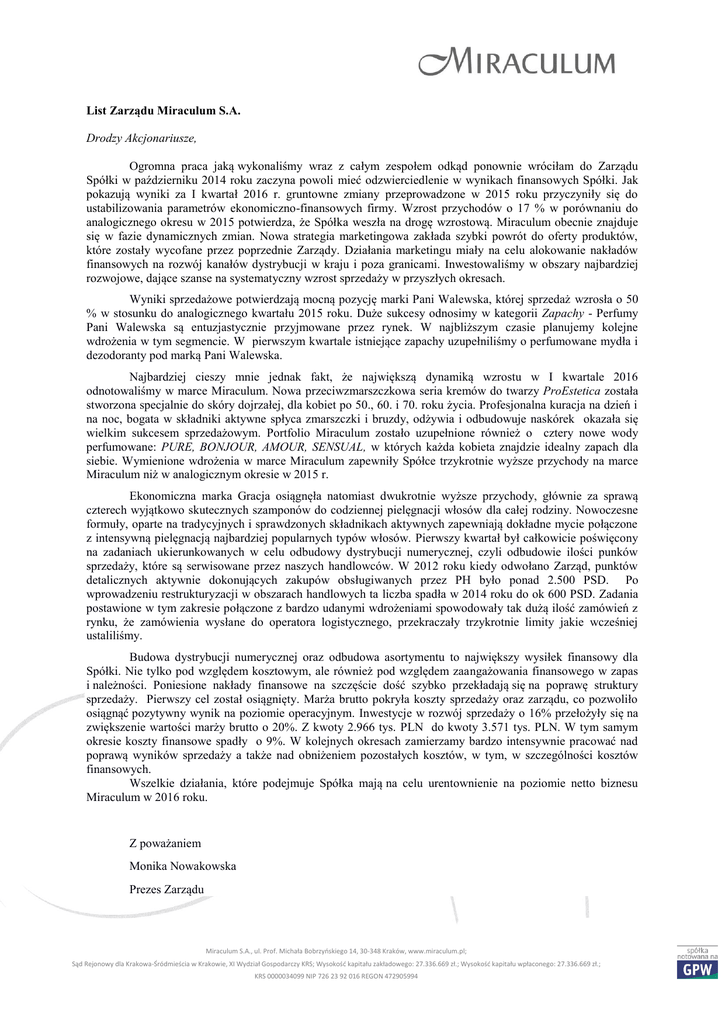 List Zarządu Miraculum S.A. Drodzy Akcjonariusze, Ogromna praca jaką wykonaliśmy wraz z całym zespołem odkąd ponownie wróciłam do Zarządu Spółki w październiku 2014 roku zaczyna powoli mieć odzwierciedlenie w wynikach finansowych Spółki. Jak pokazują wyniki za I kwartał 2016 r. gruntowne zmiany przeprowadzone w 2015 roku przyczyniły się do ustabilizowania parametrów ekonomiczno-finansowych firmy. Wzrost przychodów o 17 % w porównaniu do analogicznego okresu w 2015 potwierdza, że Spółka weszła na drogę wzrostową. Miraculum obecnie znajduje się w fazie dynamicznych zmian. Nowa strategia marketingowa zakłada szybki powrót do oferty produktów, które zostały wycofane przez poprzednie Zarządy. Działania marketingu miały na celu alokowanie nakładów finansowych na rozwój kanałów dystrybucji w kraju i poza granicami. Inwestowaliśmy w obszary najbardziej rozwojowe, dające szanse na systematyczny wzrost sprzedaży w przyszłych okresach. Wyniki sprzedażowe potwierdzają mocną pozycję marki Pani Walewska, której sprzedaż wzrosła o 50 % w stosunku do analogicznego kwartału 2015 roku. Duże sukcesy odnosimy w kategorii Zapachy - Perfumy Pani Walewska są entuzjastycznie przyjmowane przez rynek. W najbliższym czasie planujemy kolejne wdrożenia w tym segmencie. W pierwszym kwartale istniejące zapachy uzupełniliśmy o perfumowane mydła i dezodoranty pod marką Pani Walewska. Najbardziej cieszy mnie jednak fakt, że największą dynamiką wzrostu w I kwartale 2016 odnotowaliśmy w marce Miraculum. Nowa przeciwzmarszczkowa seria kremów do twarzy ProEstetica została stworzona specjalnie do skóry dojrzałej, dla kobiet po 50., 60. i 70. roku życia. Profesjonalna kuracja na dzień i na noc, bogata w składniki aktywne spłyca zmarszczki i bruzdy, odżywia i odbudowuje naskórek okazała się wielkim sukcesem sprzedażowym. Portfolio Miraculum zostało uzupełnione również o cztery nowe wody perfumowane: PURE, BONJOUR, AMOUR, SENSUAL, w których każda kobieta znajdzie idealny zapach dla siebie. Wymienione wdrożenia w marce Miraculum zapewniły Spółce trzykrotnie wyższe przychody na marce Miraculum niż w analogicznym okresie w 2015 r. Ekonomiczna marka Gracja osiągnęła natomiast dwukrotnie wyższe przychody, głównie za sprawą czterech wyjątkowo skutecznych szamponów do codziennej pielęgnacji włosów dla całej rodziny. Nowoczesne formuły, oparte na tradycyjnych i sprawdzonych składnikach aktywnych zapewniają dokładne mycie połączone z intensywną pielęgnacją najbardziej popularnych typów włosów. Pierwszy kwartał był całkowicie poświęcony na zadaniach ukierunkowanych w celu odbudowy dystrybucji numerycznej, czyli odbudowie ilości punków sprzedaży, które są serwisowane przez naszych handlowców. W 2012 roku kiedy odwołano Zarząd, punktów detalicznych aktywnie dokonujących zakupów obsługiwanych przez PH było ponad 2.500 PSD. Po wprowadzeniu restrukturyzacji w obszarach handlowych ta liczba spadła w 2014 roku do ok 600 PSD. Zadania postawione w tym zakresie połączone z bardzo udanymi wdrożeniami spowodowały tak dużą ilość zamówień z rynku, że zamówienia wysłane do operatora logistycznego, przekraczały trzykrotnie limity jakie wcześniej ustaliliśmy. Budowa dystrybucji numerycznej oraz odbudowa asortymentu to największy wysiłek finansowy dla Spółki. Nie tylko pod względem kosztowym, ale również pod względem zaangażowania finansowego w zapas i należności. Poniesione nakłady finansowe na szczęście dość szybko przekładają się na poprawę struktury sprzedaży. Pierwszy cel został osiągnięty. Marża brutto pokryła koszty sprzedaży oraz zarządu, co pozwoliło osiągnąć pozytywny wynik na poziomie operacyjnym. Inwestycje w rozwój sprzedaży o 16% przełożyły się na zwiększenie wartości marży brutto o 20%. Z kwoty 2.966 tys. PLN do kwoty 3.571 tys. PLN. W tym samym okresie koszty finansowe spadły o 9%. W kolejnych okresach zamierzamy bardzo intensywnie pracować nad poprawą wyników sprzedaży a także nad obniżeniem pozostałych kosztów, w tym, w szczególności kosztów finansowych. Wszelkie działania, które podejmuje Spółka mają na celu urentownienie na poziomie netto biznesu Miraculum w 2016 roku. Z poważaniem Monika Nowakowska Prezes Zarządu Miraculum S.A., ul. Prof. Michała Bobrzyńskiego 14, 30-348 Kraków, www.miraculum.pl; Sąd Rejonowy dla Krakowa-Śródmieścia w Krakowie, XI Wydział Gospodarczy KRS; Wysokość kapitału zakładowego: 27.336.669 zł.; Wysokość kapitału wpłaconego: 27.336.669 zł.; KRS 0000034099 NIP 726 23 92 016 REGON 472905994