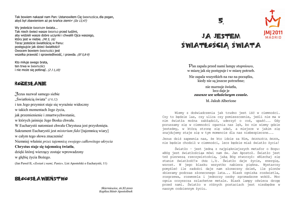 Tak bowiem nakazał nam Pan: Ustanowiłem Cię ŚWIATŁOŚCIĄ dla pogan, abyś był zbawieniem aŜ po krańce ziemi». (Dz 13,47) Wy jesteście ŚWIATŁEM świata... Tak niech świeci wasze ŚWIATŁO przed ludźmi, aby widzieli wasze dobre uczynki i chwalili Ojca waszego, który jest w niebie. (Mt 5, 16) Teraz jesteście światłością w Panu: postępujcie jak dzieci światłości! Owocem bowiem ŚWIATŁOŚCI jest wszelka prawość i sprawiedliwość, i prawda. (Ef 5,8-9) 5. JA JESTEM Światłością Świata Kto miłuje swego brata, ten trwa w ŚWIATŁOŚCI i nie moŜe się potknąć. (2 J 1,10) Pan zapala przed nami lampy stopniowo, w miarę jak się postępuje i w miarę potrzeb. Nie zapala wszystkich na raz na początku, kiedy nie są jeszcze potrzebne; Rozesłanie nie marnuje światła, lecz daje je zawsze we właściwym czasie. Jezus nazwał samego siebie „Światłością świata” (J 8,12) i ten Jego przymiot staje się wyraźnie widoczny w takich momentach Jego Ŝycia, jak przemienienie i zmartwychwstanie, w których jaśnieje Jego Boska chwała. W Eucharystii natomiast chwała Chrystusa jest przysłonięta. Sakrament Eucharystii jest misterium fidei [tajemnicą wiary] w całym tego słowa znaczeniu! Niemniej właśnie przez tajemnicę swojego całkowitego ukrycia Chrystus staje się tajemnicą światła, dzięki której wierzący zostaje wprowadzony w głębię Ŝycia BoŜego. (Jan Paweł II, «Zostań z nami, Panie», List Apostolski o Eucharystii, 11) Błogosławieństwo Skierniewice, 16.XI.2010 Kaplica Sióstr Apostolinek bł. Jakub Alberione Wiemy z doświadczenia jak trudno jest iść w ciemności. Czy to będzie las, czy ulica czy pomieszczenie, jeśli nie ma w nim światła moŜna zabłądzić, uderzyć o coś, upaść... Gdy poruszamy się w ciemności ogarnia nas lęk, bo nie wiemy gdzie jesteśmy, w którą stronę się udać, a miejsce w jakim się znajdujemy staje się w tym momencie dla nas niebezpieczne... Jezus dziś zapewnia nas, Ŝe kto idzie za Nim, ŚWIATŁOŚCIĄ ŚWIATA, nie będzie chodził w ciemności, lecz będzie miał światło Ŝycia! Światło – jest jedną z najpiękniejszych metafor o Bogu: «Bóg jest światłością» mówi nam św. Jan Apostoł. Światło jest teŜ pierwszą rzeczywistością, jaką Bóg stworzył: «Niechaj się stanie światłość!» (Rdz 1,3). Światło daje Ŝycie, energię, wzrost. W jego blasku wszystko nabiera piękna. Wystarczy pomyśleć ile radości daje nam słoneczny dzień, ile plonów zbieramy podczas słonecznego lata... Blask ogniska rozświetla, rozgrzewa, rozwesela i jednoczy osoby zgromadzone wokół. Moc ognia oczyszcza szlachetne metale. Blask lampy oświeca drogę przed nami. Światło w róŜnych postaciach jest niezbędne w naszym codziennym Ŝyciu. Oprócz zewnętrznego piękna, światło ma teŜ swój wymiar wewnętrzny, prowadzi nas do poznania prawdy: «Twoje słowo jest lampą dla moich stóp i światłem na mojej ścieŜce» (Ps 119,105). Od nas zaleŜy czy przyjmiemy zaproszenie Chrystusa, aby iść za NIM, iść w świetle Jego miłości, czy pozostaniemy uparci jak faryzeusze, zamknięci we własnych poglądach, skoncentrowani tylko na sobie i bojący się zbliŜyć do światła, gdyŜ «Światło przyszło na świat, lecz ludzie bardziej umiłowali ciemność aniŜeli światło: bo złe były ich uczynki. KaŜdy bowiem, kto się dopuszcza nieprawości, nienawidzi światła i nie zbliŜa się do światła, aby nie potępiono jego uczynków. Kto spełnia wymagania prawdy, zbliŜa się do światła, aby się okazało, Ŝe jego uczynki są dokonane w Bogu» (J 3,19-21). Z Ewangelii św. Jana (J 8,12-18) A oto znów przemówił do nich Jezus tymi słowami: «Ja jestem ŚWIATŁOŚCIĄ ŚWIATA. Kto idzie za Mną, nie będzie chodził w ciemności, lecz będzie miał światło życia». Rzekli do Niego faryzeusze: «Ty sam o sobie wydajesz świadectwo. Świadectwo Twoje nie jest prawdziwe». W odpowiedzi rzekł do nich Jezus: «Nawet jeżeli Ja sam o sobie wydaję świadectwo, świadectwo moje jest prawdziwe, bo wiem skąd przyszedłem i dokąd idę. Wy zaś nie wiecie, ani skąd przychodzę, ani dokąd idę. Wy wydajecie sąd według zasad tylko ludzkich. Ja nie sądzę nikogo. A jeśli nawet będę sądził, to sąd mój jest prawdziwy, ponieważ Ja nie jestem sam, lecz Ja i Ten, który Mnie posłał. Także w waszym Prawie jest napisane, że świadectwo dwóch ludzi jest prawdziwe. Oto Ja sam wydaję świadectwo o sobie samym oraz świadczy o Mnie Ojciec, który Mnie posłał». Pomyśl 3. «Będzie miał światło życia». Słowo Jezusa jest życiem i daje życie! Im bardziej będziesz Go słuchał, tym bardziej będzie cię oświecać i rozgrzewać twoje serce. Przebywając w Jego Obecności staniesz się osobą promienną, radosną i ciepłą. Staniesz się PROMIENIEM ŚWIATŁA dla innych! Gdzie w sposób szczególny pragniesz nieść to światło? Antyfona Jezu, Tyś jest światłością mej duszy Niech ciemność ma nie przemawia do mnie już. Jezu, Tyś jest światłością mej duszy Daj mi moc przyjąć dziś miłość Twą! Bóg jest ŚWIATŁOŚCIĄ, a nie ma w Nim Ŝadnej ciemności. (1 J 1,5) Błogosław, duszo moja, Pana! O BoŜe mój, Panie, jesteś bardzo wielki! Odziany we wspaniałość i majestat, ŚWIATŁEM okryty jak płaszczem (Ps 104,2) W Nim było Ŝycie, a Ŝycie było ŚWIATŁOŚCIĄ ludzi, a ŚWIATŁOŚĆ w ciemności świeci i ciemność jej nie ogarnęła. (J 1,4-5) Twoje słowo jest lampą dla moich stóp i ŚWIATŁEM na mojej ścieŜce (Ps 119,105) Moje oczy ujrzały Twoje zbawienie, któreś przygotował wobec wszystkich narodów: ŚWIATŁO na oświecenie pogan i chwałę ludu Twego, Izraela». (Łk 2, 30-32) Jezus przemienił się wobec nich: twarz Jego ZAJAŚNIAŁA JAK SŁOŃCE, odzienie zaś stało się BIAŁE JAK ŚWIATŁO.(Mt 17,2) 1. «Ja jestem światłością świata»... Przypomnij sobie sytuacje, kiedy doświadczyłeś, że Jezus jest Światłością two
