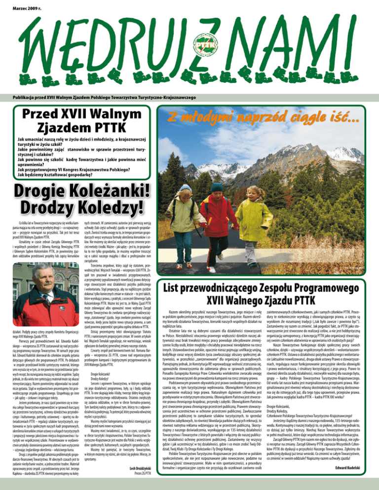 Marzec 2009 r. Publikacja przed XVII Walnym Zjazdem Polskiego Towarzystwa Turystyczno-Krajoznawczego Przed XVII Walnym Zjazdem PTTK Jak umacniać naszą rolę w życiu dzieci i młodzieży, a krajoznawczej turystyki w życiu szkół? Jakie powinniśmy zająć stanowisko w sprawie przestrzeni turystycznej i szlaków? Jak powinno się szkolić kadrę Towarzystwa i jakie powinna mieć uprawnienia? Jak przygotowujemy VI Kongres Krajoznawstwa Polskiego? Jak będziemy kształtować gospodarkę? Drogie Koleżanki! Drodzy Koledzy! Co kilka lat w Towarzystwie rozpoczyna się wielka kampania mająca na celu ocenę przebytej drogi i – co najważniejsze – przyjęcie rozwiązań na przyszłość. Tak jest też teraz przed XVII Walnym Zjazdem PTTK. Uznaliśmy w czasie zebrań Zarządu Głównego PTTK i wspólnych posiedzeń z Główną Komisją Rewizyjną PTTK i Głównym Sądem Koleżeńskim PTTK, że powinniśmy zjazdom oddziałów przedstawić projekty lub zapisy kierunków działań. Podjęły pracę cztery zespoły Komitetu Organizacyjnego XVII Walnego Zjazdu PTTK. Pierwszy pod przewodnictwem kol. Edwarda Kudelskiego – wiceprezesa ZG PTTK zastanawiał się nad przyszłością programową naszego Towarzystwa. W ramach jego prac kol. Edward Kudelski skierował do członków zespołu pytania dotyczące głównych sfer programowych PTTK. Po debatach w zespole przedstawił krótki syntetyczny materiał, którego sens wyraża się w tym, że nie powinno się przedstawiać gotowych recept, bo rozwiązania muszą się rodzić wspólnie. Sądzę jednak, że dla wielu ten syntezujący materiał może się okazać niewystarczający. Razem powinniśmy odpowiadać na zasadnicze pytania. Stąd w wydawnictwie prezentujemy list przewodniczącego zespołu programowego. Uzupełniają go inne – jak sądzę – ciekawe i inspirujące teksty. Jestem przekonany, że nasz zjazd powinien się w imieniu całego Towarzystwa wypowiedzieć w sprawach kurczącej się przestrzeni turystycznej, ochrony dziedzictwa przyrodniczego i kulturowego, potrzeby ustawowej – opartej na doświadczeniach PTTK – regulacji szlaków turystycznych, usytuowania w życiu społecznym naszych kadr programowych, określenia kierunków zmian ustawy o usługach turystycznych i propozycji nowego jakościowo miejsca krajoznawstwa i turystyki we współczesnej szkole. Prezentowane w wydawnictwie artykuły i doniesienia powinny ułatwić nam wytyczenie – używając żeglarskiego określenia – właściwego kursu. Drugi z zespołów podjął założenia problematyki gospodarczo-finansowej Towarzystwa. W obecnych czasach jest to zadanie niesłychanie ważne, a jednocześnie trudne. Materiał opracowany przez zespół, a przedstawiony przez kol. Jerzego Kapłona – skarbnika ZG PTTK również prezentujemy na kolej- nych stronach. W zamierzeniu autorów jest pierwszą wersją uchwały (lub części uchwały) zjazdu w sprawach gospodarczych. Zwrócić trzeba uwagę na to, że tempo przemian gospodarczych wręcz wymusza formułę określenia kierunków i celów. Nie możemy się określać wyłącznie przez zmienne przecież metody i środki. Ważne – jak sądzę – jest to, że gospodarka to nie tylko gospodarka, że musimy wspólnie troszczyć się o całość naszego majątku i dbać o profesjonalne nim zarządzanie. Trzeciemu zespołowi, który zajął się statutem, przewodniczył kol. Wojciech Tomalak – wiceprezes GSK PTTK. Zespół ten pracował w świadomości przygotowywanych, a przynajmniej sygnalizowanych nowelizacji prawa dotyczącego stowarzyszeń oraz działalności pożytku publicznego i wolontariatu. Stąd propozycja, aby na najbliższym zjeździe dokonać tylko koniecznych zmian w statucie – to jest takich, które wynikają z prawa, z praktyki, z orzeczeń Głównego Sądu Koleżeńskiego PTTK. Ważne też jest to, że Walny Zjazd PTTK może zobowiązać albo upoważnić nowo wybrany Zarząd Główny Towarzystwa do zwołania specjalnego nadzwyczajnego „statutowego” zjazdu. Jego zwołanie powinno nastąpić wówczas, kiedy jasna będzie nowa sytuacja prawna, a sam zjazd powinna poprzedzić specjalna ogólna debata w PTTK. Dzisiaj prezentujemy tekst obowiązującego Statutu PTTK z naniesionymi propozycjami zmian. W swoim artykule kol. Wojciech Tomalak sygnalizuje, nie wartościując, wnioski zgłaszane do bardziej generalnej zmiany naszego statutu. Czwarty zespół pod kierownictwem kol. Romana Bargieła – wiceprezesa ZG PTTK, czuwa nad organizacyjnym przebiegiem kampanii i logistycznymi przygotowaniami do XVII Walnego Zjazdu PTTK. Drogie Koleżanki! Drodzy Koledzy! Sercem i ogniwem Towarzystwa, w którym ogniskuje się jego działalność programowa, były, są i będą oddziały PTTK. To one skupiają koła i kluby, tworząc dobry krąg krajoznawczo-turystycznego oddziaływania. Ostatnio zwiększyły się zadania oddziałów, w tym w sferze formalno-prawnej. Tym bardziej należy podziękować tym, którzy to z odpowiedzialnością podejmują. To potencjał, który pozwala odważniej myśleć o przyszłości. Musimy myśleć kategoriami przyszłości stawiającej już dzisiaj przed nami nowe wyzwania. Musimy mieć świadomość, że to, co czyni, szczególnie w sferze turystyki i krajoznawstwa, Polskie Towarzystwo Turystyczno-Krajoznawcze jest ważne dla Polski z wielu względów: społecznych, kulturowych, socjalnych i gospodarczych. Musimy też pamiętać, że tworzymy Towarzystwo, w którym możemy się różnić, ale różnić się pięknie. Wierzę, że sprostamy. Lech Drożdżyński Prezes ZG PTTK List przewodniczącego Zespołu Programowego XVII Walnego Zjazdu PTTK Razem określmy przyszłość naszego Towarzystwa, jego miejsce i rolę w polskim społeczeństwie, jego miejsce i rolę jutro i pojutrze. Razem określmy kierunki działania Towarzystwa, kierunki naszych wspólnych działań na najbliższe lata. Ostatnie lata nie są dobrymi czasami dla działalności stowarzyszeń w Polsce. Niestabilność otocze