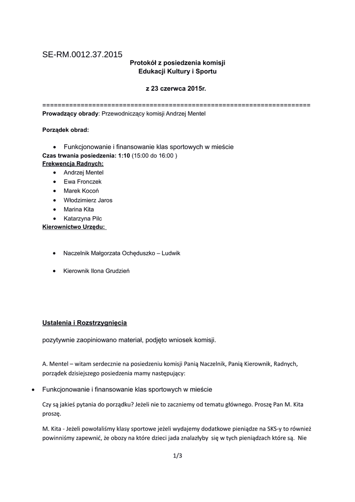 SE-RM.0012.37.2015 Protokół z posiedzenia komisji Edukacji Kultury i Sportu z 23 czerwca 2015r. ====================================================================== Prowadzący obrady: Przewodniczący komisji Andrzej Mentel Porządek obrad: Funkcjonowanie i finansowanie klas sportowych w mieście Czas trwania posiedzenia: 1:10 (15:00 do 16:00 ) Frekwencja Radnych: Andrzej Mentel Ewa Fronczek Naczelnik Małgorzata Ochęduszko – Ludwik Kierownik Ilona Grudzień Marek Kocoń Włodzimierz Jaros Marina Kita Katarzyna Pilc Kierownictwo Urzędu: Ustalenia i Rozstrzygnięcia pozytywnie zaopiniowano materiał, podjęto wniosek komisji. A. Mentel – witam serdecznie na posiedzeniu komisji Panią Naczelnik, Panią Kierownik, Radnych, porządek dzisiejszego posiedzenia mamy następujący: Funkcjonowanie i finansowanie klas sportowych w mieście Czy są jakieś pytania do porządku? Jeżeli nie to zaczniemy od tematu głównego. Proszę Pan M. Kita proszę. M. Kita - Jeżeli powołaliśmy klasy sportowe jeżeli wydajemy dodatkowe pieniądze na SKS-y to również powinniśmy zapewnić, że obozy na które dzieci jada znalazłyby się w tych pieniądzach które są. Nie 1/3 SE-RM.0012.37.2015 może być tak żeby obciążać rodziców. Jeżeli nas nie stać to zamknąć wszystko i dać sobie z tym spokój. Uważam ze powinny być lepsze warunki dresowe, butowe na to wszystko muszą się znaleźć pieniądze. I. Grudzień – na klasy sportowe idzie 164 164 zł a koszt klas sportowych wynagrodzenie badania plus kadra to koszt ponad 224 477 zł, kadra trenerska to 199 000 zł, czyli gmina dokłada już na samych trenerów. A. Mentel – szkoła jest organizatorem obozu. Czy pani kierownik może sprawdzić jak to wygląda w gminach ościennych. Kto finansuje klasy sportowe, czy są to środki klubowe czy gminne? I. Grudzień – na chwilę obecną nie potrafię odpowiedzieć, ale zorientuje się. E. Fronczek – są rożne metody finansowania z tego, co wiem. Ja zawsze spotykam się w czerwcu z rodzicami klas i rozmawiamy o tym i jest to duży wydatek we wrześniu dla rodziców tym bardziej trzeba książki kopić itp. Dobrze żeby miasto wyszło z taką propozycja. M. Kita – trzeba zrobić takie warunki żeby od nas nie odchodzili tylko żeby do nas przychodzili. A. Mentel – zgadzam się z panem Marianem. M. Kita – wszystkie dzieci są jednakowe, finansowaliśmy dodatkowo dzieci biedniejsze w poszczególnych kadencjach. Więcej szacunku dla tych dzieci, nie mops, nie mama tylko jedno źródło finansowania i to tyle. M. Kocoń – ja myślę, że w skali miasta to nie są duże pieniądze E. Fronczek – Koszt stroju sportowego to ok. 120 zł dla siatkarzy. A. Mentel – większym problemem zawsze obóz jest niż stroje. Zawsze szukamy sponsorów żeby ten strój kosztował jak najmniej. Myślę, że moglibyśmy spróbować w przyszłym roku. Żeby uczniom zaproponować utworze klasy sportowej w liceum to uczniom i rodzicom należy złożyć taka ofertę i się zastanowić. M. Kita- odczytam wniosek „Finansowanie w całości obozów sportowych dla klas sportowych. Jednocześnie zakup strojów sportowych, butów itp. Uczynić pierwszy krok w kierunku dożywiania dzieci z klas sportowych „ A. Mentel – dobrze głosujemy wniosek Za - 6 Wstrz - 0 Przeciw - 0 Czy ktoś ma pytanie do głównego tematu funkcjonowania klas sportowych? 2/3 SE-RM.0012.37.2015 Przechodzimy do pkt 2 opiniowanie projektów uchwał Projekt 122 w sprawie powołania stałej Komisji Edukacji Kultury i Sportu Rady Miejskiej w Czeladzi, ustalenia jej przedmiotu działań i składu osobowego Za - 6 Przeciw - 0 Wstrz - 0 Miałem sugestie ostatnio żeby się zastanowić nad tematyka pracy, prosiłbym komisje o zastanowienie się, kolejna rzecz chciałbym zaproponować żeby przyjrzeć się demografii dzieci w mieście, jak będzie wyglądała ilość dzieci w stosunku do etatów nauczycieli. Protokołował Mateusz Bochenek Przewodniczący Andrzej Mentel Data napisania protokołu :3.07.2015 Data podpisania protokołu :......................... Data umieszczenia protokołu w BIP : …........... 3/3