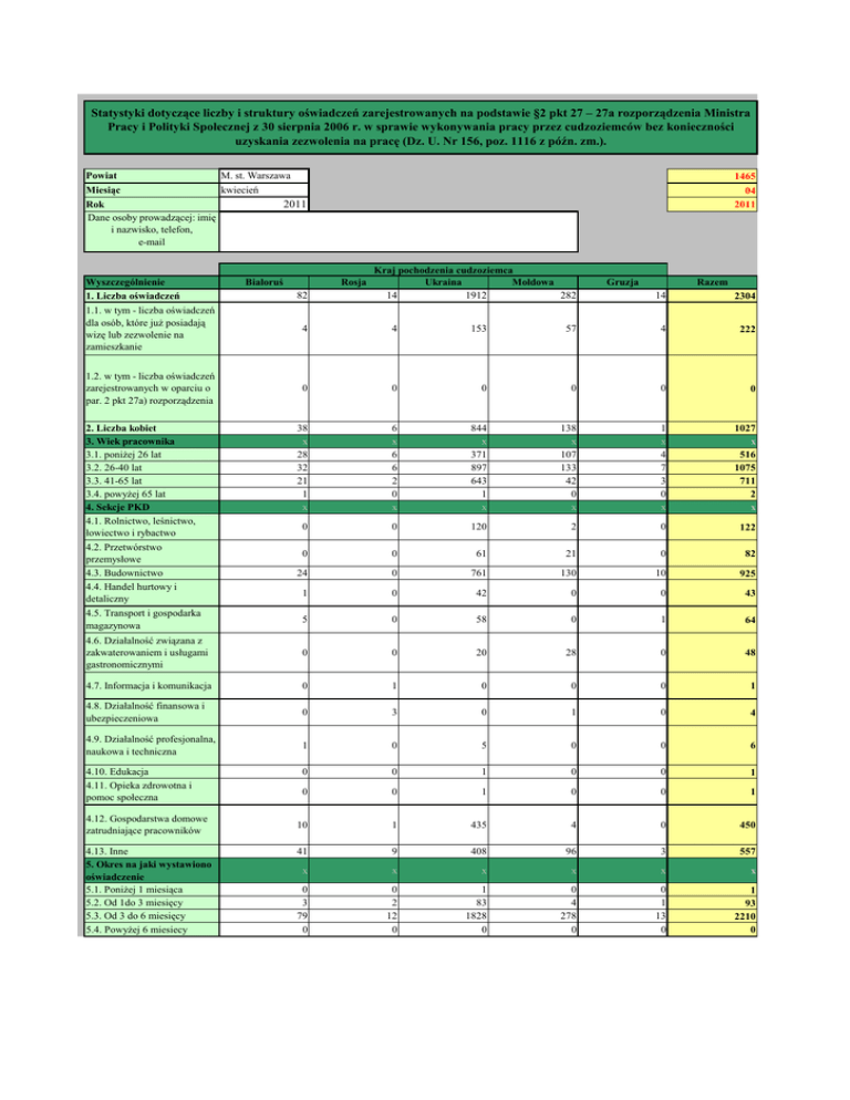 Statystyki dotyczące liczby i struktury oświadczeń zarejestrowanych na podstawie §2 pkt 27 – 27a rozporządzenia Ministra Pracy i Polityki Społecznej z 30 sierpnia 2006 r. w sprawie wykonywania pracy przez cudzoziemców bez konieczności uzyskania zezwolenia na pracę (Dz. U. Nr 156, poz. 1116 z późn. zm.). Powiat Miesiąc M. st. Warszawa kwiecień 2011 Rok Dane osoby prowadzącej: imię i nazwisko, telefon, e-mail Wyszczególnienie 1. Liczba oświadczeń 1465 04 2011 Białoruś Rosja 82 Kraj pochodzenia cudzoziemca Ukraina Mołdowa 14 1912 282 Gruzja Razem 14 2304 1.1. w tym - liczba oświadczeń dla osób, które juŜ posiadają wizę lub zezwolenie na zamieszkanie 4 4 153 57 4 222 1.2. w tym - liczba oświadczeń zarejestrowanych w oparciu o par. 2 pkt 27a) rozporządzenia 0 0 0 0 0 0 38 x 28 32 21 1 x 6 x 6 6 2 0 x 844 x 371 897 643 1 x 138 x 107 133 42 0 x 1 x 4 7 3 0 x 1027 x 516 1075 711 2 x 0 0 120 2 0 122 0 0 61 21 0 82 24 0 761 130 10 925 1 0 42 0 0 43 4.5. Transport i gospodarka magazynowa 5 0 58 0 1 64 4.6. Działalność związana z zakwaterowaniem i usługami gastronomicznymi 0 0 20 28 0 48 4.7. Informacja i komunikacja 0 1 0 0 0 1 4.8. Działalność finansowa i ubezpieczeniowa 0 3 0 1 0 4 4.9. Działalność profesjonalna, naukowa i techniczna 1 0 5 0 0 6 0 0 1 0 0 1 0 0 1 0 0 1 10 1 435 4 0 450 41 9 408 96 3 557 2. Liczba kobiet 3. Wiek pracownika 3.1. poniŜej 26 lat 3.2. 26-40 lat 3.3. 41-65 lat 3.4. powyŜej 65 lat 4. Sekcje PKD 4.1. Rolnictwo, leśnictwo, łowiectwo i rybactwo 4.2. Przetwórstwo przemysłowe 4.3. Budownictwo 4.4. Handel hurtowy i detaliczny 4.10. Edukacja 4.11. Opieka zdrowotna i pomoc społeczna 4.12. Gospodarstwa domowe zatrudniające pracowników 4.13. Inne 5. Okres na jaki wystawiono oświadczenie 5.1. PoniŜej 1 miesiąca 5.2. Od 1do 3 miesięcy 5.3. Od 3 do 6 miesięcy 5.4. PowyŜej 6 miesiecy x x x x x x 0 3 79 0 0 2 12 0 1 83 1828 0 0 4 278 0 0 1 13 0 1 93 2210 0 nazwaPowiatu kodPowiatu2 Aleksandrowski 0401 Augustowski 2001 Bartoszycki 2801 Bełchatowski 1001 Będziński 2401 Bialski 0601 Białobrzeski 1401 Białogardzki 3201 Białostocki 2002 Bielski 2003 Bielski 2402 Bieruńsko-lędziński 2414 Bieszczadzki 1801 Biłgorajski 0602 Bocheński 1201 Bolesławiecki 0201 Braniewski 2802 Brodnicki 0402 Brzeski 1202 Brzeski 1601 Brzeziński 1021 Brzozowski 1802 Buski 2601 Bydgoski 0403 Bytowski 2201 Chełmiński 0404 Chełmski 0603 Chodzieski 3001 Chojnicki 2202 Choszczeński 3202 Chrzanowski 1203 Ciechanowski 1402 Cieszyński 2403 Czarnkowsko - Trzcianecki 3002 Częstochowski 2404 Człuchowski 2203 Dąbrowski 1204 Dębicki 1803 Drawski 3203 Działdowoski 2803 DzierŜoniowski 0202 Elbląski 2804 Ełcki 2805 Garwoliński 1403 Gdański 2204 GiŜycki 2806 Gliwicki 2405 Głogowski 0203 Głubczycki 1602 Gnieźnieński 3003 Goleniowski 3204 Golubsko-Dobrzyński 0405 Gołdapski 2818 Gorlicki 1205 Gorzowski 0801 Gostyniński 1404 Gostyński 3004 Górowski 0204 Grajewski 2004 Grodziski 1405 Grodziski 3005 Grójecki 1406 Grudziądzki 0406 Gryficki 3205 Gryfiński 3206 Hajnowski 2005 Hrubieszowski 0604 Iławski 2807 Inowrocławski 0407 Janowski 0605 Jarociński 3006 Jarosławski 1804 Jasielski 1805 Jaworski 0205 Jeleniogórski 0206 Jędrzejowski 2602 Kaliski 3007 miesiąc styczeń luty marzec kwiecień maj czerwiec lipiec sierpień wrzesień październik listopad grudzień numer 1 2 3 4 5 6 7 8 9 10 11 12 Kamiennogórski 0207 Kamieński 3207 Kartuski 2205 Kazimierski 2603 Kędzierzyńsko-Kozielski 1603 Kępiński 3008 Kętrzyński 2808 Kielecki 2604 Kluczborski 1604 Kłobucki 2406 Kłodzki 0208 Kolbuszowski 1806 Kolneński 2006 Kolski 3009 Kołobrzeski 3208 Konecki 2605 Koniński 3010 Koszaliński 3209 Kościański 3011 Kościerski 2206 Kozienicki 1407 Krakowski 1206 Krapkowicki 1605 Krasnostawski 0606 Kraśnicki 0607 Krośnieński 0802 Krośnieński 1807 Krotoszyński 3012 Kutnowski 1002 Kwidzyński 2207 Legionowski 1408 Legnicki 0209 Leski 1821 Leszczyński 3013 LeŜajski 1808 Lęborski 2208 Lidzbarski 2809 Limanowski 1207 Lipnowski 0408 Lipski 1409 Lubaczowski 1809 Lubański 0210 Lubartowski 0608 Lubelski 0609 Lubiński 0211 Lubliniecki 2407 Lwówecki 0212 Łańcucki 1810 Łaski 1003 Łęczycki 1004 Łęczyński 0610 Łobeski 3218 ŁomŜyński 2007 Łosicki 1410 Łowicki 1005 Łódzki wschodni 1006 Łukowski 0611 M. Biała Podlaska 0661 M. Białystok 2061 M. Bielsko-Biała 2461 M. Bydgoszcz 0461 M. Bytom 2462 M. Chełm 0662 M. Chorzów 2463 M. Częstochowa 2464 M. Dąbrowa Górnicza 2465 M. Elbląg 2861 M. Gdańsk 2261 M. Gdynia 2262 M. Gliwice 2466 M. Gorzów Wielkopolski 0861 M. Grudziądz 0462 M. Jastrzębie-Zdrój 2467 M. Jaworzno 2468 M. Jelenia Góra 0261 M. Kalisz 3061 M. Katowice 2469 M. Kielce 2661 M. Konin 3062 M. Koszalin 3261 M. Kraków 1261 M. Krosno 1861 M. Legnica 0262 M. Leszno 3063 M. Lublin 0663 M. ŁomŜa 2062 M. Łódź 1061 M. Mysłowice 2470 M. Nowy Sącz 1262 M. Olsztyn 2862 M. Opole 1661 M. Ostrołęka 1461 M. Piekary Śląskie 2471 M. Piotrków Trybunalski 1062 M. Płock 1462 M. Poznań 3064 M. Przemyśl 1862 M. Radom 1463 M. Ruda Śląska 2472 M. Rybnik 2473 M. Rzeszów 1863 M. Siedlce 1464 M. Siemianowice Ślaskie 2474 M. Skierniewice 1063 M. Słupsk 2263 M. Sopot 2264 M. Sosnowiec 2475 M. st. Warszawa 1465 M. Suwałki 2063 M. Szczecin 3262 M. Świętochłowice 2476 M. Świnoujście 3263 M. Tarnobrzeg 1864 M. Tarnów 1263 M. Toruń 0463 M. Tychy 2477 M. Włocławek 0464 M. Wrocław 0264 M. Zabrze 2478 M. Zamość 0664 M. Zielona Góra 0862 M. śory 2479 Makowski 1411 Malborski 2209 Miechowski 1208 Mielecki 1811 Międzychodzki 3014 Międzyrzecki 0803 Mikołowski 2408 Milicki 0213 Miński 1412 Mławski 1413 Mogileński 0409 Moniecki 2008 Mrągowski 2810 Myszkowski 2409 Myślenicki 1209 Myśliborski 3210 Nakielski 0410 Namysłowski 1606 Nidzicki 2811 NiŜański 1812 Nowodworski 1414 Nowodworski 2210 Nowomiejski 2812 Nowosądecki 1210 Nowosolski 0804 Nowotarski 1211 Nowotomyski 3015 Nyski 1607 Obornicki 3016 Olecki 2813 Oles