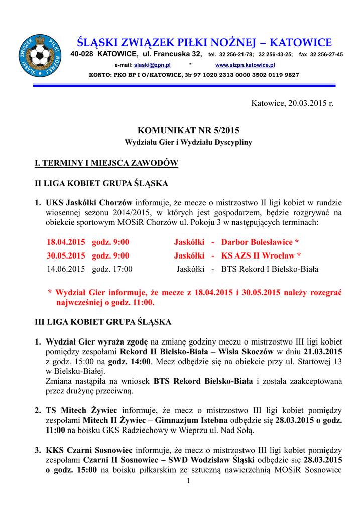ŚLĄSKI ZWIĄZEK PIŁKI NOŻNEJ – KATOWICE 40-028 KATOWICE, ul. Francuska 32, e-mail: [email protected] * tel. 32 256-21-78; 32 256-43-25; fax 32 256-27-45 www.slzpn.katowice.pl KONTO: PKO BP I O/KATOWICE, Nr 97 1020 2313 0000 3502 0119 9827 Katowice, 20.03.2015 r. KOMUNIKAT NR 5/2015 Wydziału Gier i Wydziału Dyscypliny I. TERMINY I MIEJSCA ZAWODÓW II LIGA KOBIET GRUPA ŚLĄSKA 1. UKS Jaskółki Chorzów informuje, że mecze o mistrzostwo II ligi kobiet w rundzie wiosennej sezonu 2014/2015, w których jest gospodarzem, będzie rozgrywać na obiekcie sportowym MOSiR Chorzów ul. Pokoju 3 w następujących terminach: 18.04.2015 godz. 9:00 Jaskółki - Darbor Bolesławice * 30.05.2015 godz. 9:00 Jaskółki - KS AZS II Wrocław * 14.06.2015 godz. 17:00 Jaskółki - BTS Rekord I Bielsko-Biała * Wydział Gier informuje, że mecze z 18.04.2015 i 30.05.2015 należy rozegrać najwcześniej o godz. 11:00. III LIGA KOBIET GRUPA ŚLĄSKA 1. Wydział Gier wyraża zgodę na zmianę godziny meczu o mistrzostwo III ligi kobiet pomiędzy zespołami Rekord II Bielsko-Biała – Wisła Skoczów w dniu 21.03.2015 z godz. 15:00 na godz. 14:00. Mecz odbędzie się na obiekcie przy ul. Startowej 13 w Bielsku-Białej. Zmiana nastąpiła na wniosek BTS Rekord Bielsko-Biała i została zaakceptowana przez drużynę przeciwną. 2. TS Mitech Żywiec informuje, że mecz o mistrzostwo III ligi kobiet pomiędzy zespołami Mitech II Żywiec – Gimnazjum Istebna odbędzie się 28.03.2015 o godz. 11:00 na boisku GKS Radziechowy w Wieprzu ul. Nad Sołą. 3. KKS Czarni Sosnowiec informuje, że mecz o mistrzostwo III ligi kobiet pomiędzy zespołami Czarni II Sosnowiec – SWD Wodzisław Śląski odbędzie się 28.03.2015 o godz. 15:00 na boisku piłkarskim ze sztuczną nawierzchnią MOSiR Sosnowiec 1 Al. Mireckiego 31 w Sosnowcu. 4. KKS Wisła Skoczów informuje, że mecze o mistrzostwo III ligi kobiet w rundzie wiosennej sezonu 2014/2015, w których jest gospodarzem, będzie rozgrywać w następujących terminach: Stadion MOSiR w Skoczowie przy ul. Sportowej 6: 28.03.2015 godz. 12:00 Wisła - LKS Wilki Wilcza 03.05.2015 godz. 16:00 Wisła - KKS Czarni II Sosnowiec 24.05.2015 godz. 13:30 Wisła - UKS Gamów Boisko LKS Ochaby 96 przy ul. Strażackiej 4: 18.04.2015 godz. 16:00 Wisła - UKS Gimnazjum Istebna IV LIGA GRUPA I 1. Wydział Gier wyraża zgodę na zmianę terminu meczu o mistrzostwo IV ligi grupy I pomiędzy zespołami RKS Grodziec – Ruch Radzionków z 21.03.2015 na dzień 22.03.2015 godz. 14:30. Zmiana nastąpiła na wniosek RKS Grodziec i została zaakceptowana przez drużynę przeciwną. 2. RKS Raków Częstochowa S.A. informuje, że mecze o mistrzostwo IV ligi grupy I w rundzie wiosennej sezonu 2014/2015, w których jest gospodarzem, będzie rozgrywać na Miejskim Stadionie Piłkarskim „Raków” w Częstochowie przy ul. Limanowskiego 83 w następujących terminach: 29.03.2015 godz. 11:00 Raków II - MLKS Woźniki 12.04.2015 godz. 11:00 Raków II - RKS Grodziec 26.04.2015 godz. 16:30 Raków II - LKS Przyszłość Ciochowice 10.05.2015 godz. 17:00 Raków II - LKS Polonia Poraj 23.05.2015 godz. 17:00 Raków II - KS Ruch Radzionków 31.05.2015 godz. 17:00 Raków II - KS Unia Ząbkowice 10.06.2015 godz. 18:00 Raków II - TS Gwarek Tarnowskie Góry 13.06.2015 godz. 17:00 Raków II - RKS Fortuna Gliwice 3. LKS Zieloni Żarki informuje, że mecze o mistrzostwo IV ligi grupy I w rundzie wiosennej sezonu 2014/2015, w których jest gospodarzem, będzie rozgrywać na obiekcie LKS Zieloni Żarki ul. Steinkellera 3 w Żarkach zgodnie z terminarzem rozgrywek: 2 28.03.2015 godz. 15:00 Zieloni - RKS Grodziec 11.04.2015 godz. 16:00 Zieloni - LKS Przyszłość Ciochowice 25.04.2015 godz. 16:30 Zieloni - LKS Polonia Poraj 09.05.2015 godz. 17:00 Zieloni - KS Ruch Radzionków 27.05.2015 godz. 18:00 Zieloni - RKS Raków II Częstochowa S.A. 06.06.2015 godz. 17:00 Zieloni - RKS Fortuna Gliwice 13.06.2015 godz. 17:00 Zieloni - MLKS Woźniki 4. BKS Sarmacja Będzin informuje, że mecze o mistrzostwo IV ligi grupy I w rundzie wiosennej sezonu 2014/2015, w których jest gospodarzem, będzie rozgrywać na boisku w Będzinie przy ul. Sportowej 6 w następujących terminach: 21.03.2015 godz. 15:00 Sarmacja - LKS Zieloni Żarki 04.04.2015 godz. 13:00 Sarmacja - RKS Raków II Częstochowa S.A. 19.04.2015 godz. 15:00 Sarmacja - RKS Fortuna Gliwice 02.05.2015 godz. 17:00 Sarmacja - MLKS Woźniki 09.05.2015 godz. 17:00 Sarmacja - KS Concordia Knurów 23.05.2015 godz. 17:00 Sarmacja - KS Slavia Ruda Śląska 10.06.2015 godz. 18:00 Sarmacja - KS Górnik Piaski IV LIGA GRUPA II 1. LKS Unia Turza Śląska informuje, że mecze o mistrzostwo IV ligi grupy II w rundzie wiosennej sezonu 2014/2015, w których jest gospodarzem, będzie rozgrywać w niedziele w godzinach podanych w terminarzu rozgrywek, za wyjątkiem terminów obligatoryjnych – z Krupińskim Suszec w środę 27 maja i z Fortecą Świerklany w sobotę 13 czerwca. 2. KS Unia Racibórz informuje, że zmienia godzinę meczu o mistrzostwo IV ligi grupy II pomiędzy zespołami Unia Racibórz – GKS Radziechowy-Wieprz w dniu 04.04.2015 z godz. 13:00 na godz. 11:00. Mecz odbędzie się na stadionie w Raciborzu przy ul. Srebrnej 12. 3. JSP Szczakowianka informuje, że zmienia miejsce rozgrania meczu o mistrzostwo IV ligi grupy II pomiędzy zespołami Szczakowianka Jaworzno – Czarni-Góral Żywiec w dniu 04.04.2015 godz. 13:00. Mecz odbędzie się na stadionie w Jaworznie przy ul. Krakowskiej 8 (zamiast przy ul. Kościuszki 1). 3 4. LKS Bełk informuje, że mecze o mistrzostwo IV ligi grupy II w rundzie wiosennej sezonu 2014/2015, w których jest gospodarzem, będzie rozgrywać na boisku w Bełku przy ul. Głównej w soboty zgodnie z terminarzem rozgrywek. KLASA OKRĘGOWA GRUPA I 1. LKS Znicz Jankowice informuje, że poniższe mecze o mistrzostwo Klasy Okręgowej grupy I w rundzie wiosennej sezonu 2014/2015, w których jest gospodarzem, będzie rozgrywać w niedziele: 29.03.2015 god