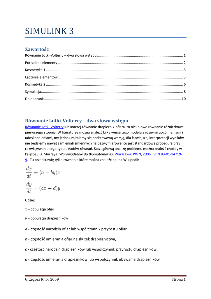 SIMULINK 3 Zawartość Równanie Lotki-Volterry – dwa słowa wstępu ........................................................................................ 1 Potrzebne elementy ................................................................................................................................ 2 Kosmetyka 1 ............................................................................................................................................ 3 Łączenie elementów ................................................................................................................................ 3 Kosmetyka 2 ............................................................................................................................................ 6 Symulacja................................................................................................................................................. 8 Do pobrania ........................................................................................................................................... 10 Równanie Lotki-Volterry – dwa słowa wstępu Równanie Lotki-Volterry lub inaczej równanie drapieżnik-ofiara, to nieliniowe równanie różniczkowe pierwszego stopnia. W literaturze można znaleźć kilka wersji tego modelu z różnymi uogólnieniami i udoskonaleniami, my jednak zajmiemy się podstawową wersją, dla łatwiejszej interpretacji wyników nie będziemy nawet zamieniali zmiennych na bezwymiarowe, co jest standardową procedurą przy rozwiązywaniu tego typu układów równań. Szczegółową analizę problemu można znaleźć choćby w książce J.D. Murraya: Wprowadzenie do Biomatematyki. Warszawa: PWN, 2006. ISBN 83-01-147199. Tu przedstawię tylko równania które można znaleźć np. na Wikipedii: Gdzie: x – populacja ofiar y – populacja drapieżników a - częstość narodzin ofiar lub współczynnik przyrostu ofiar, b - częstość umierania ofiar na skutek drapieżnictwa, c - częstość narodzin drapieżników lub współczynnik przyrostu drapieżników, d - częstość umierania drapieżników lub współczynnik ubywania drapieżników Grzegorz Knor 2009 Strona 1 Rozwiązaniem tych równań przy odpowiednich warunkach początkowych są oscylujące w czasie liczby osobników dwóch kategorii: Potrzebne elementy Mając równania opisujące populacje ofiar i drapieżców mamy już w zasadzie wszystko co jest nam potrzebne do zbudowania modelu. Wystarczy teraz tylko skompletować potrzebne elementy, a są to odpowiednio: • • • • • • • dwa Integratory – ponieważ mamy dwa wyrażenia do scałkowania dwa bloki Constans – odpowiadające stałym a i d dwa bloki Gain – odpowiadające stałym b i c dwa bloki Sum – do wykonania operacji dodawania i odejmowania w naszych równaniach dwa bloki Product – do wykonania mnożenia blok Scope i XY Graph – do wizualizacji wyniku blok Mux – do połączenia wejść do bloku Scope Specjalnie pominąłem biblioteki gdzie można odnaleźć poszczególne bloki, ponieważ samodzielne ich odszukanie pozwoli na łatwiejsze zapamiętanie ich lokalizacji. Przygotowane elementy powinny wyglądać mniej więcej tak: Grzegorz Knor 2009 Strona 2 Pozostało tylko połączyć elementy w jedną całość i wpisać odpowiednie wartości parametrów a, b, c, d i wartości początkowych. Kosmetyka 1 Zanim jednak Przejdziemy do połączenia elementów podpiszmy wybrane, aby ułatwić dalszą pracę. Zatem nazwijmy nasze Integratory literami x i y jako, że wynik całkowania daje nam właśnie wartości tych zmiennych w danej chwili czasu. Bloki Constant nazwijmy nazwami stałych a i d. Kolejne stałe kryją się pod blokami Gain – są to parametry b i c. Łączenie elementów Na początek proponuję połączyć wyjścia z bloków x i y z blokami b i c w celu pomnożenia ich przez odpowiednie stałe: Grzegorz Knor 2009 Strona 3 W kolejnym kroku dodajemy stałe a i d do odpowiednich iloczynów poprzez użycie bloków do sumowania Sum: Wyniki sumowania musimy następnie pomnożyć przez odpowiednie wartości populacji, czyli x oraz y, W tym celu użyjemy bloków Product. Wynik sumy łączymy z jednym wejściem tego bloku, a z drugiego wejścia „wyciągamy kabel” i „przylutowujemy” go do odpowiednich kabli wychodzących z Integratorów: Grzegorz Knor 2009 Strona 4 Teraz już możemy zamknąć nasz układ: Ostatnim krokiem będzie dołączenie do obwodu bloków rysujących nasze rozwiązanie. Zaproponowałem dwa bloki, ponieważ na jednym przedstawimy oscylacje liczby osobników (blok Scope), a na drugim narysujemy portret fazowy. Blok Scope ma jedno wejście (możemy zwiększyć liczbę wejść wybierając w preferencjach liczbę osi, nie mniej my chcemy narysować wynik na jednej osi), dlatego też musimy użyć bloku Mux, aby połączyć wartości x i y w jeden wektor (macierz). Po dołączeniu tych bloków skończony model może wyglądać jak poniżej: Grzegorz Knor 2009 Strona 5 Jeśli uważnie się przyjrzymy schematowi, widzimy, że zaproponowany portret fazowy będzie zawierał pochodne liczebności populacji, a nie same liczebności. Kosmetyka 2 Jeśli model wydaje się zbyt skomplikowany, proponuję zbudowanie dwóch podsystemów odpowiadających nawiasom w naszym wzorze wyjściowym. Takie bloki będą miały dwa wejścia i jedno wyjście: Grzegorz Knor 2009 Strona 6 A podsystemy powinny wyglądać tak: Jeśli ciężko jest nam zobaczyć które bloki są połączone za pomocą danego kabla, możemy wybrać z menu kontekstowego (klikając prawym przyciskiem myszy na konkretne połączenie) odpowiednie podświetlenie, np.: Grzegorz Knor 2009 Strona 7 Podświetlenie usuwamy za pomocą opcji Remove Highlighting. Symulacja Nasz model jest już gotowy, zatem możemy przejść do jego testowania. Poniżej przedstawiam wyniki dla następujących parametrów wejściowych: a = 1.2 b = 0.6 c = 0.3 d = 0.8 x(t=0) = 2 y(t=0) = 1 Należy pamiętać, że 
