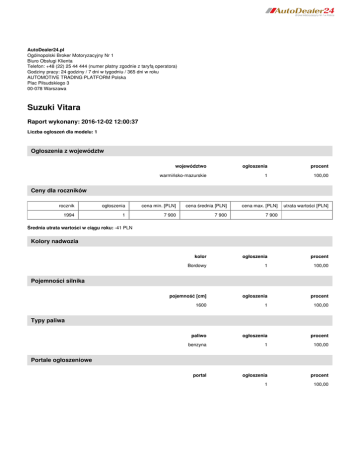 AutoDealer24.pl Ogólnopolski Broker Motoryzacyjny Nr 1 Biuro Obsługi Klienta Telefon: +48 (22) 25 44 444 (numer płatny zgodnie z taryfą operatora) Godziny pracy: 24 godziny / 7 dni w tygodniu / 365 dni w roku AUTOMOTIVE TRADING PLATFORM Polska Plac Piłsudskiego 3 00-078 Warszawa Suzuki Vitara Raport wykonany: 2016-12-02 12:00:37 Liczba ogłoszeń dla modelu: 1 Ogłoszenia z województw województwo ogłoszenia procent warmińsko-mazurskie 1 100,00 Ceny dla roczników rocznik ogłoszenia cena min. [PLN] cena średnia [PLN] cena max. [PLN] 1994 1 7 900 7 900 7 900 utrata wartości [PLN] Średnia utrata wartości w ciągu roku: -41 PLN Kolory nadwozia kolor ogłoszenia procent Bordowy 1 100,00 pojemność [cm] ogłoszenia procent 1600 1 100,00 paliwo ogłoszenia procent benzyna 1 100,00 portal ogłoszenia procent 1 100,00 Pojemności silnika Typy paliwa Portale ogłoszeniowe Powered by TCPDF (www.tcpdf.org)