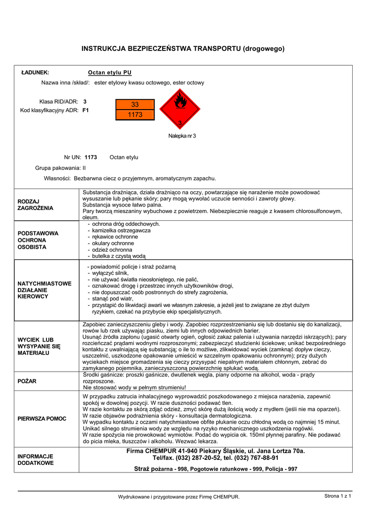 INSTRUKCJA BEZPIECZEŃSTWA TRANSPORTU (drogowego) ŁADUNEK: Octan etylu PU Nazwa inna /skład/: ester etylowy kwasu octowego, ester octowy Klasa RID/ADR: 3 Kod klasyfikacyjny ADR: F1 33 1173 Nalepka nr 3 Nr UN: 1173 Octan etylu Grupa pakowania: II Własności: Bezbarwna ciecz o przyjemnym, aromatycznym zapachu. RODZAJ ZAGROŻENIA PODSTAWOWA OCHRONA OSOBISTA NATYCHMIASTOWE DZIAŁANIE KIEROWCY WYCIEK LUB WYSYPANIE SIĘ MATERIAŁU POŻAR PIERWSZA POMOC INFORMACJE DODATKOWE Substancja drażniąca, działa drażniąco na oczy, powtarzające się narażenie może powodować wysuszanie lub pękanie skóry; pary mogą wywołać uczucie senności i zawroty głowy. Substancja wysoce łatwo palna. Pary tworzą mieszaniny wybuchowe z powietrzem. Niebezpiecznie reaguje z kwasem chlorosulfonowym, oleum. - ochrona dróg oddechowych. - kamizelka ostrzegawcza - rękawice ochronne - okulary ochronne - odzież ochronna - butelka z czystą wodą - powiadomić policje i straż pożarną - wyłączyć silnik, - nie używać światła nieosłoniętego, nie palić, - oznakować drogę i przestrzec innych użytkowników drogi, - nie dopuszczać osób postronnych do strefy zagrożenia, - stanąć pod wiatr, - przystąpić do likwidacji awarii we własnym zakresie, a jeżeli jest to związane ze zbyt dużym ryzykiem, czekać na przybycie ekip specjalistycznych. Zapobiec zanieczyszczeniu gleby i wody. Zapobiec rozprzestrzenianiu się lub dostaniu się do kanalizacji, rowów lub rzek używając piasku, ziemi lub innych odpowiednich barier. Usunąć źródła zapłonu (ugasić otwarty ogień, ogłosić zakaz palenia i używania narzędzi iskrzących); pary rozcieńczać prądami wodnymi rozproszonymi; zabezpieczyć studzienki ściekowe; unikać bezpośredniego kontaktu z uwalniającą się substancją; o ile to możliwe, zlikwidować wyciek (zamknąć dopływ cieczy, uszczelnić, uszkodzone opakowanie umieścić w szczelnym opakowaniu ochronnym); przy dużych wyciekach miejsce gromadzenia się cieczy przysypać niepalnym materiałem chłonnym, zebrać do zamykanego pojemnika, zanieczyszczoną powierzchnię spłukać wodą. Środki gaśnicze: proszki gaśnicze, dwutlenek węgla, piany odporne na alkohol, woda - prądy rozproszone. Nie stosować wody w pełnym strumieniu! W przypadku zatrucia inhalacyjnego wyprowadzić poszkodowanego z miejsca narażenia, zapewnić spokój w dowolnej pozycji. W razie duszności podawać tlen. W razie kontaktu ze skórą zdjąć odzież, zmyć skórę dużą ilością wody z mydłem (jeśli nie ma oparzeń). W razie objawów podrażnienia skóry - konsultacja dermatologiczna. W wypadku kontaktu z oczami natychmiastowe obfite płukanie oczu chłodną wodą co najmniej 15 minut. Unikać silnego strumienia wody ze względu na ryzyko mechanicznego uszkodzenia rogówki. W razie spożycia nie prowokować wymiotów. Podać do wypicia ok. 150ml płynnej parafiny. Nie podawać do picia mleka, tłuszczów i alkoholu. Wezwać lekarza. Firma CHEMPUR 41-940 Piekary Śląskie, ul. Jana Lortza 70a. Tel/fax. (032) 287-20-52, tel. (032) 767-88-91 Straż pożarna - 998, Pogotowie ratunkowe - 999, Policja - 997 Wydrukowane i przygotowane przez Firmę CHEMPUR. Strona 1 z 1