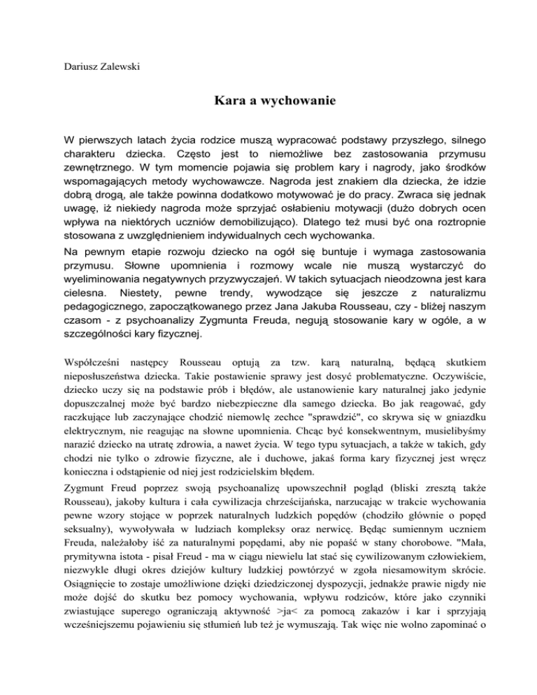 Dariusz Zalewski Kara a wychowanie W pierwszych latach życia rodzice muszą wypracować podstawy przyszłego, silnego charakteru dziecka. Często jest to niemożliwe bez zastosowania przymusu zewnętrznego. W tym momencie pojawia się problem kary i nagrody, jako środków wspomagających metody wychowawcze. Nagroda jest znakiem dla dziecka, że idzie dobrą drogą, ale także powinna dodatkowo motywować je do pracy. Zwraca się jednak uwagę, iż niekiedy nagroda może sprzyjać osłabieniu motywacji (dużo dobrych ocen wpływa na niektórych uczniów demobilizująco). Dlatego też musi być ona roztropnie stosowana z uwzględnieniem indywidualnych cech wychowanka. Na pewnym etapie rozwoju dziecko na ogół się buntuje i wymaga zastosowania przymusu. Słowne upomnienia i rozmowy wcale nie muszą wystarczyć do wyeliminowania negatywnych przyzwyczajeń. W takich sytuacjach nieodzowna jest kara cielesna. Niestety, pewne trendy, wywodzące się jeszcze z naturalizmu pedagogicznego, zapoczątkowanego przez Jana Jakuba Rousseau, czy - bliżej naszym czasom - z psychoanalizy Zygmunta Freuda, negują stosowanie kary w ogóle, a w szczególności kary fizycznej. Współcześni następcy Rousseau optują za tzw. karą naturalną, będącą skutkiem nieposłuszeństwa dziecka. Takie postawienie sprawy jest dosyć problematyczne. Oczywiście, dziecko uczy się na podstawie prób i błędów, ale ustanowienie kary naturalnej jako jedynie dopuszczalnej może być bardzo niebezpieczne dla samego dziecka. Bo jak reagować, gdy raczkujące lub zaczynające chodzić niemowlę zechce "sprawdzić", co skrywa się w gniazdku elektrycznym, nie reagując na słowne upomnienia. Chcąc być konsekwentnym, musielibyśmy narazić dziecko na utratę zdrowia, a nawet życia. W tego typu sytuacjach, a także w takich, gdy chodzi nie tylko o zdrowie fizyczne, ale i duchowe, jakaś forma kary fizycznej jest wręcz konieczna i odstąpienie od niej jest rodzicielskim błędem. Zygmunt Freud poprzez swoją psychoanalizę upowszechnił pogląd (bliski zresztą także Rousseau), jakoby kultura i cała cywilizacja chrześcijańska, narzucając w trakcie wychowania pewne wzory stojące w poprzek naturalnych ludzkich popędów (chodziło głównie o popęd seksualny), wywoływała w ludziach kompleksy oraz nerwicę. Będąc sumiennym uczniem Freuda, należałoby iść za naturalnymi popędami, aby nie popaść w stany chorobowe. "Mała, prymitywna istota - pisał Freud - ma w ciągu niewielu lat stać się cywilizowanym człowiekiem, niezwykle długi okres dziejów kultury ludzkiej powtórzyć w zgoła niesamowitym skrócie. Osiągnięcie to zostaje umożliwione dzięki dziedziczonej dyspozycji, jednakże prawie nigdy nie może dojść do skutku bez pomocy wychowania, wpływu rodziców, które jako czynniki zwiastujące superego ograniczają aktywność >ja< za pomocą zakazów i kar i sprzyjają wcześniejszemu pojawieniu się stłumień lub też je wymuszają. Tak więc nie wolno zapominać o Zalewski Kara a wychowanie.rtf 2 tym, że do uwarunkowań nerwicy zalicza się także wpływ kultury" (Zygmunt Freud, Poza zasadą przyjemności, Warszawa 1976, przekł. J. Prokopiuk, s. 194). Wychodząc z takich założeń, sama koncepcja kary, jako takiej, jest nie do przyjęcia, gdyż kary przyczyniają się do powstawania chorób nerwowych. W konsekwencji takie pomysły doprowadzą z czasem do całkowitego zanegowania potrzeby wychowania, co dzisiaj ujawnia się chociażby w ramach tzw. antypedagogiki. Jednakże konieczność stosowania kar, nie wyłączając kar cielesnych, jest oczywista. Ale żeby dojść do takich wniosków, trzeba trzymać się realistycznej koncepcji człowieka. Kara fizyczna była akceptowana powszechnie z chrześcijańskiego punktu widzenia: "(...) Był u nas zawsze zwyczaj - pisał ksiądz Chotkowski - że dzieciom kazano całować nie tylko rękę ojcowską, która ukarała, ale i rózgę, którą ukarane zostały. Rózga też wisiała w pokoju dziecięcym pod krzyżem, aby przypominała dwie rzeczy: rodzicom, żeby pomocy szukali do dobrego wychowania swych dzieci u Tego, który za nas dał się biczować i krzyżować, dzieciom ku nauce, że jak Pan Jezus dla naszych grzechów ponosił biczowanie, tak i rózga z ich serc grzechy pychy ma wykorzenić" (Ksiądz Władysław Chotkowski, O wychowaniu dzieci, Poznań 1881, s. 102). Warto cytować dzisiaj takie fragmenty, choćby po to, by uświadomić sobie, że kara fizyczna nie tyle godzi w tzw. prawa ucznia, co wyplenia wady, takie jak pycha czy lenistwo. Rodzicielskie prawo do kary fizycznej wynika bezpośrednio z prawa naturalnego. W społeczeństwie muszą istnieć instytucje i osoby dbające o ład i porządek, a w przypadkach, gdy nie ma innego wyjścia, odwołujące się nawet do kary fizycznej. Z prawa tego korzysta policja czy sądy. Podobna sytuacja występuje, gdy chodzi o relacje między uczniem i nauczycielem. Kara za wyrządzone zło nie ma jedynie wymiaru resocjalizującego, ale również oczyszczający. Wychowawca nie jest kimś, kto się mści za doznane szkody, ale kimś, kto dba o właściwe uformowanie charakteru wychowanka, a zatem stoi na straży porządku społecznego i naturalnego. Przy podejmowaniu decyzji o wymierzeniu kary fizycznej należy za o. J. Woronieckim pamiętać o ważnych wskazaniach co do jej wykonywania. Powinna ona być: a) wykonana jak najszybciej po wystąpieniu przewinienia, b) proporcjonalna do winy, c) nie może być orzekana w gniewie, d) dziecko powinno znać jej powód, e) nie może być karane zbyt często za drobiazgi, f) po jej wykonaniu nie należy wypominać dawnych przewinień (Ojciec Jacek Woroniecki, Katolicka etyka wychowawcza, t. II, Lublin 1986, s. 390-391). Ważne jest przy tym uwzględnienie temperamentu, wieku, wrażliwości dziecka i innych okoliczności. Karę należy stosować roztropnie i nie mieszać rozumnego karania z despotyzmem i "wyżywaniem" się na dziecku. Kierowanie się cnotą