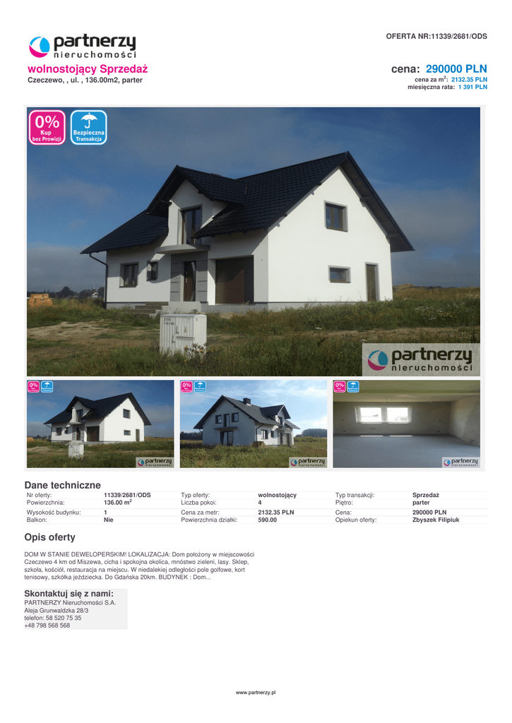 OFERTA NR:11339/2681/ODS wolnostojący Sprzedaż cena: 290000 PLN cena za m2: 2132.35 PLN miesięczna rata: 1 391 PLN Czeczewo, , ul. , 136.00m2, parter Dane techniczne Nr oferty: Powierzchnia: 11339/2681/ODS 136.00 m2 Typ oferty: Liczba pokoi: wolnostojący 4 Typ transakcji: Piętro: Sprzedaż parter Wysokość budynku: Balkon: 1 Nie Cena za metr: Powierzchnia działki: 2132.35 PLN 590.00 Cena: Opiekun oferty: 290000 PLN Zbyszek Filipiuk Opis oferty DOM W STANIE DEWELOPERSKIM! LOKALIZACJA: Dom położony w miejscowości Czeczewo 4 km od Miszewa, cicha i spokojna okolica, mnóstwo zieleni, lasy. Sklep, szkoła, kościół, restauracja na miejscu. W niedalekiej odległości pole golfowe, kort tenisowy, szkółka jeździecka. Do Gdańska 20km. BUDYNEK : Dom... Skontaktuj się z nami: PARTNERZY Nieruchomości S.A. Aleja Grunwaldzka 28/3 telefon: 58 520 75 35 +48 798 568 568 www.partnerzy.pl Powered by TCPDF (www.tcpdf.org)