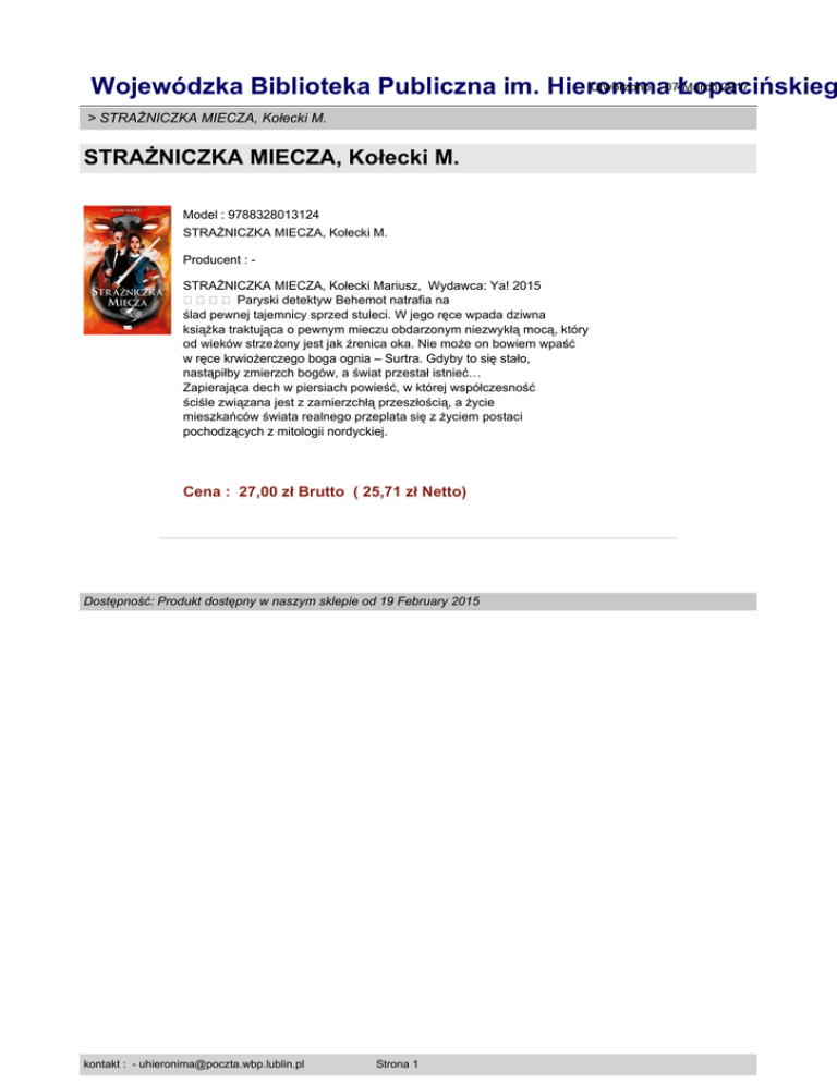 Utworzono : 07Łopacińskieg March 2017 Wojewódzka Biblioteka Publiczna im. Hieronima > STRAŻNICZKA MIECZA, Kołecki M. STRAŻNICZKA MIECZA, Kołecki M. Model : 9788328013124 STRAŻNICZKA MIECZA, Kołecki M. Producent : STRAŻNICZKA MIECZA, Kołecki Mariusz, Wydawca: Ya! 2015 ���� Paryski detektyw Behemot natrafia na ślad pewnej tajemnicy sprzed stuleci. W jego ręce wpada dziwna książka traktująca o pewnym mieczu obdarzonym niezwykłą mocą, który od wieków strzeżony jest jak źrenica oka. Nie może on bowiem wpaść w ręce krwiożerczego boga ognia – Surtra. Gdyby to się stało, nastąpiłby zmierzch bogów, a świat przestał istnieć… Zapierająca dech w piersiach powieść, w której współczesność ściśle związana jest z zamierzchłą przeszłością, a życie mieszkańców świata realnego przeplata się z życiem postaci pochodzących z mitologii nordyckiej. Cena : 27,00 zł Brutto ( 25,71 zł Netto) Dostępność: Produkt dostępny w naszym sklepie od 19 February 2015 kontakt : - [email protected] Strona 1
