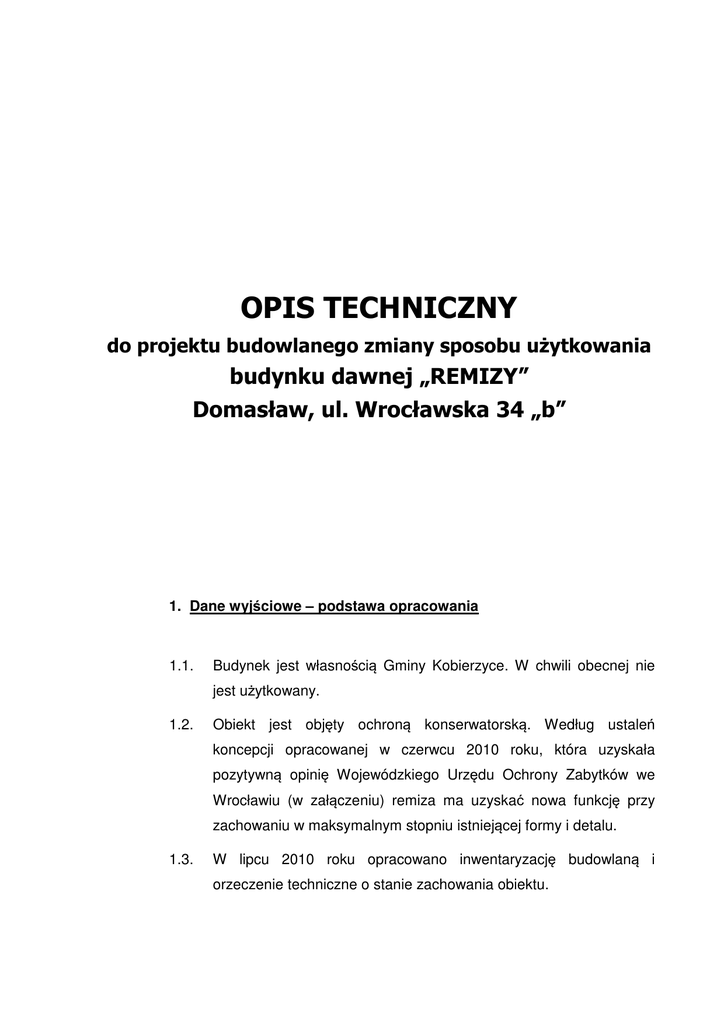 OPIS TECHNICZNY do projektu budowlanego zmiany sposobu użytkowania budynku dawnej „REMIZY” Domasław, ul. Wrocławska 34 „b” 1. Dane wyjściowe – podstawa opracowania 1.1. Budynek jest własnością Gminy Kobierzyce. W chwili obecnej nie jest użytkowany. 1.2. Obiekt jest objęty ochroną konserwatorską. Według ustaleń koncepcji opracowanej w czerwcu 2010 roku, która uzyskała pozytywną opinię Wojewódzkiego Urzędu Ochrony Zabytków we Wrocławiu (w załączeniu) remiza ma uzyskać nowa funkcję przy zachowaniu w maksymalnym stopniu istniejącej formy i detalu. 1.3. W lipcu 2010 roku opracowano inwentaryzację budowlaną i orzeczenie techniczne o stanie zachowania obiektu. 2. Usytuowanie Budynek użytkowany pierwotnie jako remiza strażacka usytuowany jest przy północnej części muru przykościelnego i bezpośrednio do niego przylega. Obiekt zwrócony jest bramami wjazdowymi i drzwiami w kierunku drogi bocznej (strona północna), jest skomunikowany z niewielką zatoką parkingową, co ułatwia wjazd. Teren bezpośrednio przy budynku nie jest utwardzony, ukształtowany jest z naturalnym, niewielkim spadkiem w kierunku północnym. Przy budynku znajduje się maszt stalowy wysokości około 12 m z umieszczoną na nim syreną alarmową. Ulica Wrocławska przebiegająca obok posiada pełne uzbrojenie, droga żwirowa prowadząca do zespołu sportowego i na zaplecze kościoła jest uzbrojona w sieć elektroenergetyczną, wodę i kanalizację sanitarną. 3. Opis budynku Budynek jednokondygnacyjny, konstrukcji ceglanej z trzema bramami ma charakterystyczny, ciekawy detal – fryz ceglany przebiegający pod gzymsem na całym obwodzie. Łukowe nadproża bram również są wykończone reliefem ceglanym. Budynek był pierwotnie tynkowany. Obecnie pozostały ślady tynku na elewacji bocznej i pilastrach. Dach płaski konstrukcji drewnianej podpartej słupem z szyny kolejowej, ma spadek w kierunku terenu przykościelnego. Rynna i rura spustowa znajdują się od strony południowej, odprowadzenie wody na teren działki kościoła ma charakter tymczasowy i przy pracach remontowych będzie zmienione. Budynek w chwili obecnej jest tymczasowo wykorzystywany skład jako sprzętu terenowego oraz materiałów budowlanych i narzędzi związanych z pracami porządkowymi w pobliskim parku. 4. Zasilanie budynku; uzbrojenie terenu przyległego Obiekt ma zasilanie w energię elektryczną doprowadzone linią napowietrzną. Ulica Wrocławska i droga boczna, przy której jest usytuowany budynek są uzbrojone. Przewiduje się doprowadzenie wody i kanalizacji, zmianę zasilania elektroenergetycznego oraz odwodnienie i ukształtowanie terenu przyległego. 5. Uwarunkowania – wybór funkcji Budynek jest niewielki (66,5 m² - p.u.) usytuowany przy głównej trasie przebiegającej przez Domasław, w eksponowanym miejscu. Nie posiada wydzielonej działki. Na zapleczu kościoła, od strony ulicy Kwiatowej zlokalizowany jest zespół boisk i terenów sportowych, a ostatnio oddano do użytku park rekreacyjny bogato zagospodarowany zielenią. Cały ten zespół nie posiada węzła sanitarnego, nie ma również pomieszczenia, gdzie można by schronić się przed deszczem, napić kawy, poczekać na zakończenie gier i zawodów (dla mniej zainteresowanych). Teren przykościelny nie ma również węzła sanitarnego. Powyższe narzuciło funkcję budynku. Zaprojektowano ogólnodostępny węzeł sanitarny z uwzględnieniem niepełnosprawnych, salę wystawową z możliwością okazjonalnej konsumpcji (w naczyniach jednorazowych) albo sklep – cukiernię z konsumpcją, sklep z pamiątkami – dewocjonaliami lub niewielką izbę pamięci ze zmienną okresowo ekspozycją. 6. Ocena zgodności projektu i urządzenia działki z ustaleniami miejscowego planu zagospodarowania terenu. Rada Gminy Kobierzyce uchwałą nr XXI/261/03 z dnia 30 grudnia 2003 roku zatwierdziła plan zagospodarowania przestrzennego wsi DOMASŁAW gm. Kobierzyce. Obszar objęty opracowaniem tj działki: 171/5; 171/4; 171/21; 171/23 oraz części działki 216/1 leżą na terenie oznaczonym w planie symbolem UP-5 (usługi publiczne z zakresu kultu religijnego oraz zabudowa i urządzenia uzupełniające). Teren znajduje się w strefie „A: szczególnej ochrony konserwatorskiej oraz w strefie „OW” obserwacji archeologicznej. Wszystkie prace konserwacyjne, budowlane, urządzenia i uzbrojenia terenu nie naruszają istniejącego układu przestrzennego. Rodzaj robót, zastosowane materiały, rozwiązania funkcjonalne były konsultowane i zostaną przedłożone do akceptacji właściwemu organowi Służby Ochrony Zabytków. 7. Zakres zmian 7.1. Zmiany zewnętrzne. Budynek nie zmienił swojej wielkości i powierzchni użytkowej. Zasadnicza zmianą zewnętrzną jest uzupełnienie attyki, tak aby obiegała wokół budynku, bez jej podwyższania. Zaprojektowano nowe opierzenia z blachy miedzianej. Przewidziano wykonanie wejścia do kawiarni od strony zachodniej – od ulicy Wrocławskiej, wykorzystując istniejący otwór okienny. Drugie wejście (w elewacji wschodniej) prowadzi do zespołu sanitarnego. Przewidziano daszki osłaniające oraz dojścia – pochylnie dla niepełnosprawnych. 7.2. Remont elewacji Ze względu na zalecenie konserwatorskie aby nie zmieniać charakteru elewacji zachowano i podkreślono jej detal. W miejsce dużych istniejących bram do remizy zostaną wmontowane drewniane okna dopasowane do gabarytem, w części wschodniej, przy sanitariatach częściowo zablendowane od dołu ze względu na funkcję. Zastosowano również drzwi drewniane w tym samym ciemnobrązowym kolorze. Istniejący ceglany fryz przebiegający os strony północnej i zachodniej będzie odczyszczony i wyspoinowany. W elewacji wschodniej należy go odtworzyć. Płaszczyzny ceglane – przy oknach, na cokole i w elewacjach bocznych należy również zabezpieczyć i wyspoinować. Wszystkie prace należy wykonać ze szczególną starannością, zlecić wyspecjalizowa