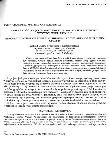 ROCZN. PZH, 1999, 50, N R 3, 253-259 JERZY FALAND YSZ, JUSTYNA HAŁACZK1EW ICZ Z A W A R T O Ś Ć R T Ę C I W G R Z Y B A C H JA D A L N Y C H N A T E R E N IE W Y Ż Y N Y W IELU Ń SK IEJ* M ERCURY CO N TEN T O F ED IBLE M USHROOM S A T TH E A R E A O F W IELUŃSKA UPLAND Zakład Chemii Środowiska i Ekotoksykologii Wydział Chemii, Uniwersytet Gdański 80-952 Gdańsk, ul. Sobieskiego 18 Kierownik: prof. dr hab. J. Falandysz Oznaczono zawartość rtęci ogółem w takich gatunkach grzybów jak: podgrzy bek zajączek, koźlarz babka, maślak zwyczajny, maślak żółty, gąska ziemista, czubajka kania, pieczarka połowa, lejkówka wonna, twardzioszek przydrożny i gołąbek gryszpanowy, zebranych w okolicy Pajęczna (woj. częstochowskie) w latach 1995-96. Przedstawiono dostępne dane z piśmiennictwa o zawartości rtęci w koźlarzu babce, maślaku zwyczajnym, maślaku żółtym, maślaku pstrym, maś laku sitarzu i czubajce kani z terenu kraju. R tęć jest jednym z tych pierwiastków metalicznych, które m ogą być nagrom adzane w dużym stężeniu w ow ocnikach szeregu gatunków grzybów, a szczególnie dużą zaw ar tością tego m etalu cechują się niektóre gatunki z rodzaju pieczarka (Agaricus) i b o ro wik (Boletus) [1, 6]. P onadto, bardzo duża zawartość rtęci charakteryzuje wiele ga tunków grzybów zebranych na stanowiskach w pobliżu punktowych źródeł zanieczy szczenia środow iska naturalnego tym m etalem - wielkość współczynnika biokoncentracji (BCF) sięga do 500. N iem niej, jak dotąd, brak jest przekonywujących danych, które potwierdzały by hipotezę, że owocniki grzybów wyższych m ożna uważać za dobre bioindykatory (fitoindykatory) stopnia zanieczyszczenia środowiska tym m etalem . C elem p racy je st p rze d staw ie n ie w yników b a d a ń sto p n ia sk ażen ia rtę c ią grzybów jad aln y ch z te re n u woj. częstochow skiego. M ATERIAŁ I M ETODYKA Grzyby zebrano w lasach i na łąkach w okolicy miasta Pajęczno (woj. częstochowskie) we wschodniej części Wyżyny Wieluńskiej, na pograniczu podprowincji geomorficznej Wyżyny Krakowsko-Częstochowsko-Wieluńskiej z podprowincją Nizin Środkowoeuropejskich. Badany obszar zajmują głównie bory sosnowe suche, w przeważającej części pokrywające porzucone, wyjałowione pola uprawne. W niedalekm sąsiedztwie od badanego obszaru znajdują się dwa * badania finansowane przez KBN ((DS 8250-4-0092-8). 254 J. Falandysz, J. Hałaczkiewicz Nr 3 punktowe źródła zanieczyszczeń - Cementownia „W arta” w Działoszynie oraz Elektrociepłownia „Bełchatów”. Sposób przygotowania próbek do analizy oraz metodykę oznaczania rtęci ogółem z pomiarem I końcowym techniką zimnych par bezpłomieniowej absorpcyjnej spektroskopii atomowej dokła dnie opisano we wcześniejszych pracach [1-4]. Nazwy gatunkowe grzybów w języku polskim i łacińskim, przynależność do określonych rodzin oraz wyróżnienie poszczególnych gatunków jako jadalnych - pomimo istniejących rozbieżności w materiałach źródłowych, przyjęto za cyto wanym piśmiennictwem [7, 8, 11]. WYNIKI I ICH OM ÓW IENIE Wyniki oznaczeń zawartości rtęci w kapeluszach i trzonach zbadanych grzybów zestaw iono w tabeli I, a dostępne z piśm iennictwa dane dotyczące zawartości tego m etalu w koźlarzu babce, m aślakach - zwyczajnym, żółtym, pstrym i sitarzu oraz czubajce kani w Polsce, Słowacji i Czechach zestaw iono w tabeli II. Z aw artość rtęci w kapeluszach poszczególnych gatunków i okazów grzybów we wszystkich przypadkach była większa niż w trzonach. Poza maślakiem zwyczajnym rtęć w stężeniu powyżej 500 ng/g suchej masy wykrywano w kapeluszach od kilku do wszystkich okazów pozostałych gatunków grzybów, a wielkość średnią przekraczajacą tę w artość odnotow ano u czubajki kani, pieczarki polowej i lejkówki wonnej (tab. I). Szczególnie dużym skażeniem rtęcią charakteryzow ały się owocniki czubajki kani i pieczarki polowej - do 10000 ng/g s.m. w kapeluszach i do 7200 ng/g s.m. w trzonach. W ielkości stężenia rtęci wykrywane w owocnikach koźlarza babki na obszarze Wy żyny W ieluńskiej mieszczą się w zakresie wielkości wykrywanych u tego gatunku na terenie gmin Kościerzyna i G ubin, a mniejszym skażeniem cechowały się koźlarze z terenu M ierzei W iślanej (tab. II). Ponadto, wielkości stężenia rtęci wykazane tak w owocnikach koźlarza babki jak i m aślaka zwyczajnego, m aślaka żółtego oraz czubajki kani z teren u Wyżyny W ieluńskiej korespondują z wartościam i odnotow anym i w owoc nikach tych gatunków grzybów zebranych na „nieskażonych” obszarach w Czechach, a także na obszarach, które należy uznać za nieskażone rtęcią w Polsce. Wszystkie wym ienione gatunki grzybów kiedy pochodzą z obszarów skażonych rtęcią to cechuje je bardzo duża zaw artość tego m etalu w owocnikach - u czubajki kani sięgająca nawet do 200000 ng/g s.m. (tab. II). B adając współzależności pomiędzy stężeniem rtęci w kapeluszach i trzonach czubaj ki kani a zaw artością tego m etalu w substracie (37-93 ng Hg/g s.m.) na którym wyrosły grzyby wykazano duże zdolności bioindykacyjne tego gatunku [1]. Z atem , wnioskując na podstaw ie wykazanych wielkości stężenia rtęci w owocnikach czubajki kani z terenu Wyżyny W ieluńskiej m ożna zasugerować, że obszar ten, tak jak i teren gminy Gubin, na przykład w porów naniu z obszarem M ierzei W iślanej, cechuje pow iększona zaw ar tość tego m etalu w tle geochemicznym. Owocniki koźlarza babki zebrane w sąsiedztwie punktowych źródeł zanieczyszczenia środowiska pierw iastkam i metalicznymi w okolicy hut miedzi i rtęci na Słowacji cecho wało bardzo duże skażenie rtęcią, tj. odpow iednio, do 6800 i 20000 ng/g s.m. (tab. II). Z porów nania wielkości stężeń rtęci w owocnikach koźlarza babki pochodzących z te renów „nieskażonych” oraz zebranych w sąsiedztwie punktowyc