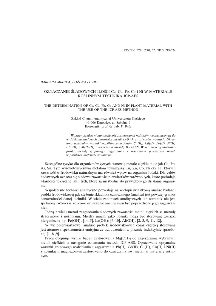 ROCZN. PZH, 2001, 52, NR 3, 219–224 BARBARA MIKUŁA, BOŻENA PUZIO OZNACZANIE ŚLADOWYCH ILOŚCI Cu, Cd, Pb, Co i Ni W MATERIALE ROŚLINNYM TECHNIKĄ ICP-AES THE DETERMINATION OF Cu, Cd, Pb, Co AND Ni IN PLANT MATERIAL WITH THE USE OF THE ICP-AES METHOD Zakład Chemii Analitycznej Uniwersytetu Śląskiego 40–006 Katowice, ul. Szkolna 9 Kierownik: prof. dr hab. F. Buhl W pracy przedstawiono możliwość zastosowania nośników nieorganicznych do wydzielania śladowych zawartości metali ciężkich z roztworów wodnych. Określono optymalne warunki współstrącania jonów Cu(II), Cd(II), Pb(II), Ni(II) i Co(II) z Mg(OH)2 i oznaczania metodą ICP-AES. W rezultacie opracowano prostą metodę grupowego zagęszczania i oznaczania powyższych metali w próbkach materiału roślinnego. Szczególne ryzyko dla organizmów żywych stanowią metale ciężkie takie jak Cd, Pb, As, Sn. Tym wysokotoksycznym metalom towarzyszą Cu, Zn, Co, Ni czy Fe, których zawartość w środowisku naturalnym ma również wpływ na organizm ludzki. Dla celów badawczych oznacza się śladowe zawartości pierwiastków zarówno tych, które posiadają własności toksyczne jak i tych, które są niezbędne do prawidłowego działania organizmu. Współczesne techniki analityczne pozwalają na wielopierwiastkową analizę badanej próbki środowiskowej gdy stężenie składnika oznaczanego (analitu) jest powyżej granicy oznaczalności danej techniki. W wielu zadaniach analitycznych ten warunek nie jest spełniony. Wówczas końcowe oznaczenie analitu musi być poprzedzone jego zagęszczaniem. Jedną z wielu metod zagęszczania śladowych zawartości metali ciężkich są metody strąceniowe z nośnikami. Między innymi jako nośniki mogą być stosowane związki nierganiczne np. Fe(OH)3 [14, 5], La(OH)3 [6–10], Al(OH)3 [2, 3, 9, 11, 12]. W wielopierwiastkowej analizie próbek środowiskowych coraz częściej stosowana jest atomowa spektrometria emisyjna ze wzbudzeniem w plazmie indukcyjnie sprzężonej [1, 8 ,9]. Praca obejmuje wyniki badań zastosowania Mg(OH)2 do zagęszczania wybranych metali ciężkich, a następnie oznaczania metodą ICP-AES. Opracowane optymalne warunki grupowego wydzielania i zagęszczania Pb(II), Cd(II), Cu(II), Co(II) i Ni(II) z nośnikiem magnezowym zastosowano do oznaczania ww. metali w materiale roślinnym. 220 B. Mikuła, B. Puzio Nr 3 MATERIAŁ I METODYKA Odczynniki Roztwory wzorcowe Cd, Cu, Pb, Co i Ni zawierające 1 mg/cm3 – Wzormat; roztwór magnezu zawierający 1 g/dm3 otrzymany z MgCl2 • 6H2O cz.d.a. (POCh); roztwór wodorotlenku sodu o stężeniu 0.1 mol/dm3; bufor boranowy o pH 11,0 otrzymany przez zmieszanie 0,1 mol/dm3 NaOH i 0,05 mol/dm3 Na2B4O7 w stosunku 50:50; kwas chlorowodorowy (d=1,18 g/cm3) cz.d.a.; kwas chlorowy (VII) (d=1,65 g/cm3) cz.d.a.; kwas azotowy (V) (d=1,4 g/cm3) cz.d.a.; woda utleniona 30%; Aparatura Spectroflame – ICP Model M (Spectro Analitical Instruments); mineralizator M-9 (WSL – Bytom); wysokoobrotowy młynek wirnikowy „pulverisette 14” (FRISCH). Parametry pracy Spectroflame – ICP Model M Moc 1,1 kW; częstotliwość 27,12 MHz; wysokość obserwacji 11 mm; zakres monochromatora 165 – 460 nm; siatka holograficzna 2400 rys m-1; dyspersja siatki 0,55 nm mm-1; nebulizer koncentryczny typu Meinhard – 2,4 bara; komora mgielna szklana wg Scotta; gaz zewnętrzny – 14,0 l min-1; gaz wewnętrzny – 0,5 l min-1; ilość dozowanej próbki 1 cm3 min-1; czas integracji 3 s. Badania wstępne Wyznaczono optymalne parametry procesu wydzielania i zagęszczania: pH, ilość nośnika, czas mieszania oraz sposób rozpuszczania uzyskanego osadu stosując wodne modelowe roztwory o zawartości metali 5 µg. Zawartość analitu w otrzymanych próbkach po zagęszczaniu oznaczono techniką ICP-AES, korzystając z programu równoczesnego oznaczania Pb(II), Cd(II), Cu(II), Co(II) i Ni(II). Wpływ matrycy uwzględniono stosując odpowiednio przygotowane wzorce korekcyjne zawierające określone składniki matrycy (HCl, Mg(II)). Na podstawie otrzymanych wyników obliczono efektywność zagęszczania jako procentowy odzysk. Dobrane warunki równoczesnego współstrącania Pb(II), Cd(II), Cu(II), Co(II) i Ni(II) z nośnikiem Mg(OH)2 zastosowano do oznaczania tych metali w materiale roślinnym po mineralizacji. Przepis analityczny Przygotowanie próbek. Z próbki materiału roślinnego wysuszonego do powietrznie suchej masy (p.s.m.) o średnicy ziarna 1 mm, rozdrobnionego w wysokoobrotowym młynku wirnikowym „pulverisette 14”, odważono 1 g i mineralizowano 10 cm3 mieszany HNO3 : HClO4 (3:1) w temp. 200oC w mineralizatorze typu M-9. Po odparowaniu próbki do małej objętości dodawano po 1 cm3 perhydrolu aż do całkowitego rozkładu matrycy organicznej. Następnie po ostudzeniu mineralizat rozcieńczano do objętości 50 cm3. Wydzielanie i oznaczanie Cd, Cu, Pb, Co i Ni. Otrzymane próbki po mineralizacji zobojętniano, dodawano 2 cm3 roztworu chlorku magnezu o stężeniu 1 mg Mg/cm3 i doprowadzano pH roztworu do wartości 11,0 za pomocą roztworu NaOH o stężeniu 1 mol/dm3. W celu utrzymania stałego pH roztworu dodawano 10 cm3 buforu boranowego o pH 11,0. Następnie próbki ogrzewano w łaźni wodnej przez 20 minut w temperaturze 70oC. Po ostudzeniu wytrącone osady sączono na sączku bibułowym twardym i rozpuszczano w 10 cm3 HCl o stężeniu 2 mol/dm3. Nr 3 221 Oznaczanie metali techniką ICP-AES W otrzymanym roztworze oznaczano zawartość Cd, Cu, Pb, Co i Ni techniką ICP-AES korzystając z programu równoczesnego oznaczania tych metali stosując wzorce korekcyjne zawierające matrycę (Mg(II), HCl). OMÓWIENIE WYNIKÓW Na drodze eksperymentu ustalono że jony magnezu i kwas solny w nieznacznym stopniu wpływają na równoczesne oznaczanie Cd(II), Cu(II), Pb(II), Co(II) i Ni(II) techniką ICP-AES. Modelowe krzywe wzorcowe zawierające matrycę mają przebieg prostoliniowy w stosowanym zakresie stężeń 0,1–2,0 ppm dla Cd(II), Cu(II), Co(II) i N