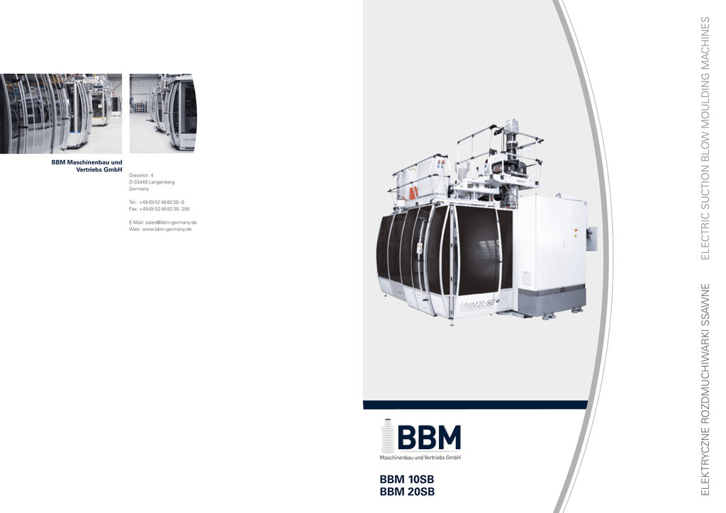ELECTRIC SUCTION BLOW MOULDING MACHINES Dieselstr. 4 D-33449 Langenberg Germany Tel.: +49 (0) 52 48 82 38 - 0 Fax: +49 (0) 52 48 82 38 - 295 E-Mail: [email protected] Web: www.bbm-germany.de BBM 10SB BBM 20SB ELEKTRYCZNE ROZDMUCHIWARKI SSAWNE BBM Maschinenbau und Vertriebs GmbH ROZDMUCHIWARKI SSAWNE BBM GŁÓWNE CECHY BBM SUCTION BLOW MACHINES MAIN FEATURES DANE TECHNICZNE - ROZDMUCHIWARKI SSAWNE TECHNICAL DATA - SUCTION BLOW MACHINES · Nieruchoma jednostka zamykania z głowicą akumulacyjną i suwakiem dyszy · Clamping unit with accumulator head and die slider system TYP ROZDMUCHIWARKI / BLOW MOULDER TYPE · Stabilna jednostka zamykania z solidnymi prowadnicami liniowymi i napędem elektrycznym · Sturdy clamping unit with solid tiebars and electric drive system Siła zwarcia / clamping force · Regulacja dostosowana do wysokości formy · Mould thickness adjustment JEDNOSTKA ZAMYKANIA / CLAMPING UNIT · Oszczędność energii na poziomie ok. 50% w porównaniu do maszyn hydraulicznych · Approx. 50% energy saving compared to hydraulic machines · Elektrycznie regulowane ruchy dla formy i suwaka dyszy · Fully electric controlled movements for mould and die-slider system · Low maintenance cost (no oil, filters, leakages) · Niewielki poziom hałasu i wysoka czystość produkcji · Low noise level and „clean“ · Oszczędność miejsca dzięki specjalnej budowie · Space saving due to special design · Łatwo dostępny obszar roboczy i serwisowy z dużymi drzwiami ochronnymi · Easy access to the production and maintenance area with large safety gates · Wysokowydajna wytłaczarka RHF o wysokim współczynniku L/D do przetwarzania tworzyw technicznych · RHF high-output extruders with a high L/D-ratio for technical raw materials · Wysokowydajne głowice akumulacyjne firmy BBM · BBM high performance accumulator heads · Układ sterowania BBM / Beckhoff „BlowControl“ z ekranem dotykowym · BBM / Beckhoff „BlowControl“ system with Touch Screen · Zdalne sterowanie przez Internet na potrzeby serwisowe · Remote control for tele-service via Internet · Proporcjonalne sterowanie profilowanym powietrzem rozdmuchującym i podpierającym · Proportional control for profiled blow and support air · Pomiar siły zwarcia i jej regulacja bezpośrednio na panelu sterowania · Opcje: odbiór za pomocą robota, stacja wykrawania, chłodzenie dodatkowe, obróbka dodatkowa, tester szczelności, dodatkowy układ hydrauliczny, wózek do wymiany formy 10SB 20SB [kN] 40 200 A max. [mm] 700 1300 / 900 B max. [mm] 500 640 / 1100 C [mm] 2 x 320 2 x 415 D [mm] 800 700 P P P RHF 50 / 30 42 15 x 110 100 RHF 60 / 30 54 21 x 140 120 MOŻLIWOŚCI PRODUKCYJNE / PRODUCTION POSSIBILITIES Detale techniczne / technical parts Detale wytwarzane metodą ssawno-rozdmuchową / suction blown parts WYTŁACZARKI / EXTRUDERS Typ / type [L/D] [kW] Moc napędu / screw rating Moc grzewcza / heating power [kW] Napęd bezpośredni / direct-drive Rodzaj napędu / drive system [kg/h] Wydajność / output** TPE (max.) Wydajność ** PA6 + 25% włókna szklanego / [kg/h] output** PA6 + 25% GF (max.) · Clamping force measurement and adjustment direct on the operator panel ** Wskaźniki / guiding value GŁOWICE WYTŁACZARKI / EXTRUSION HEADS · Optional: robot take out, punching station, post cooling, post processing, leaktest, additional hyraulic system, mould change trolley Głowice pojedyncze / wielokrotne / wielowarstwowe / akumulacyjne własnej produkcji lub wiodących producentów głowic wytłaczarek. Głowice akumulacyjne (pojemność 1-12 litrów) z serwonapędem pompy do sterowania wyrzutem materiału i grubością ścianki (hybryda) single- / multi-parison- / multi-layer- / accu-heads made by BBM or renowned manufacturers of extrusion heads accumulator heads with hybrid servomotor controlled pump system for pushout and wall thickness, 1 - 12 litre volume DANE DOTYCZĄCE ENERGII / ENERGY CONSUMPTION Moc przyłączeniowa / connected load Średnie zużycie energii / average consumption Ciśnienie powietrza zasilającego / air requirement Chłodzenie / Strefa zasypu i forma / cooling extruder feeding zone and mould Układ hydrauliczny / hydraulics 1 A 2 3 4 5 6 7 8 9 10 11 13 12 14 15 16 17 18 19 Zależnie od konfiguracji / depending on configuration Zależnie od konfiguracji / depending on configuration 6 ... 12 bar ~ 500 kJ / kg (TPE) – (wyposażenie specjalne) / – (on special request only) 20 21 22 23 24 WYMIARY I MASA / DIMENSIONS AND WEIGHTS A B B A A TYP / TYPE BBM 10SB 20SB A [mm] 4600 6000 [mm] 3000 3300 [mm] 4300 5000 [t] 16 20 C C D B F J F G G H D H H Masa / weight J K K L L M E E B · Znikome koszty serwisowania (brak oleju, filtrów, wycieków) · Hybrid servo pump system for material pushout and wall thickness control B · Hybrydowe sterowanie pompy dla wyrzutu materiału oraz sterowania grubością ścianki Długość formy / mould length Szerokość formy / mould width Głębokość formy / mould depth Droga otwierania / opening stroke BBM M Wszystkie dane są orientacyjne i niewiążące. Nie ponosimy odpowiedzialności za ewentualne błędy. Zastrzegamy sobie możliwość wprowadzenia zmian. / All data is for information and guidance purposes only. Errors and omissions excepted. N N P P